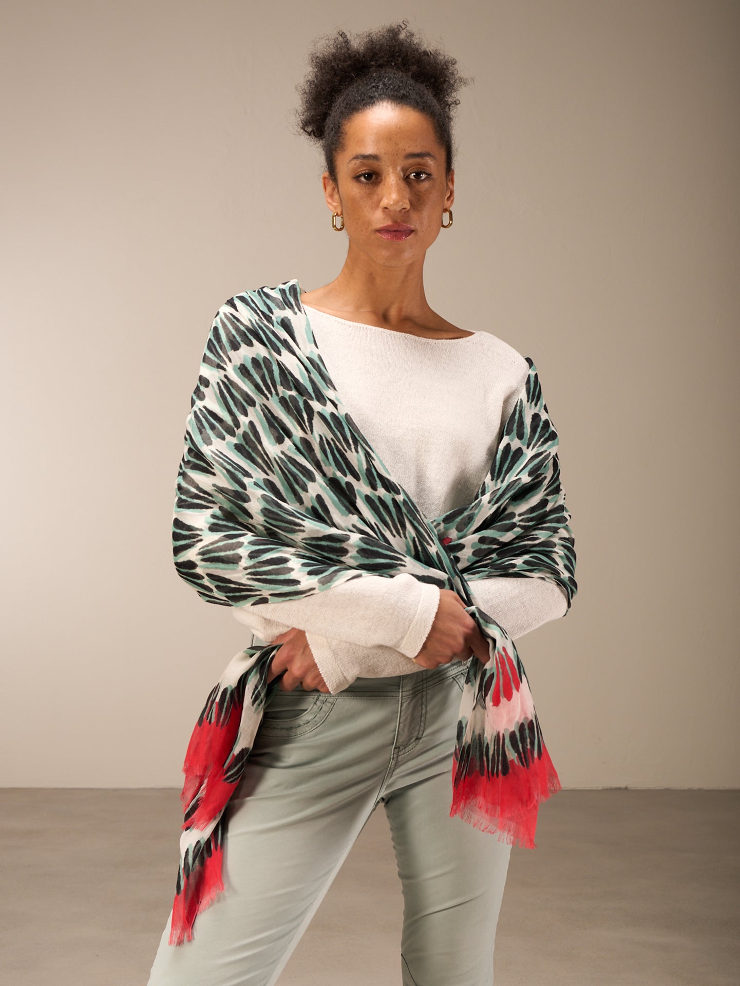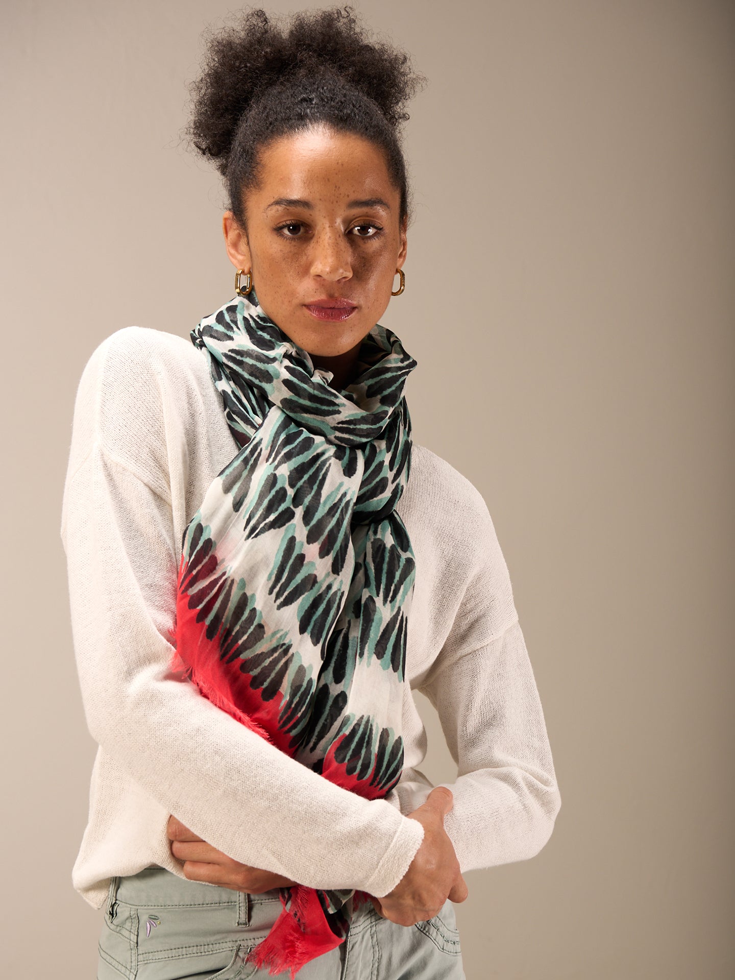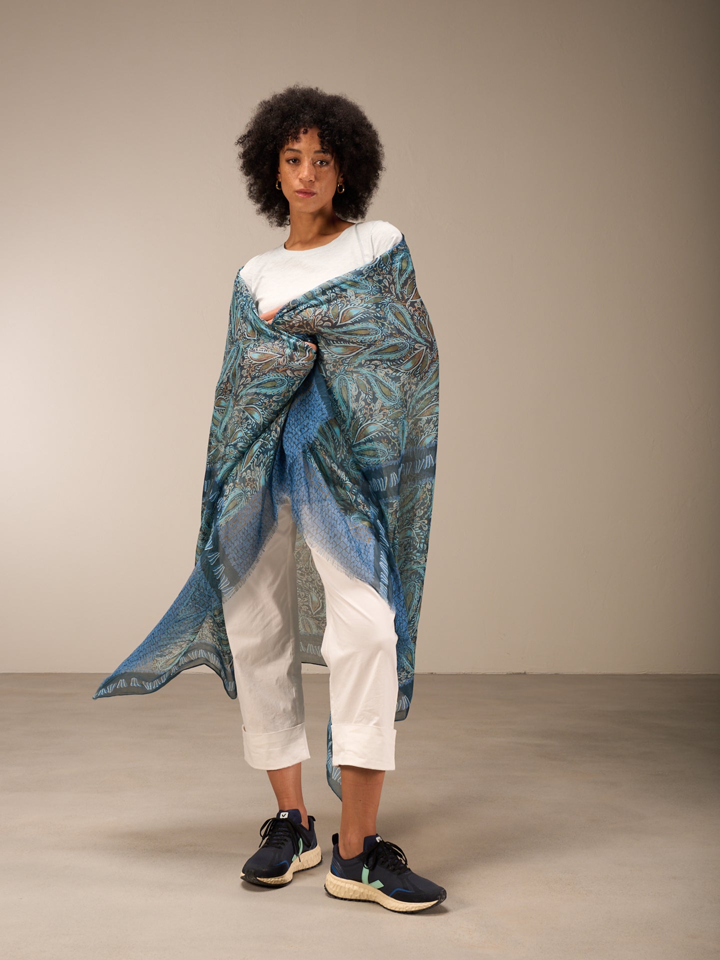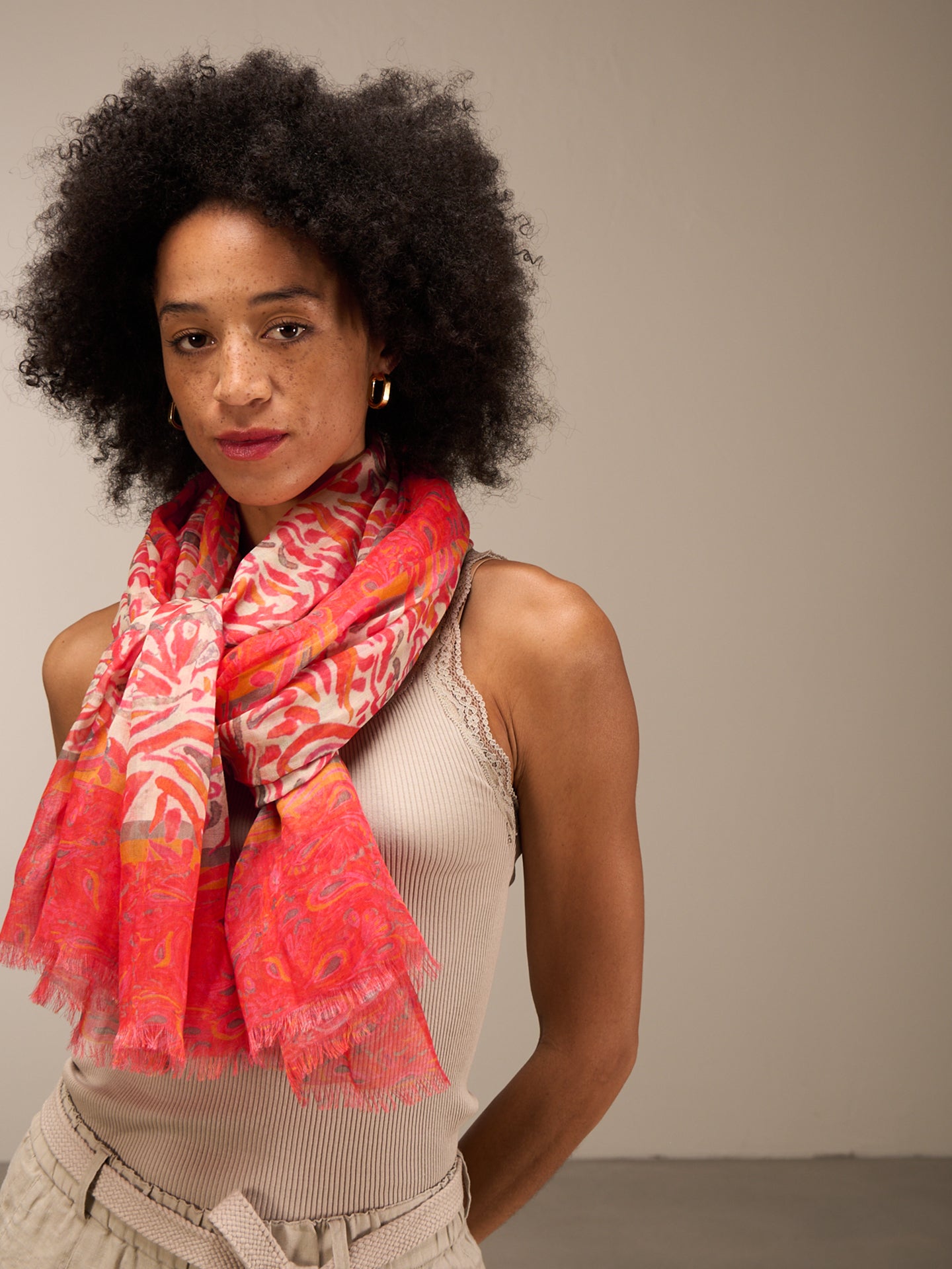 The large 120x200cm size is perfect for varied styling. Casually draped around the neck and shoulders, this scarf will instantly enhance any outfit and become a favourite accessory. The scarf is printed all over with hand-drawn prints and has shorter edges with fringes. 100% organic cotton from certified cultivation.