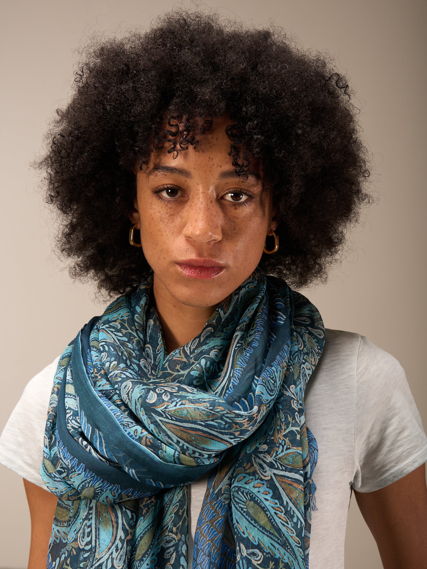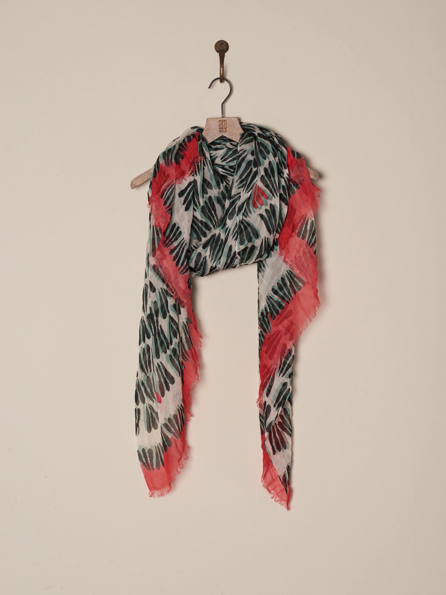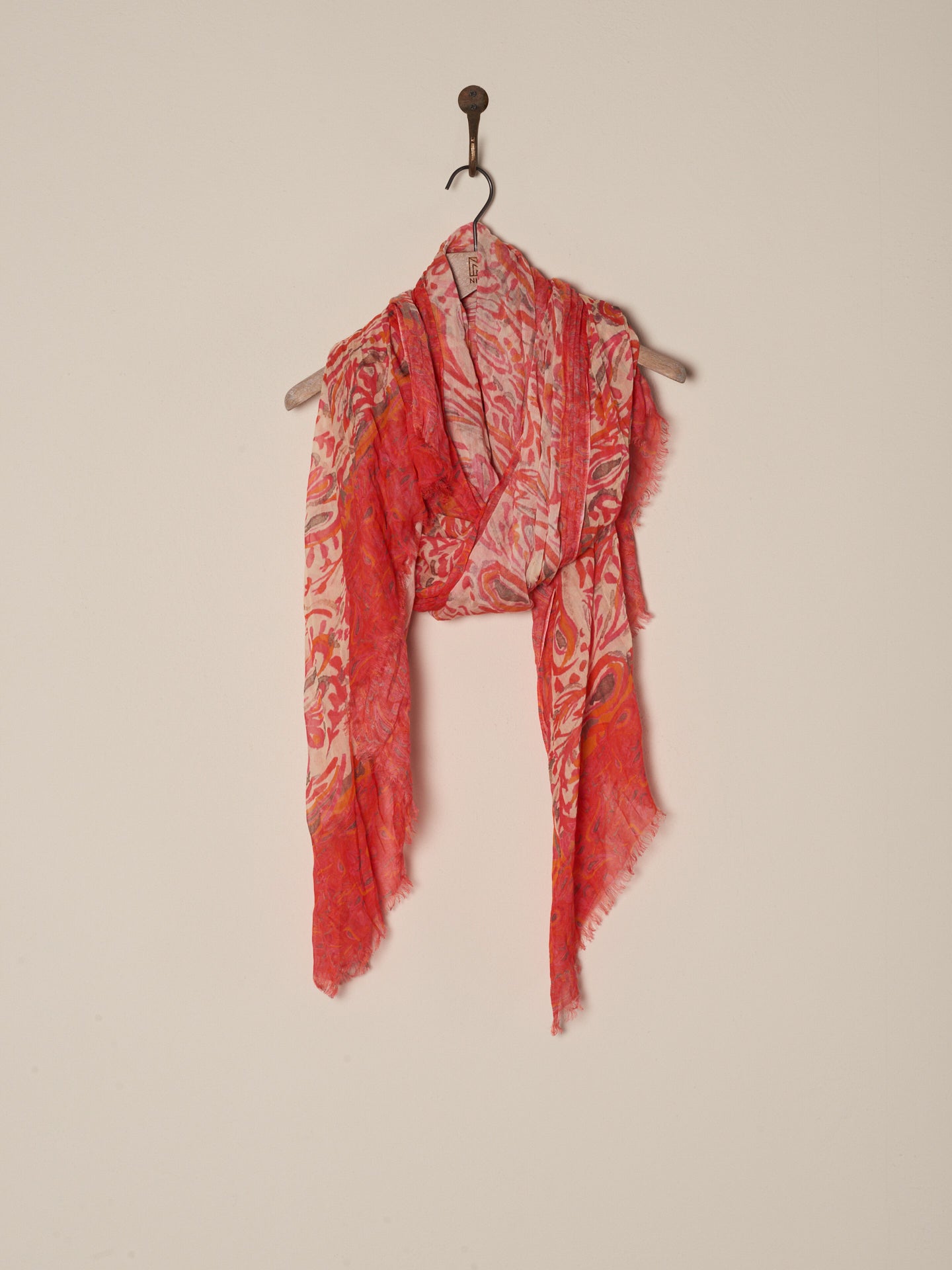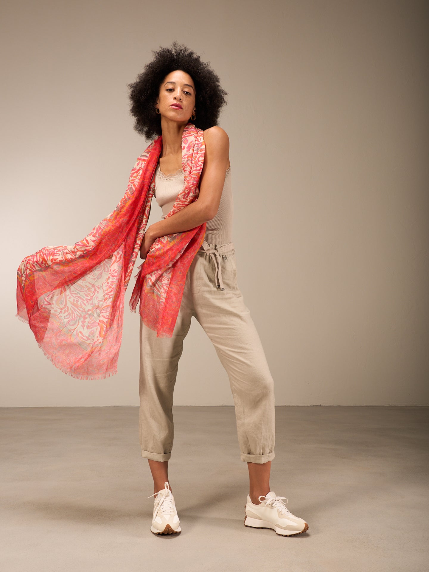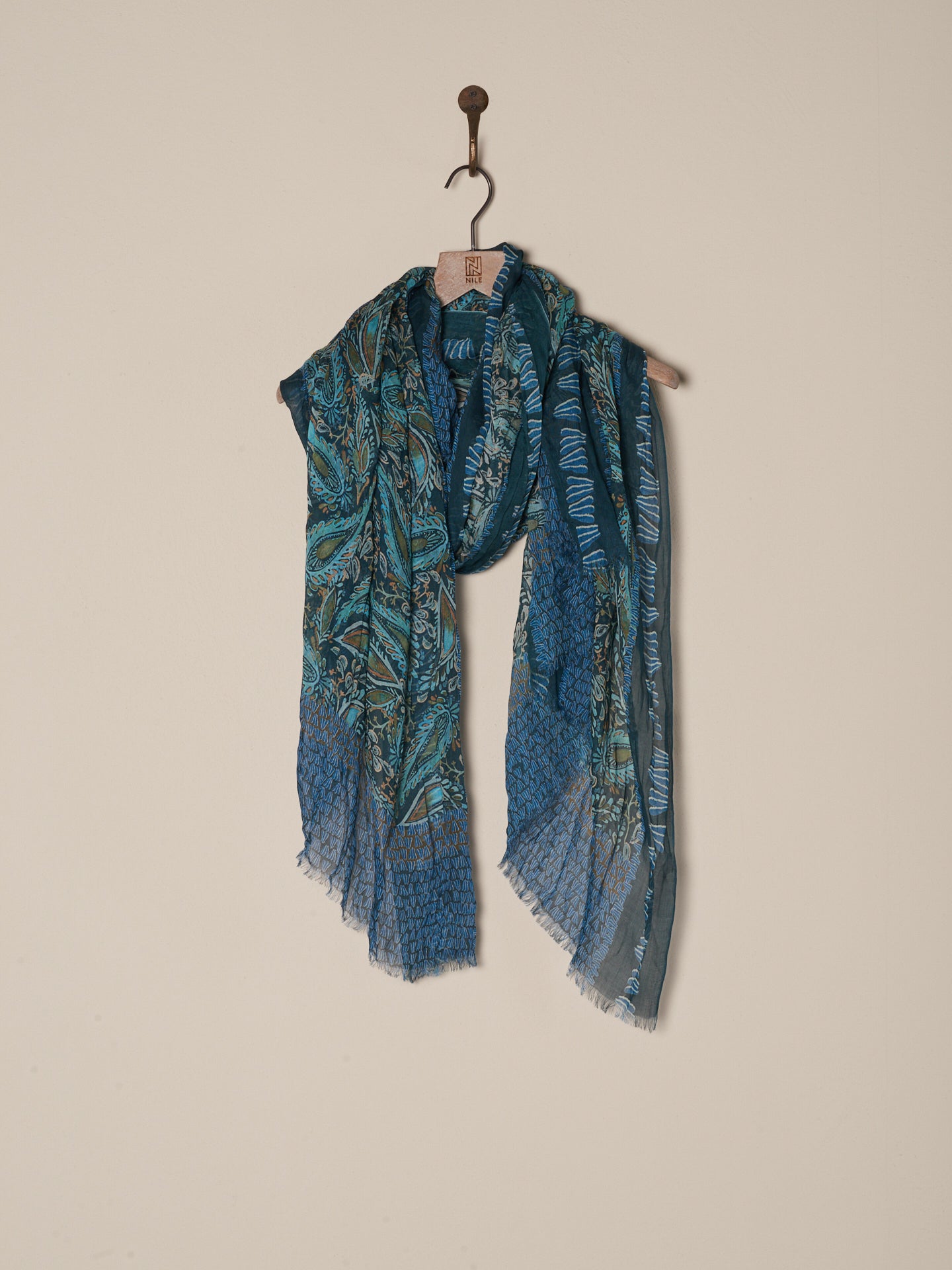 The large 120x200cm size is perfect for varied styling. Casually draped around the neck and shoulders, this scarf will instantly enhance any outfit and become a favourite accessory. The scarf is printed all over with hand-drawn prints and has shorter edges with fringes. 100% organic cotton from certified cultivation.