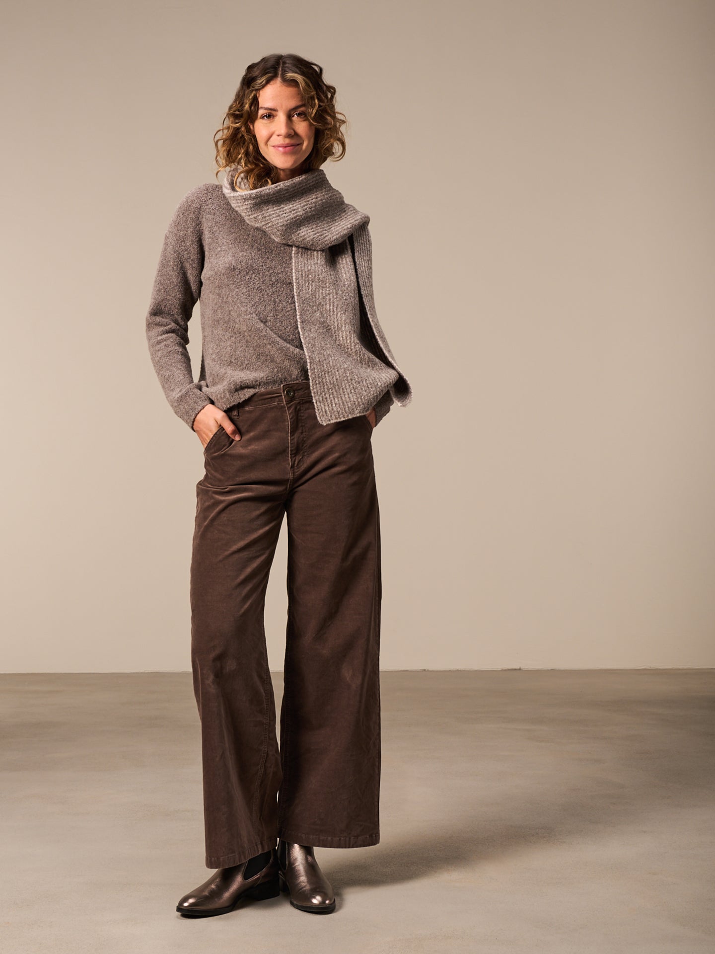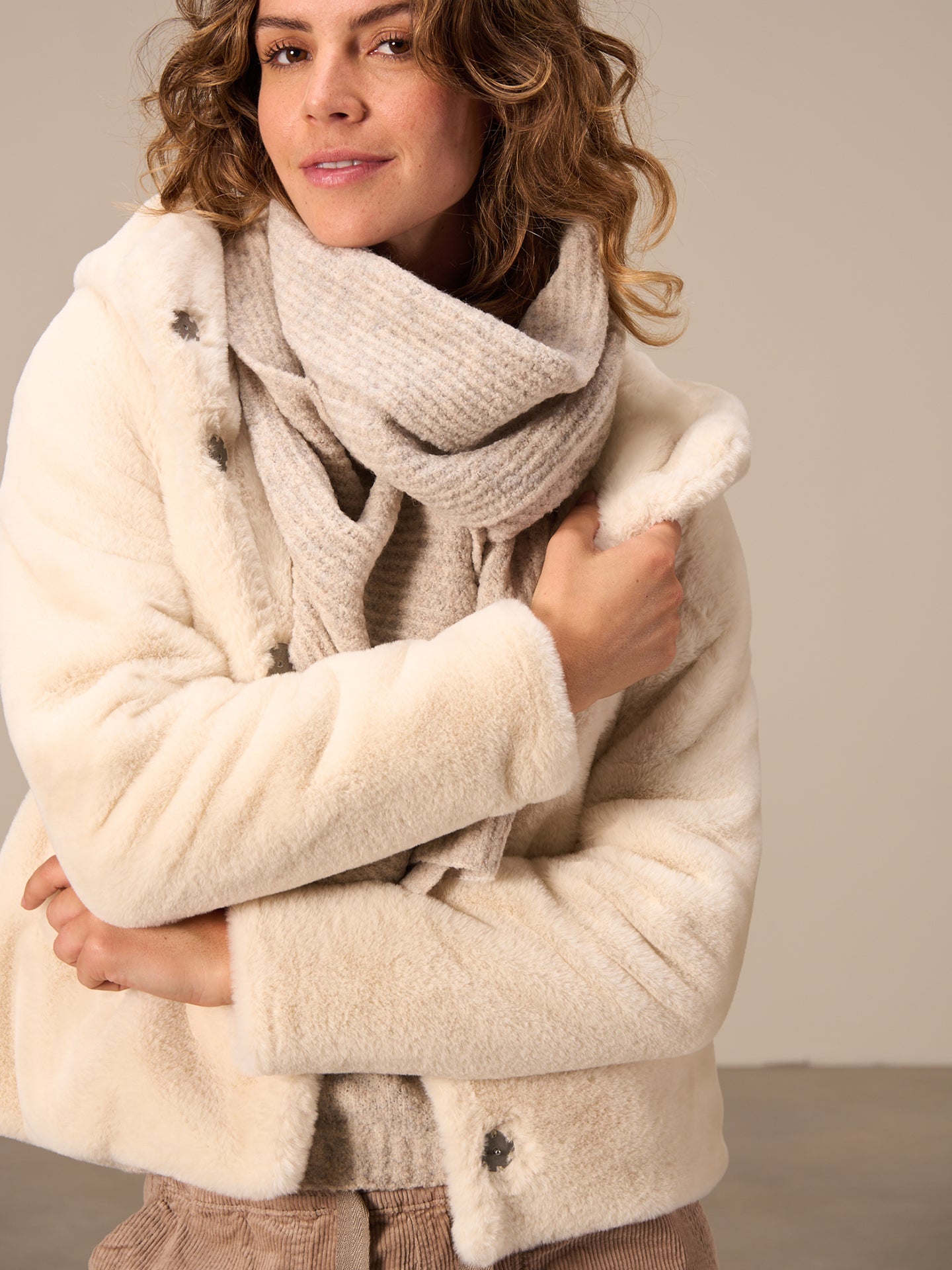 Fluffy scarf knitted in a two-tone patent pattern, the 'almond' colorway is knitted plain.