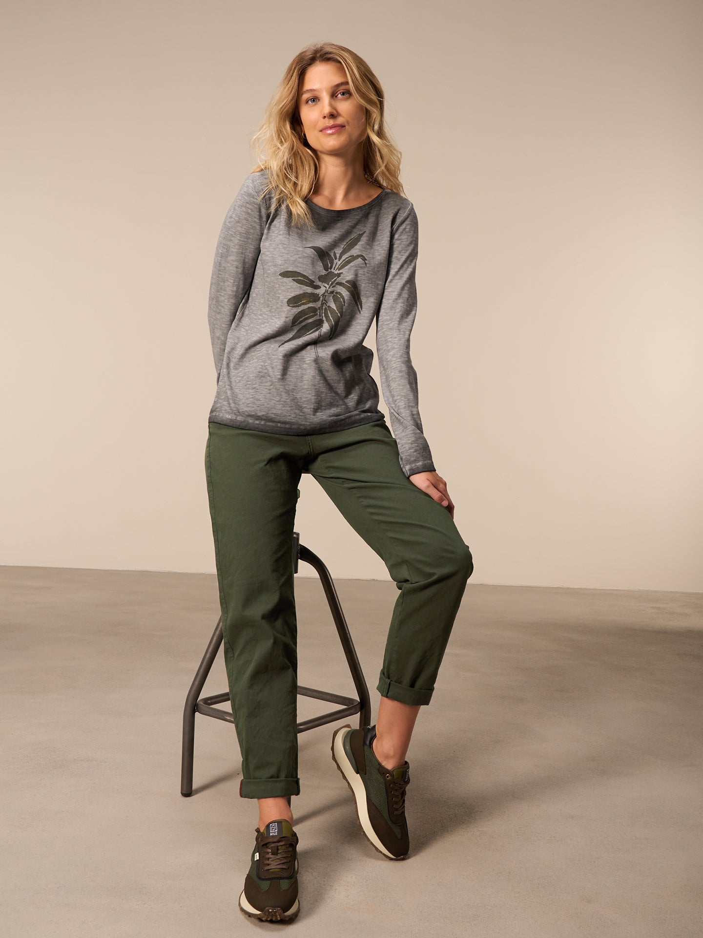 Casual cut long sleeve shirt in flamed jersey, bateau neckline and placed print. Made from 100% organic cotton. Inside dirty dye. Irregularities in the colour make the piece unique. The fading effect increases with washing.