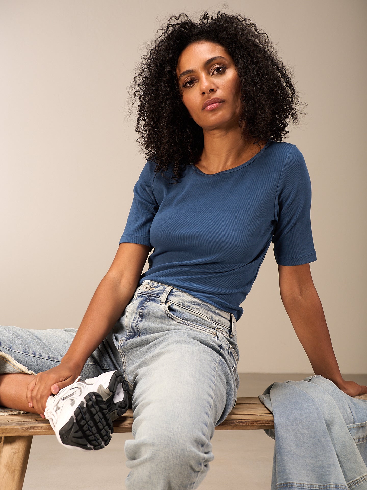 Figure-hugging short-sleeved shirt with a boat neckline in a soft ribbed fabric. Piece-dyed. 94% GOTS-certified organic cotton and 6% elastane.
