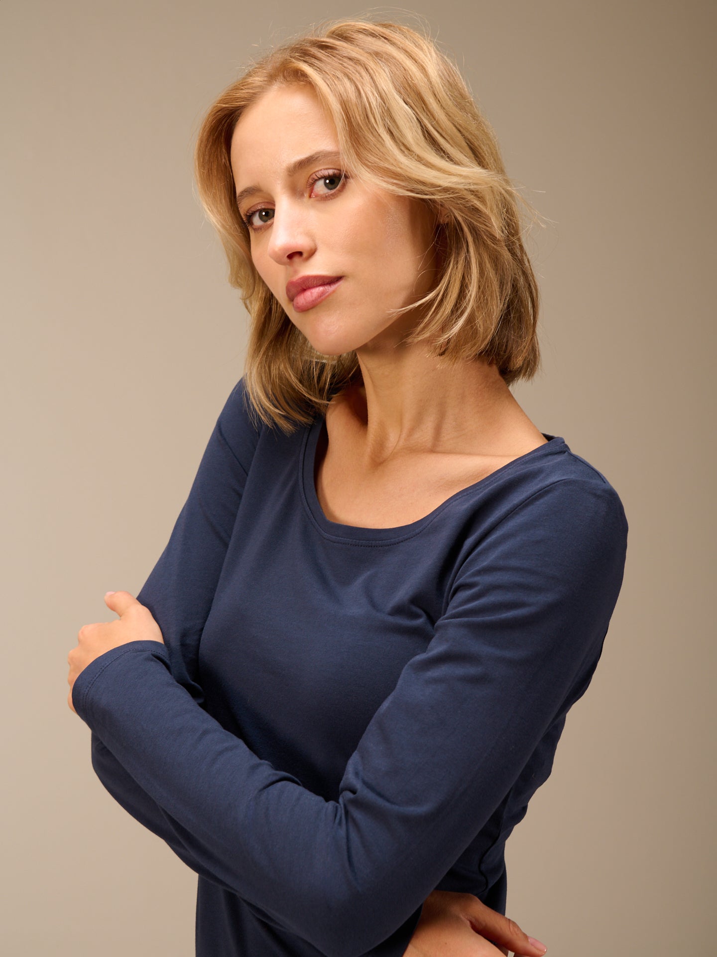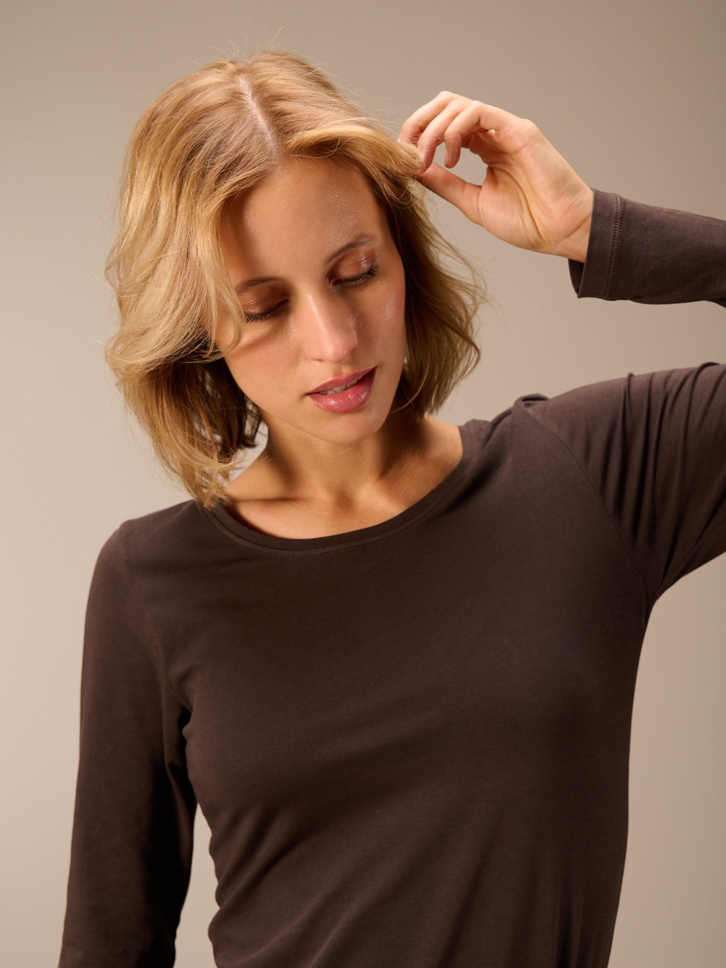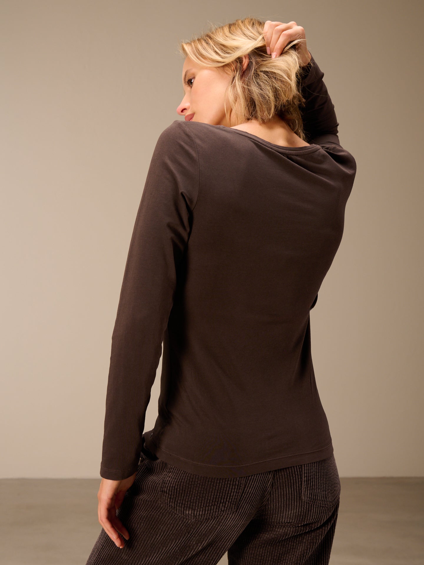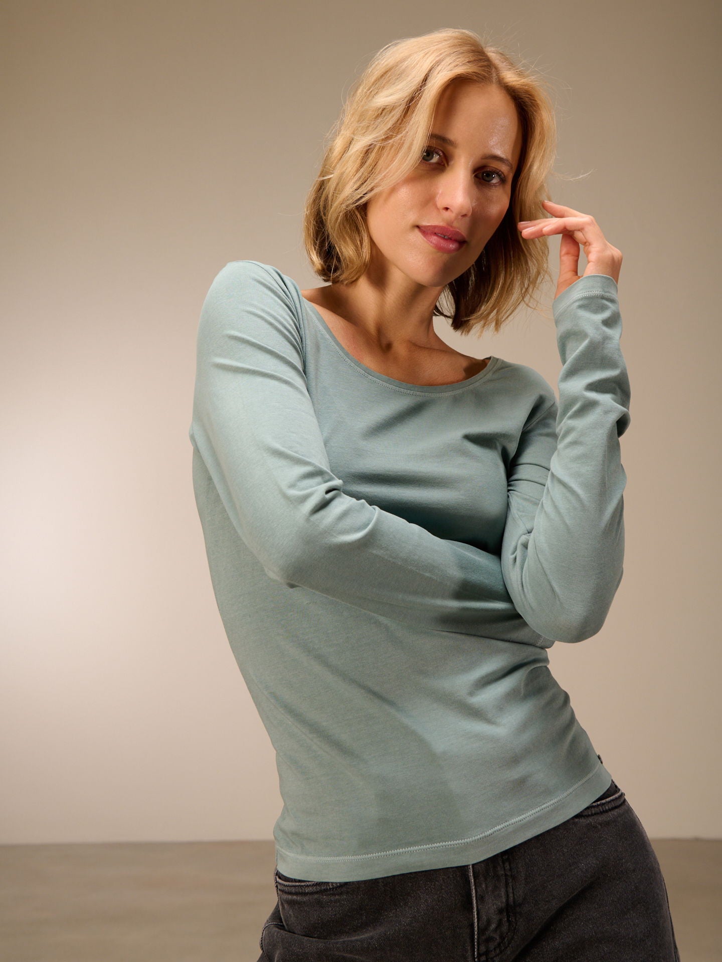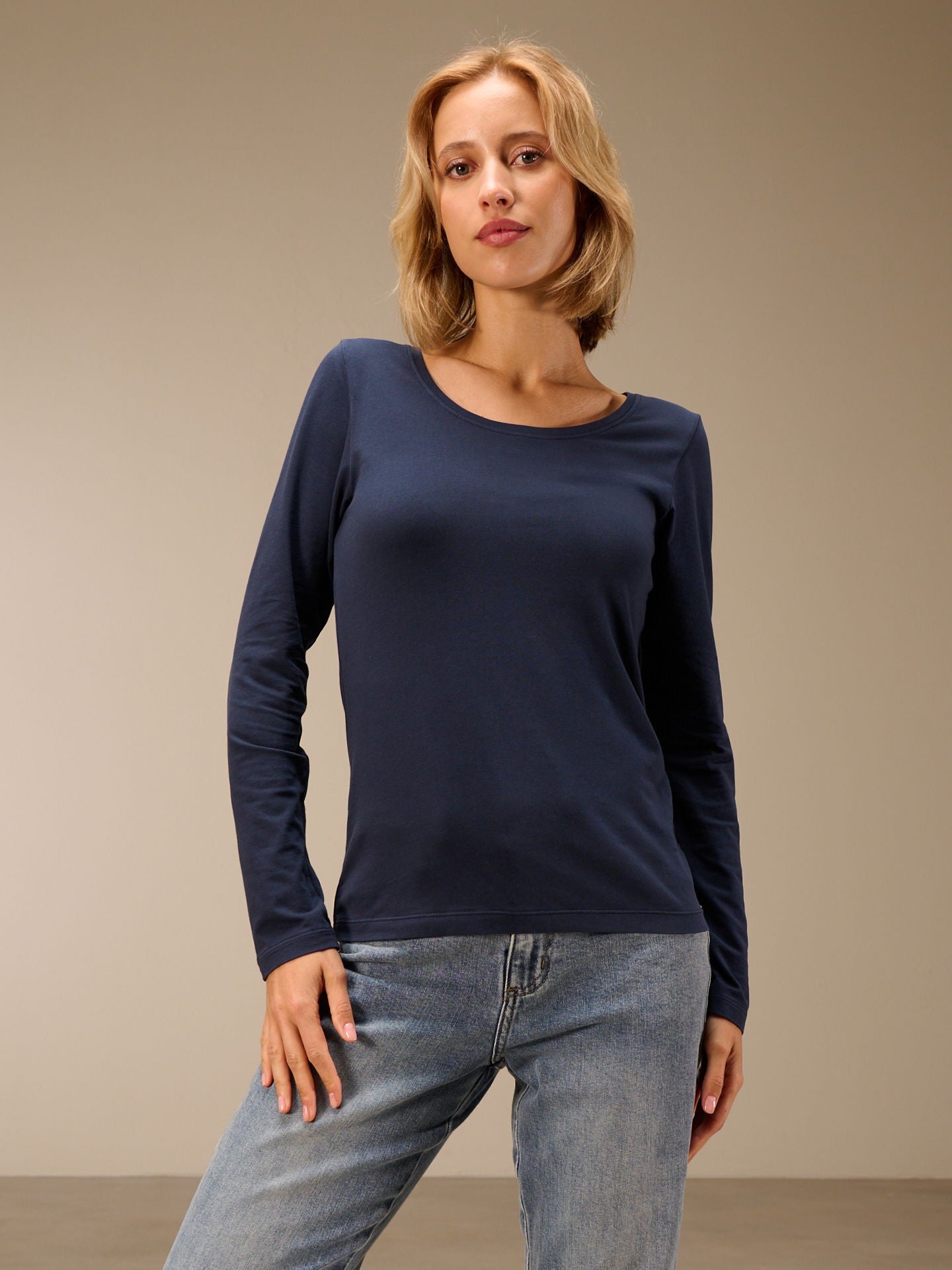 Figure-hugging, piece-dyed long-sleeved shirt with a round neckline in popular cotton quality.