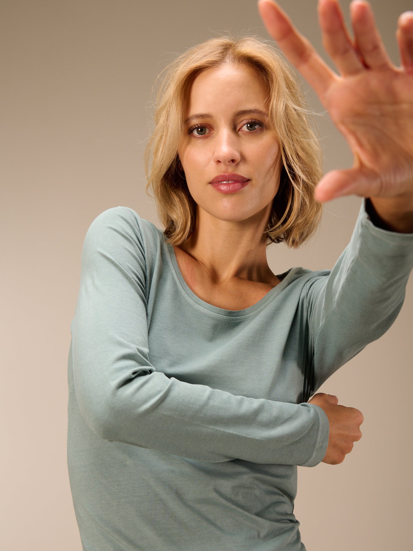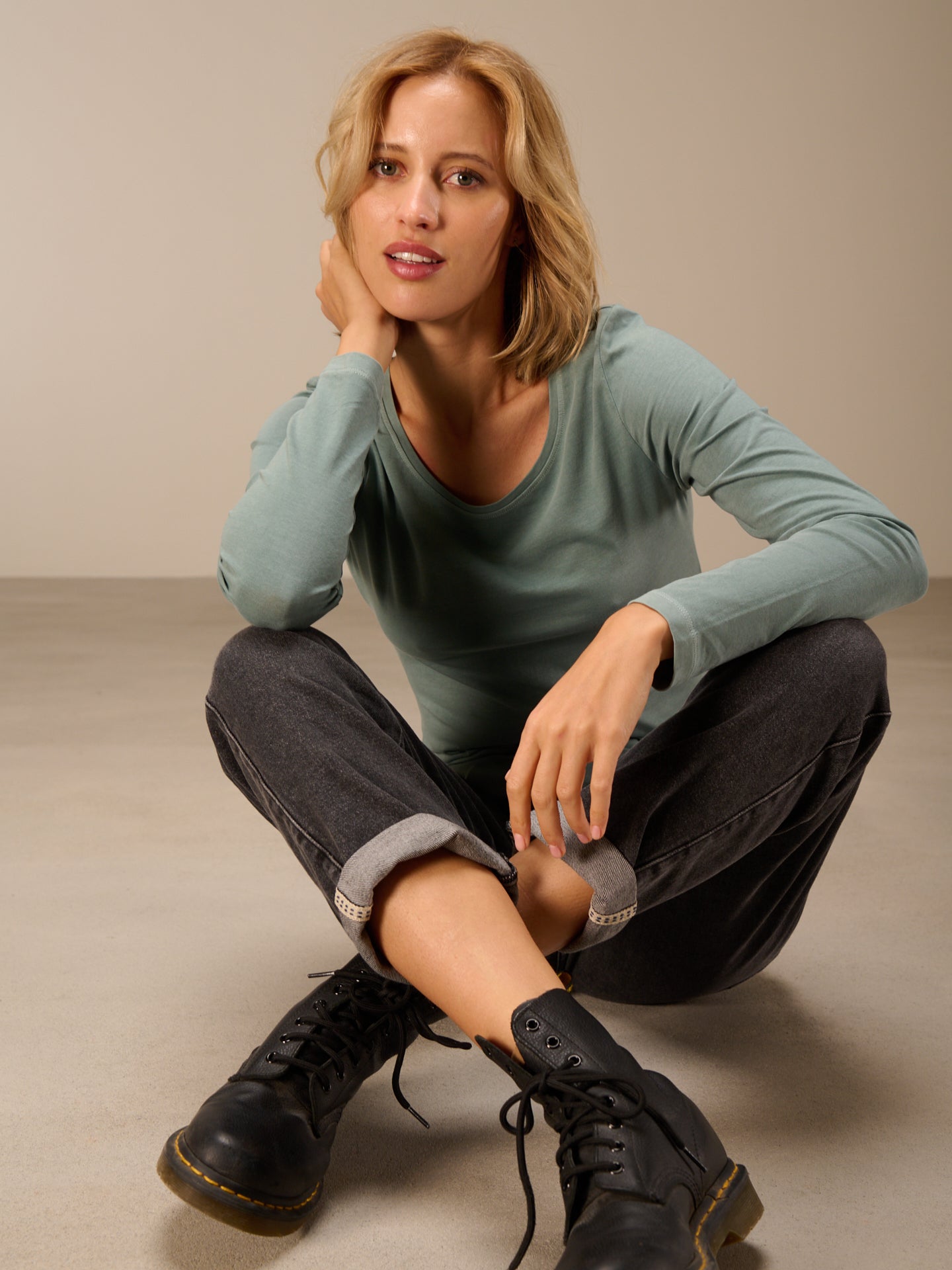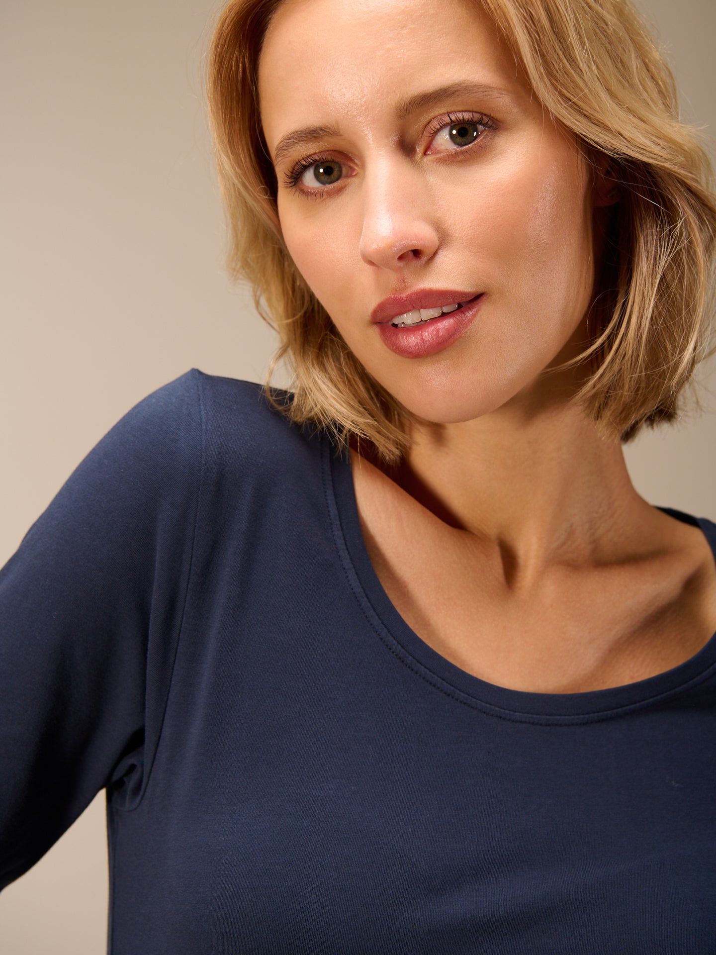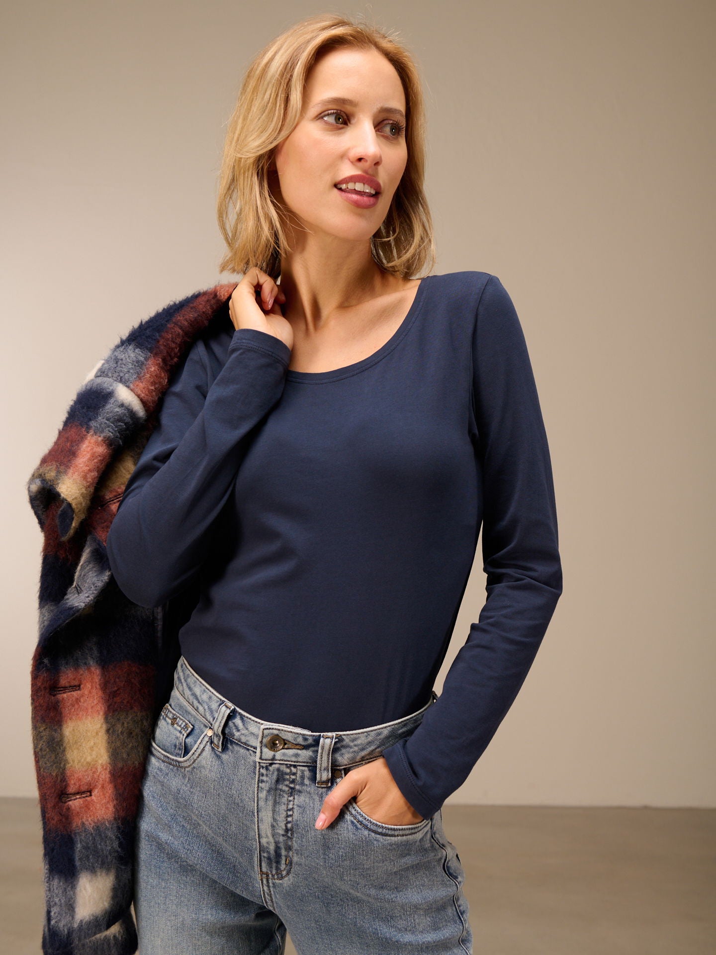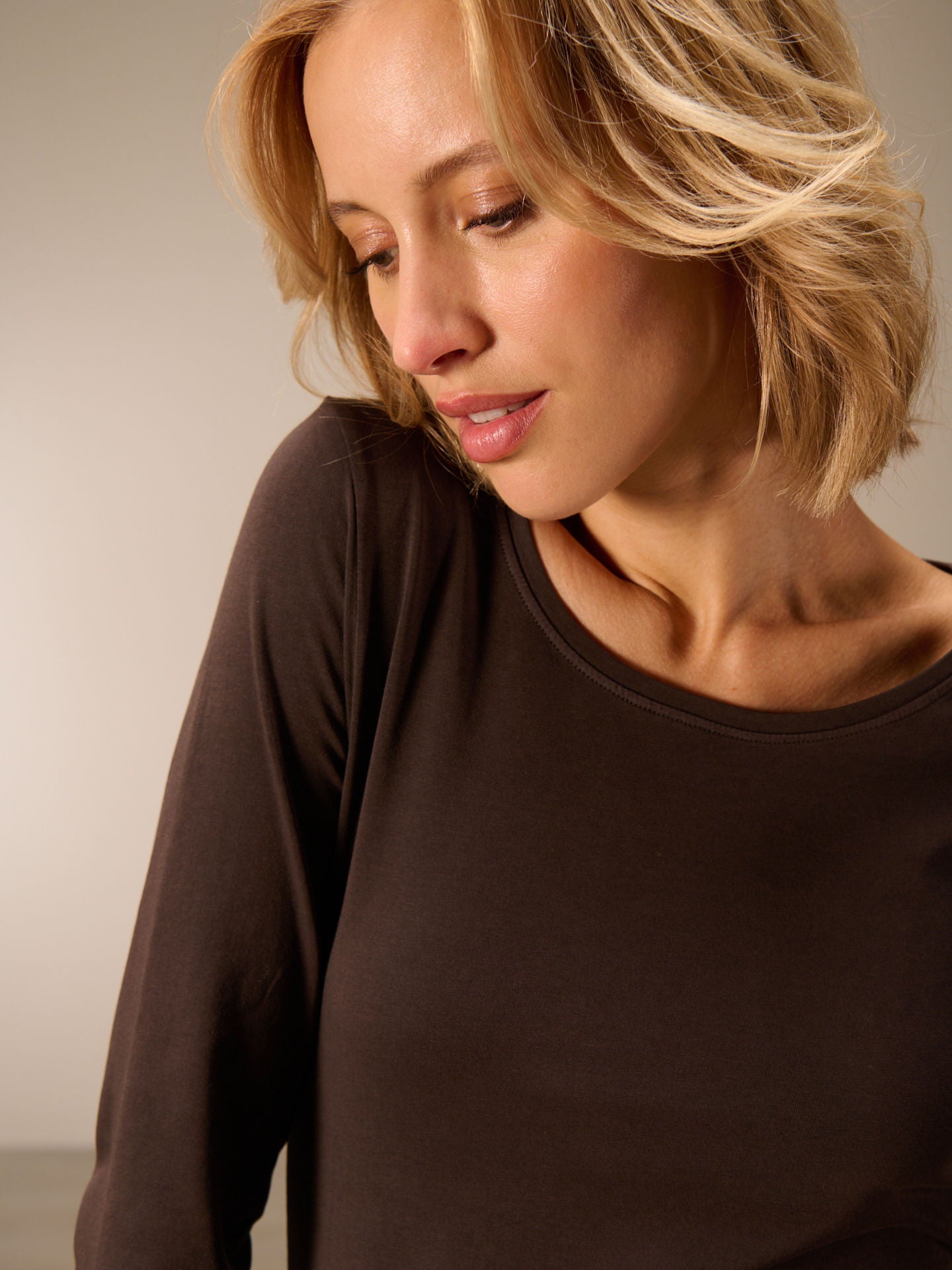 Figure-hugging, piece-dyed long-sleeved shirt with a round neckline in popular cotton quality.