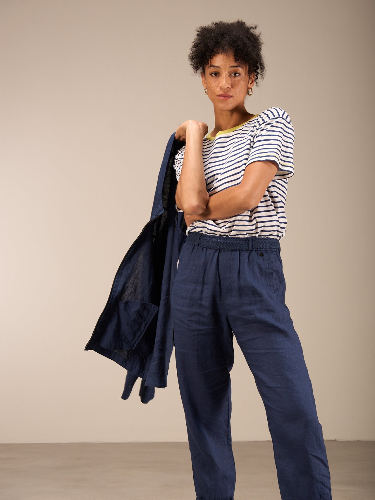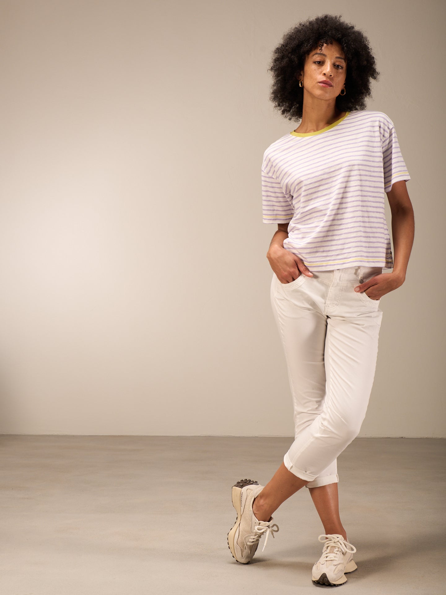 Trendy short-sleeved shirt in a cropped, boxy shape with a fashionable round neckline. The flamed jersey and all-over stripe print make this shirt a favourite summer companion.