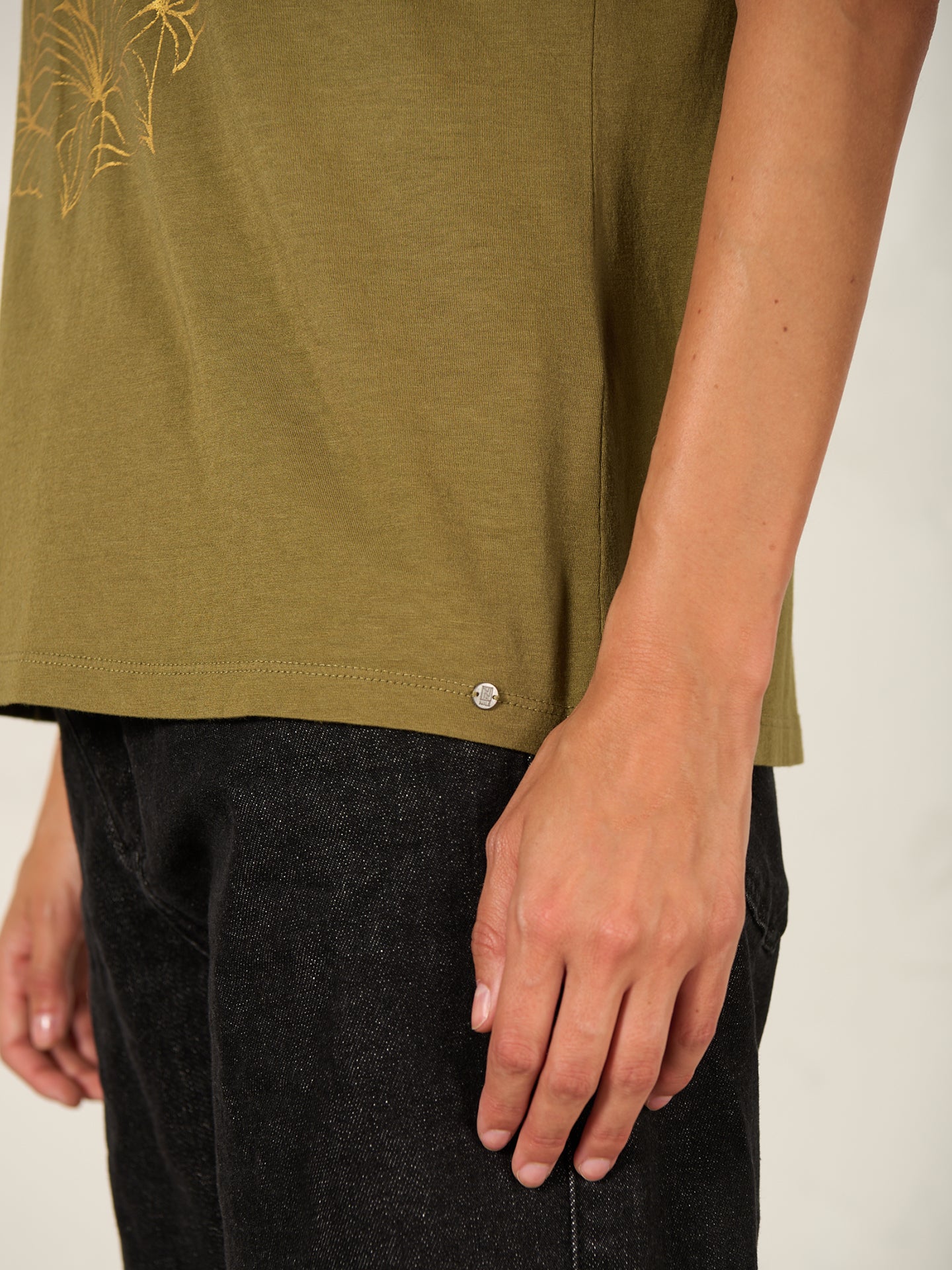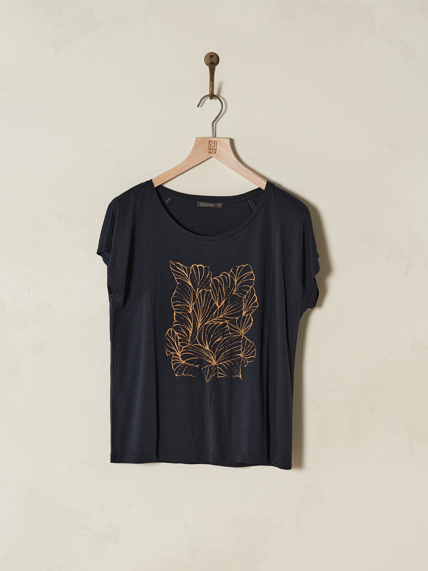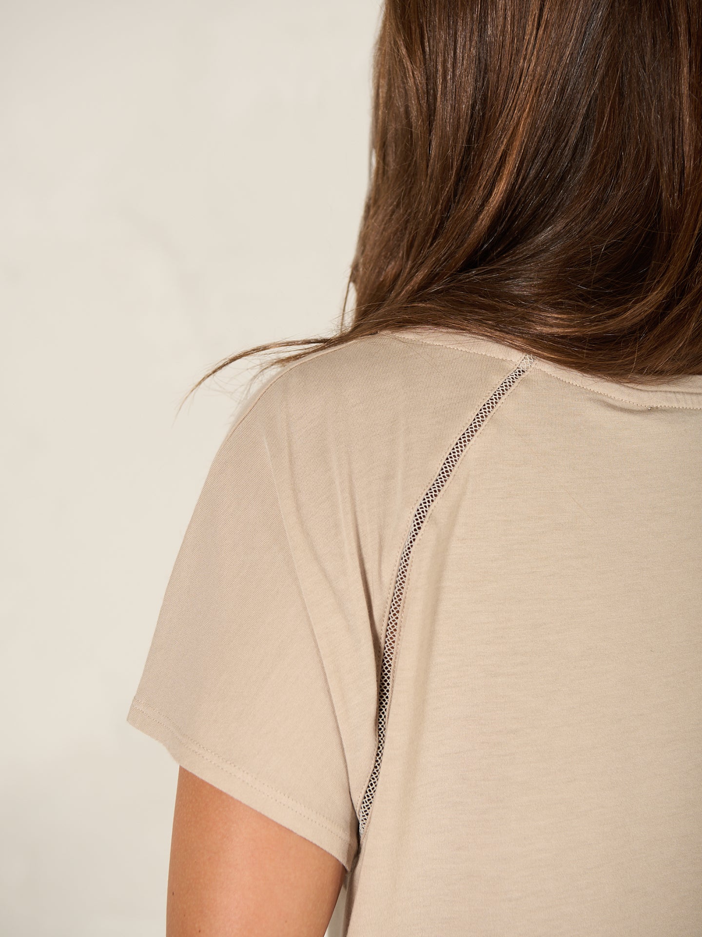 Loose-fit T-shirt with placed print and high-quality, decorative perforated lace on the back seams. Composed of 70% viscose made from bamboo fibers and 30% organic cotton from certified farms. Piece-dyed.