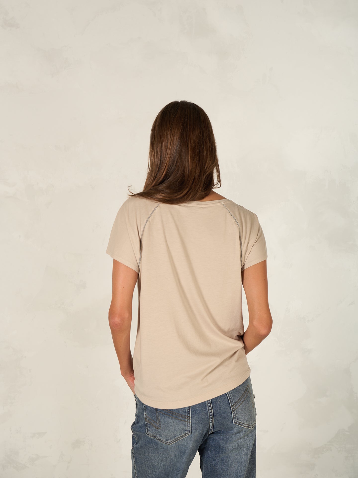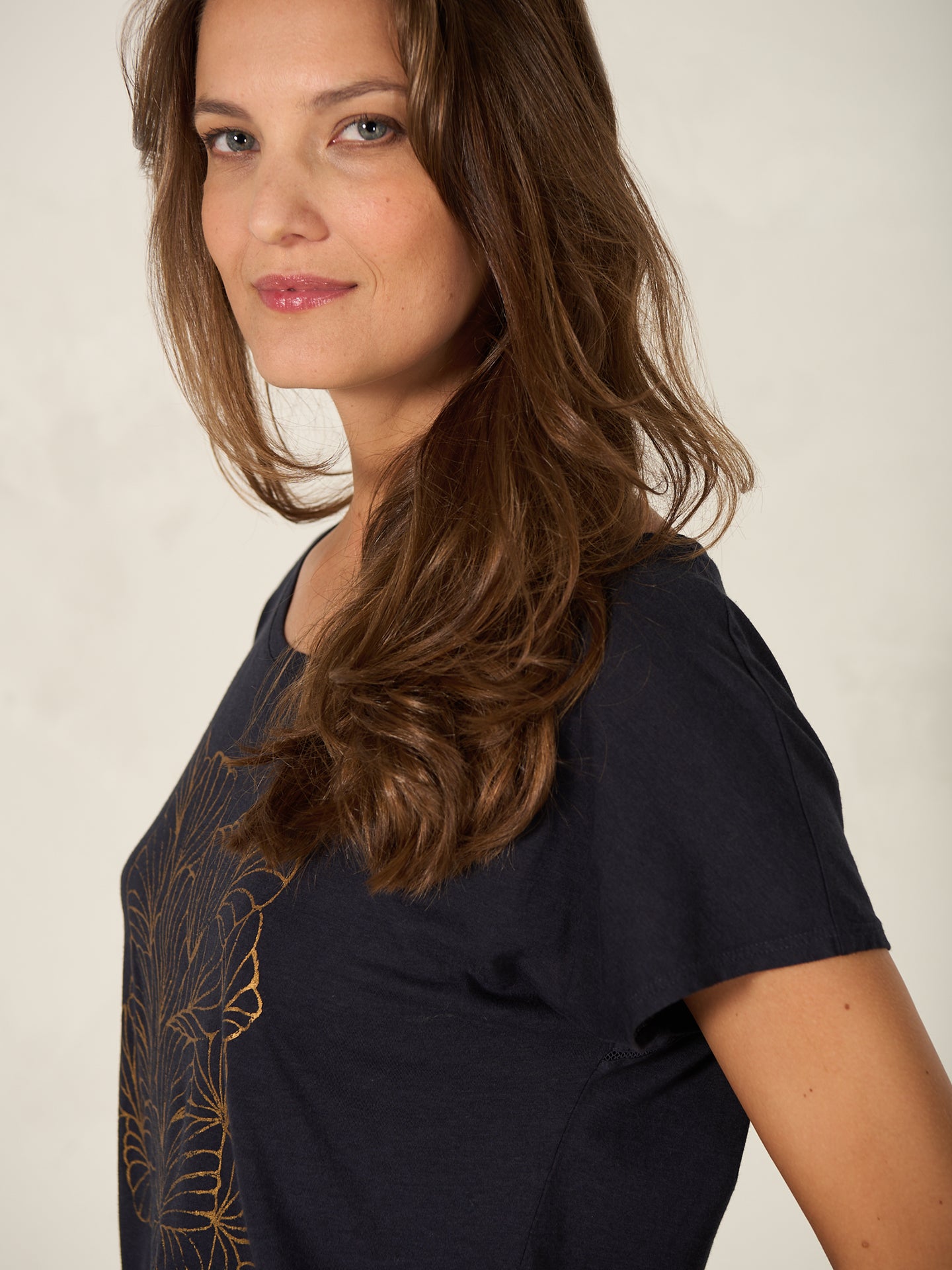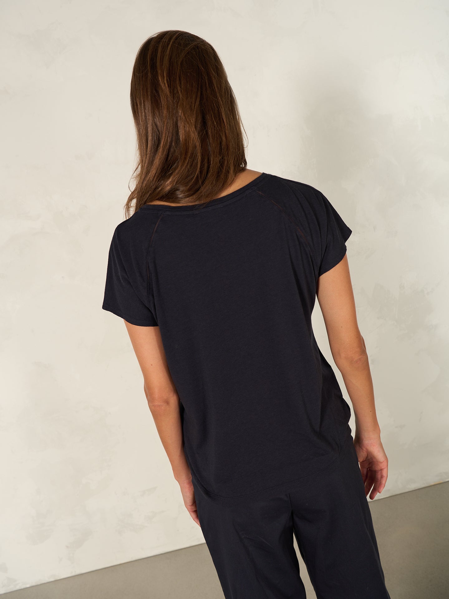 Loose-fit T-shirt with placed print and high-quality, decorative perforated lace on the back seams. Composed of 70% viscose made from bamboo fibers and 30% organic cotton from certified farms. Piece-dyed.