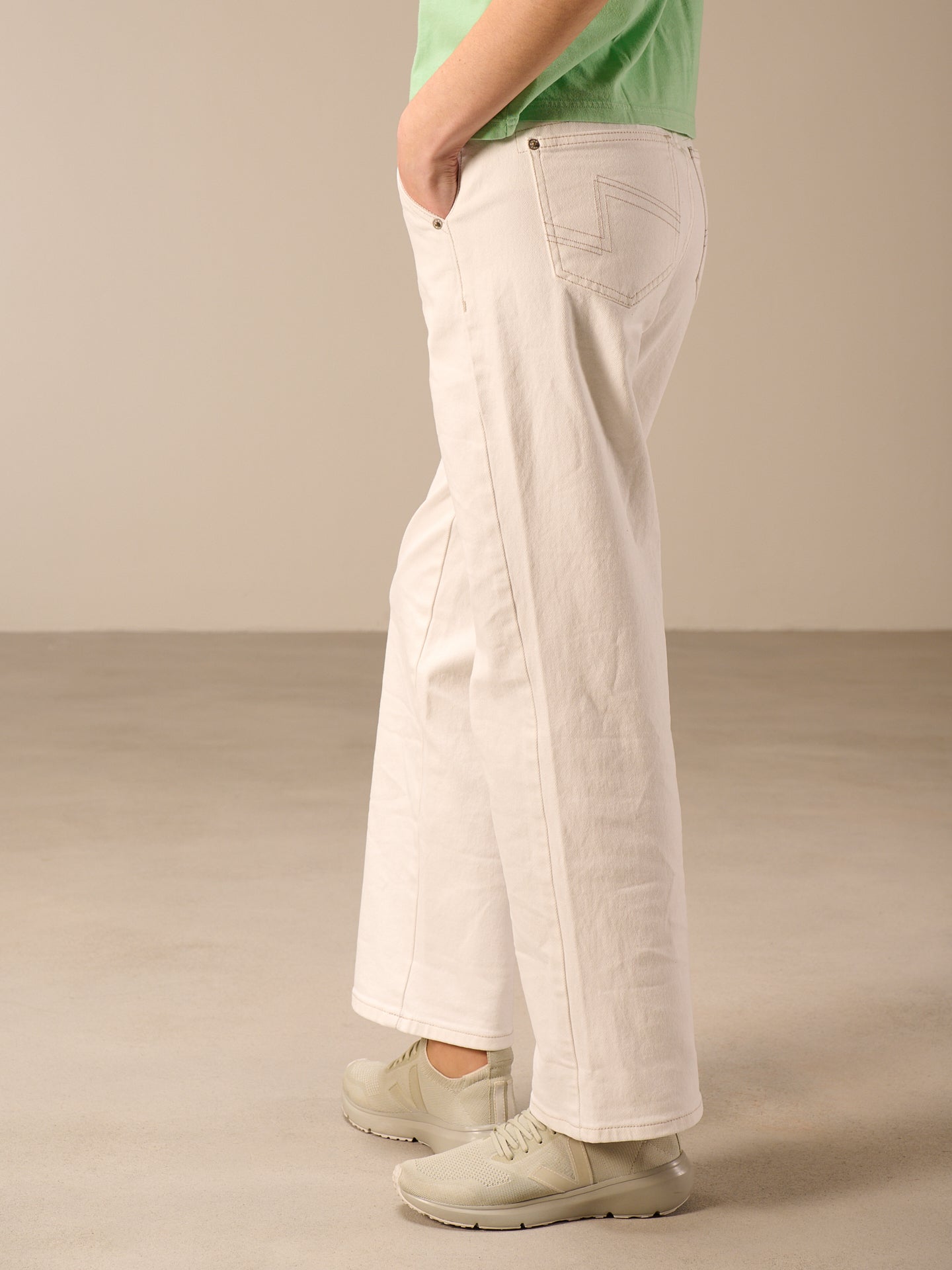 Hip-hugging pants with a mid-rise waist and straight-cut legs. The pant legs feature a wide hem, allowing for variable length. Sturdy denim with slight stretch. Irregularities in color and a reinforced fading effect are intentional and make each piece unique. The product may rub off on clothing and surfaces.
