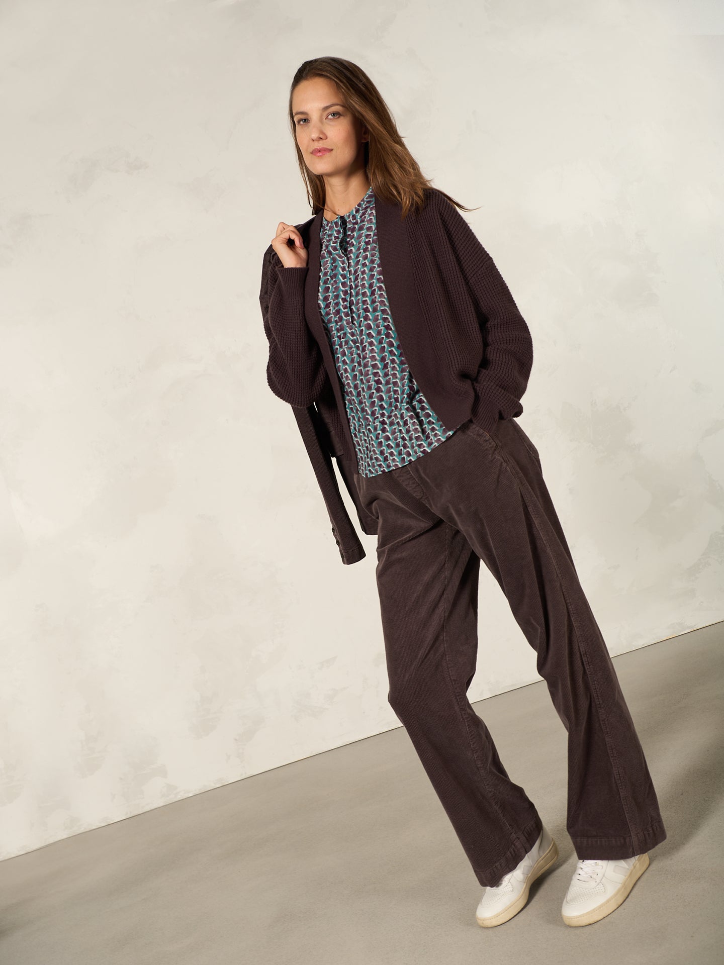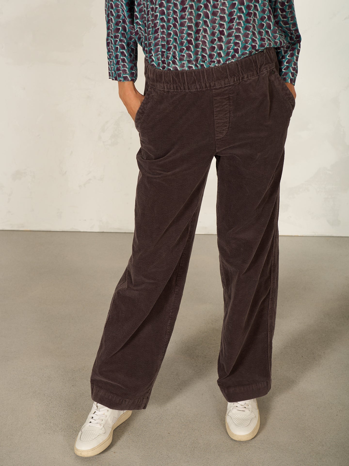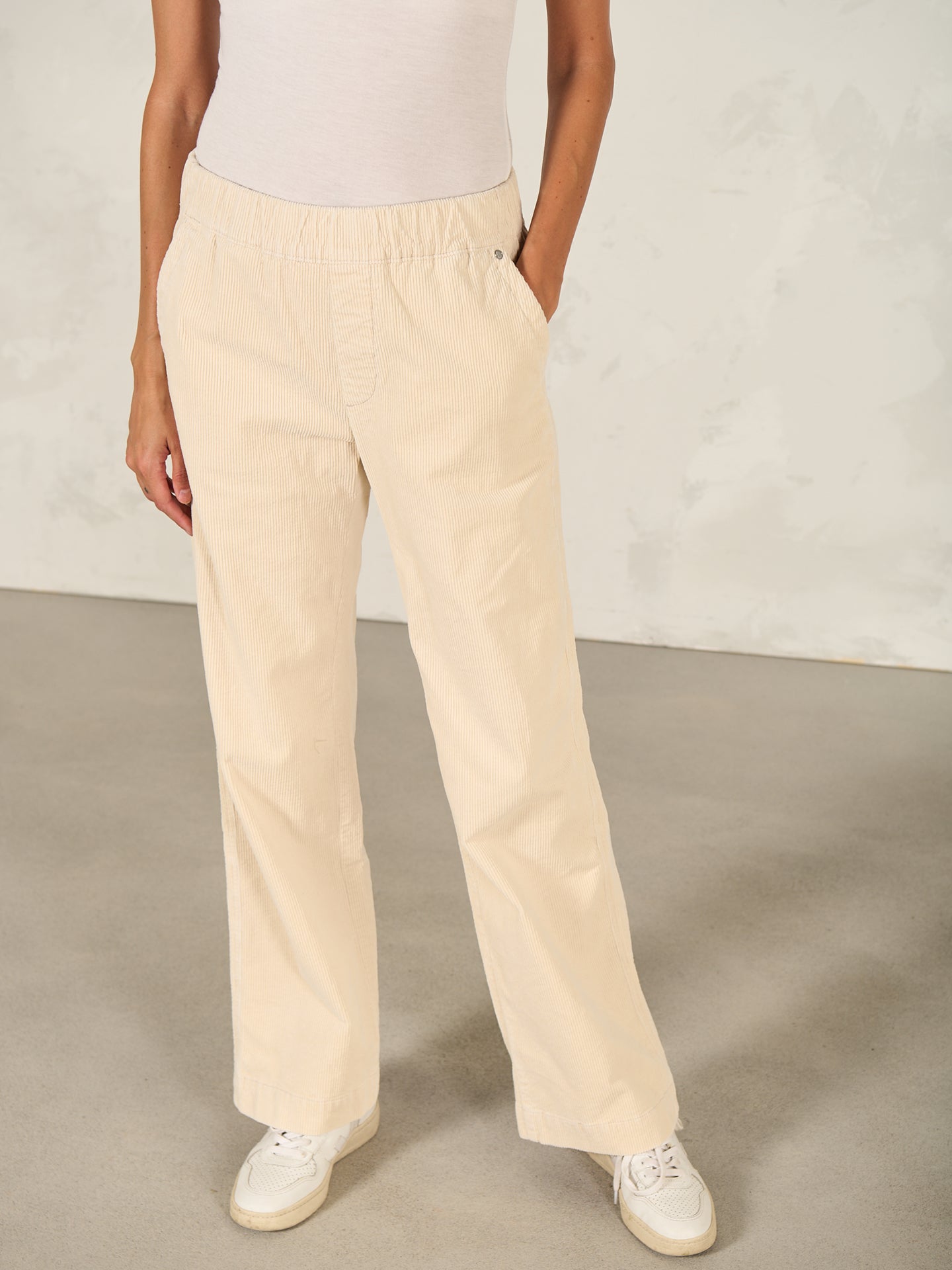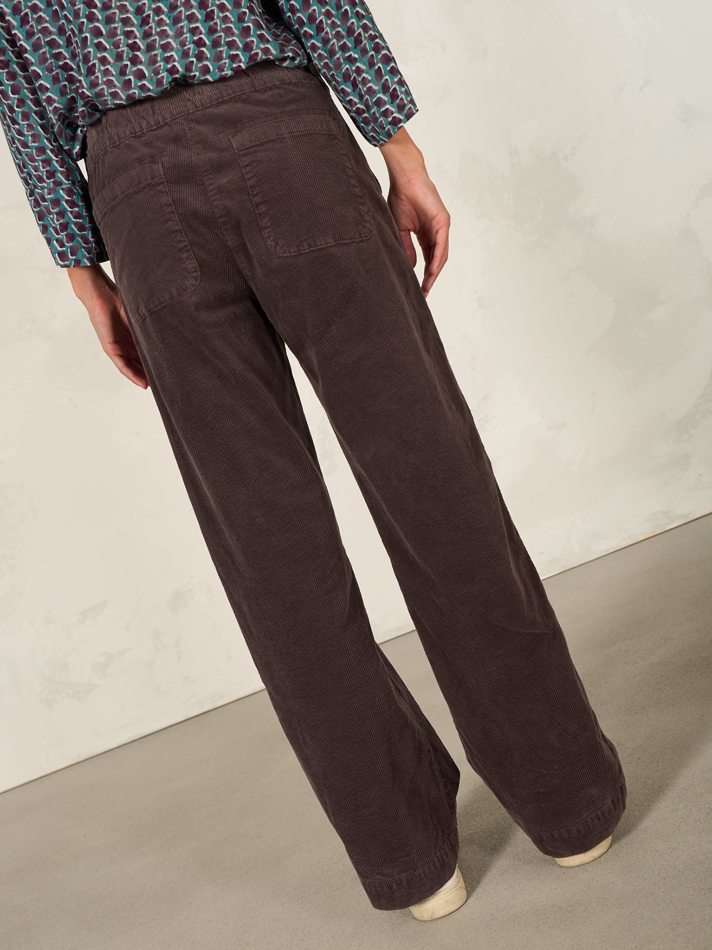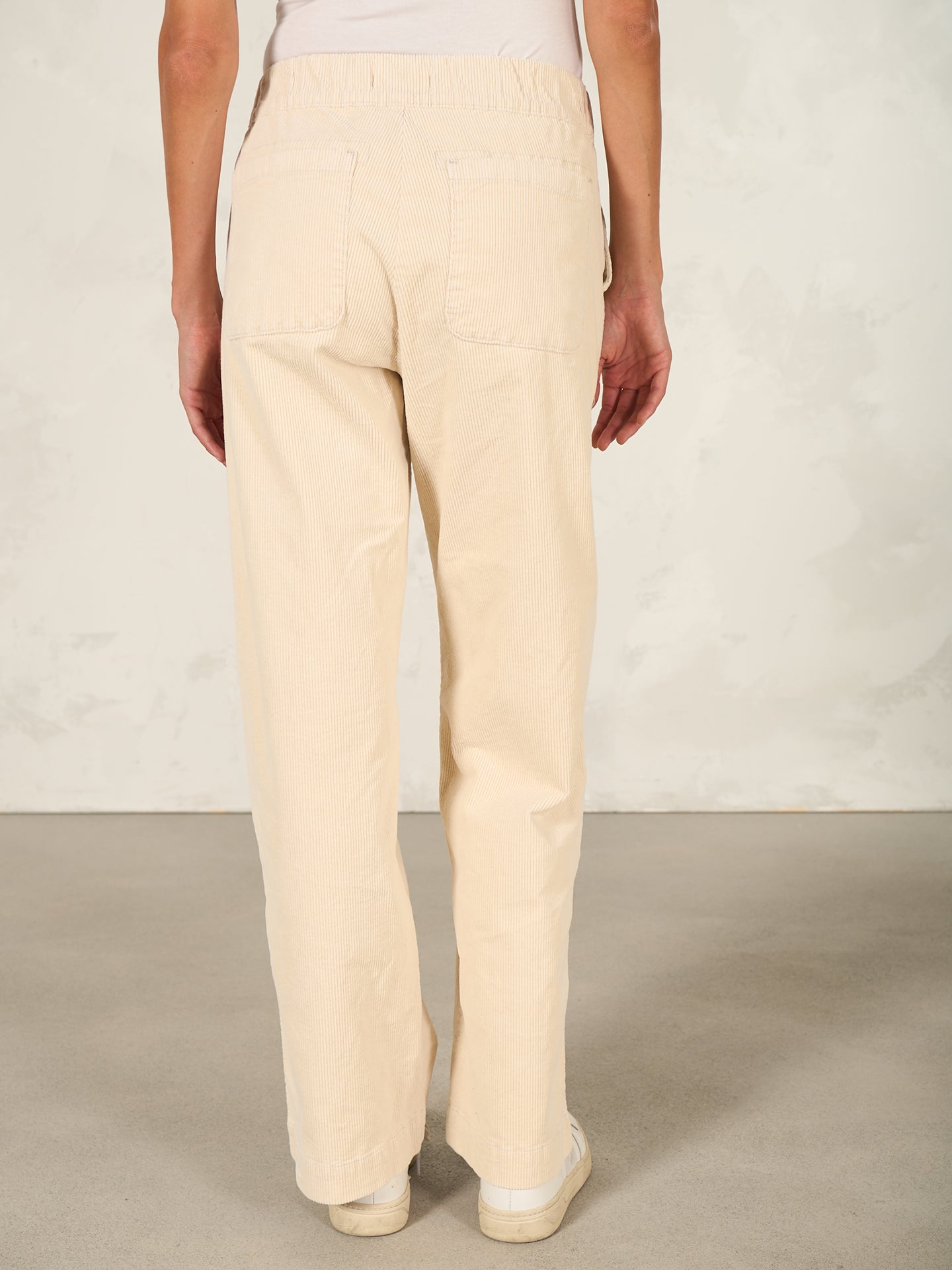 Loose-fitting trousers with a wide, subtly flared leg and a mid-rise elasticated waistband in velvety ribbed cord with a soft feel.
