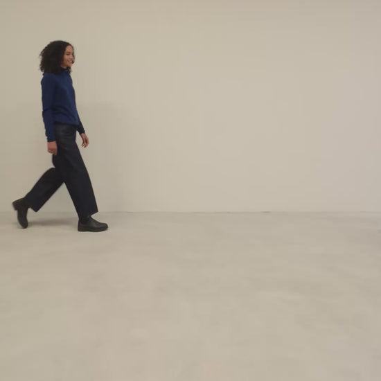 Denim pants made from 100% recycled cotton. Hip-hugging pants with wide, subtly flared legs and a fashionable high waistband, patch back pockets with cognac-colored contrast stitching. Made from sturdy denim without stretch. The fading effect is enhanced. The product may rub off on clothing and surfaces. These pants are responsibly produced in Portugal.