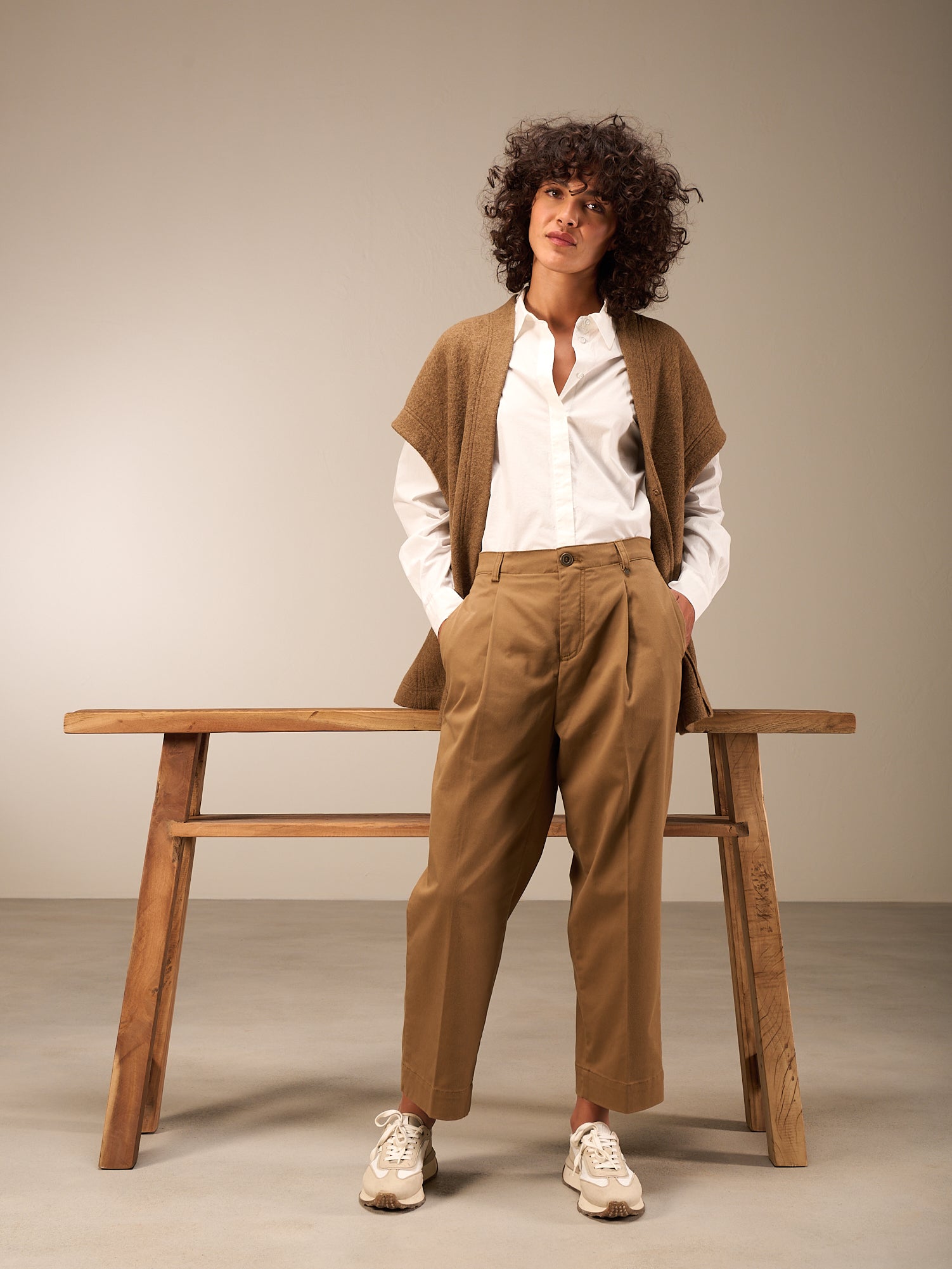 Pantalon décontracté en forme de O avec une taille haute et des plis stylés. Poches passepoilées au niveau des fesses et, détail particulier, boutons-pression sur l'ourlet arrière des jambes pour régler la largeur de l'ourlet. Un tissu légèrement élastique et légèrement brillant complète le style.