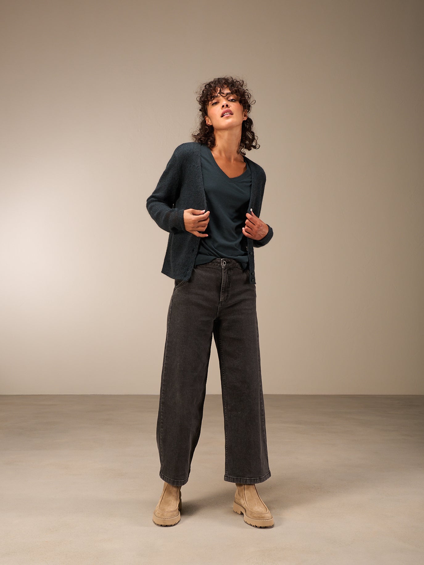 Veste en tricot ample avec des épaules étroites et une encolure en V, se fermant avec des boutons à œillets en nacre de qualité, dans un motif semi-patenté légèrement transparent.