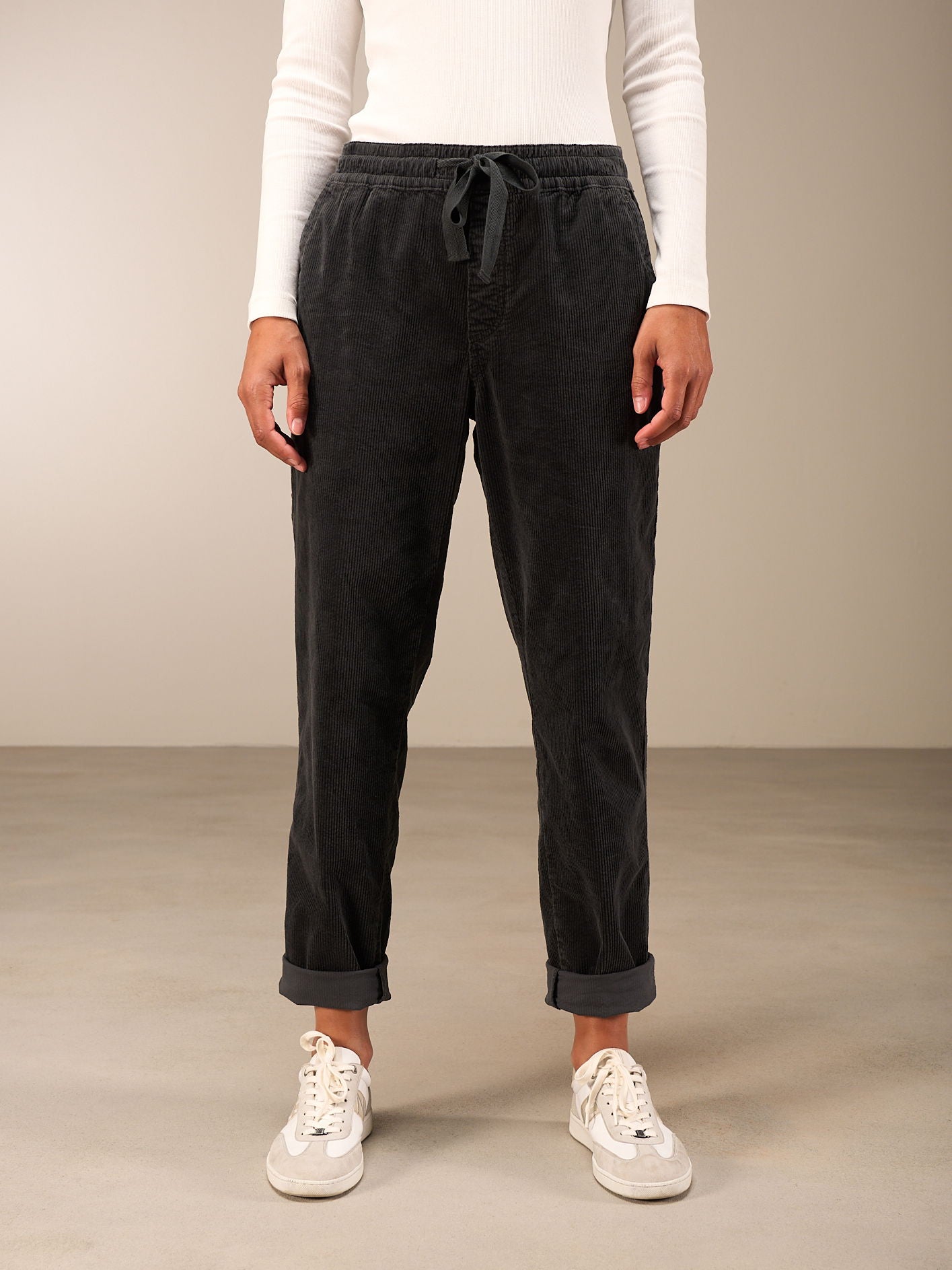 Pantalon de sport décontracté en velours côtelé longitudinal doux avec une taille élastique moyenne avec cordon de serrage, un ourlet retroussé et des poches plaquées.
