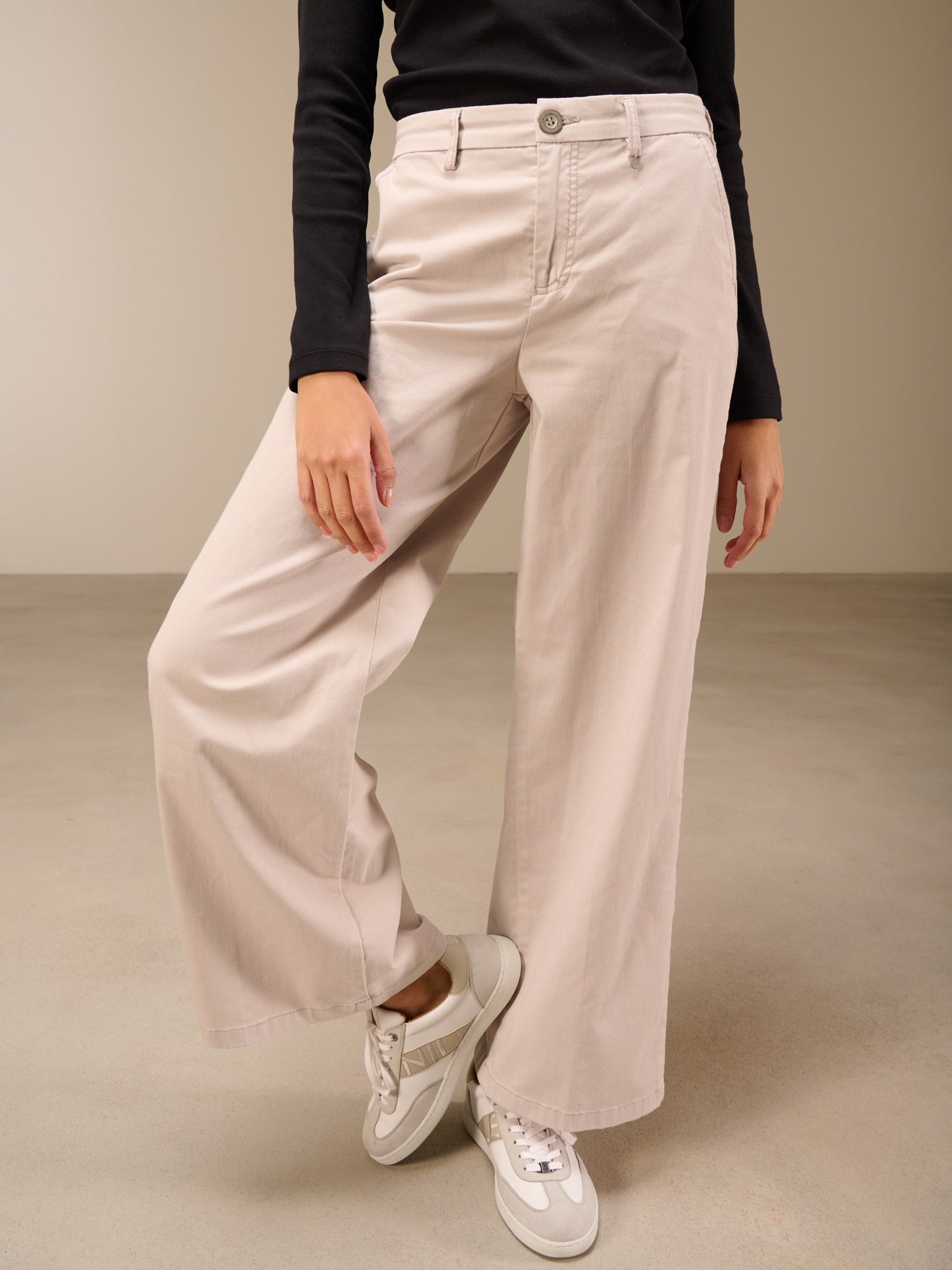 Ce pantalon confortable est ajusté au niveau des hanches, possède une taille mi-haute avec des passants de ceinture et une coupe légèrement évasée et raccourcie. Il présente de jolis détails tels que des poches latérales et des fausses poches passepoilées à l'arrière. Il est confectionné dans un tissu élastique confortable légèrement brillant. Le produit peut déteindre sur les vêtements et les surfaces.