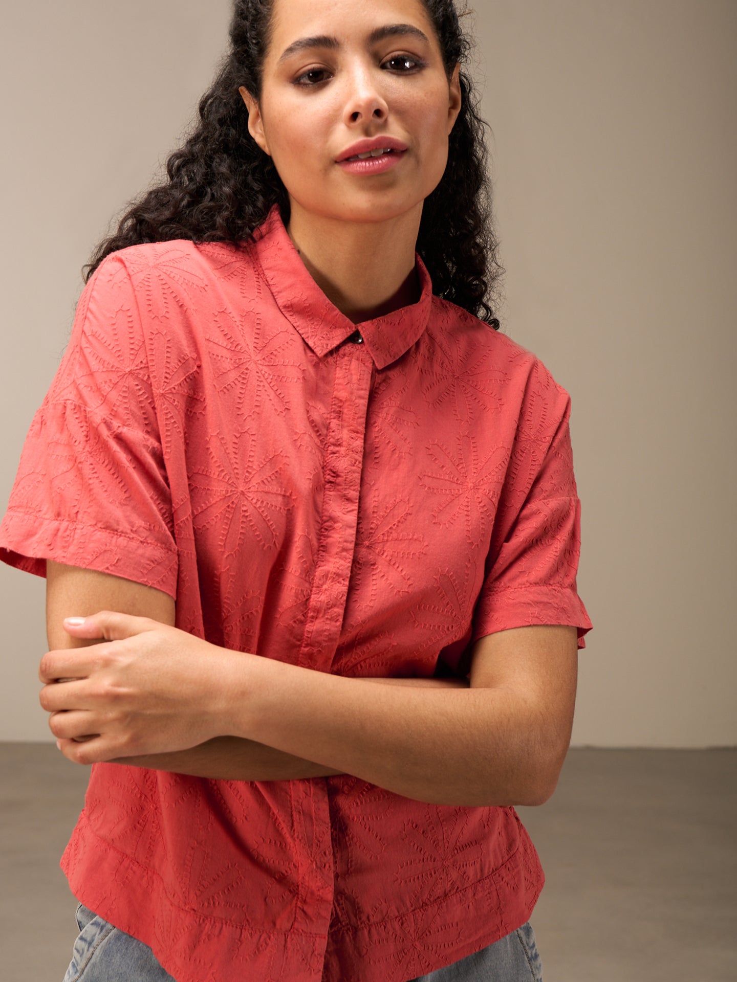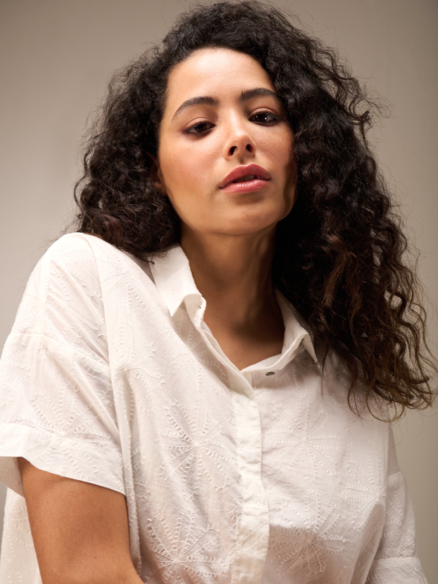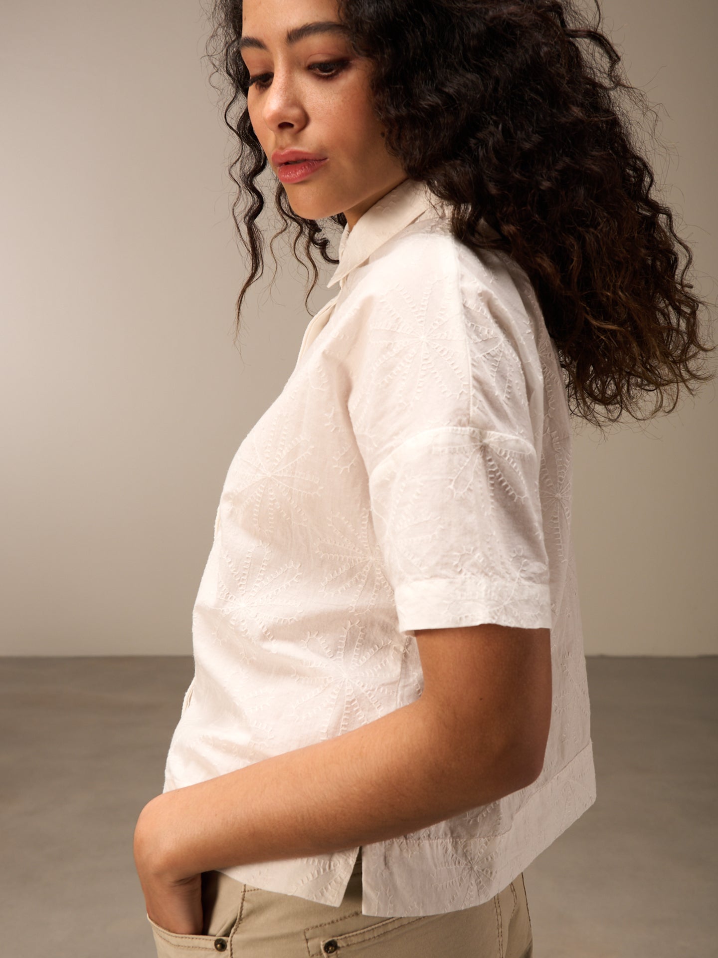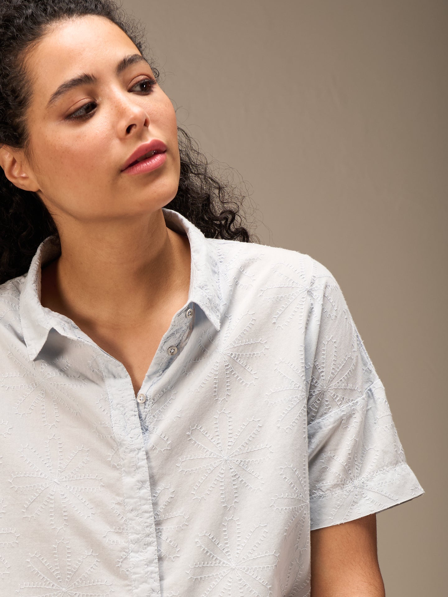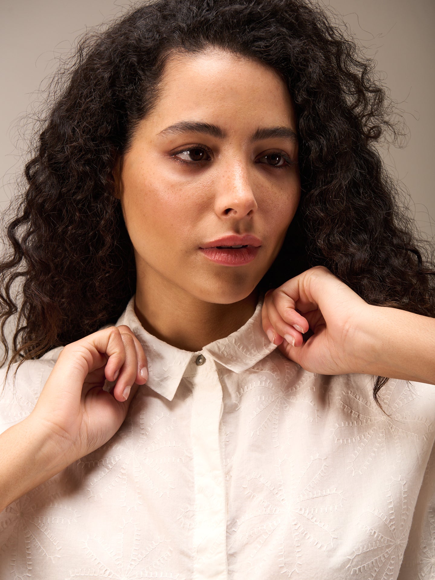 Chemisier à manches courtes, léger et estival, ample et casual, avec un col chemise et une patte de boutonnage cachée avec de petits boutons métalliques. La jolie broderie all-over est de notre propre conception. Un large ourlet avec de petites fentes latérales complètent le style.