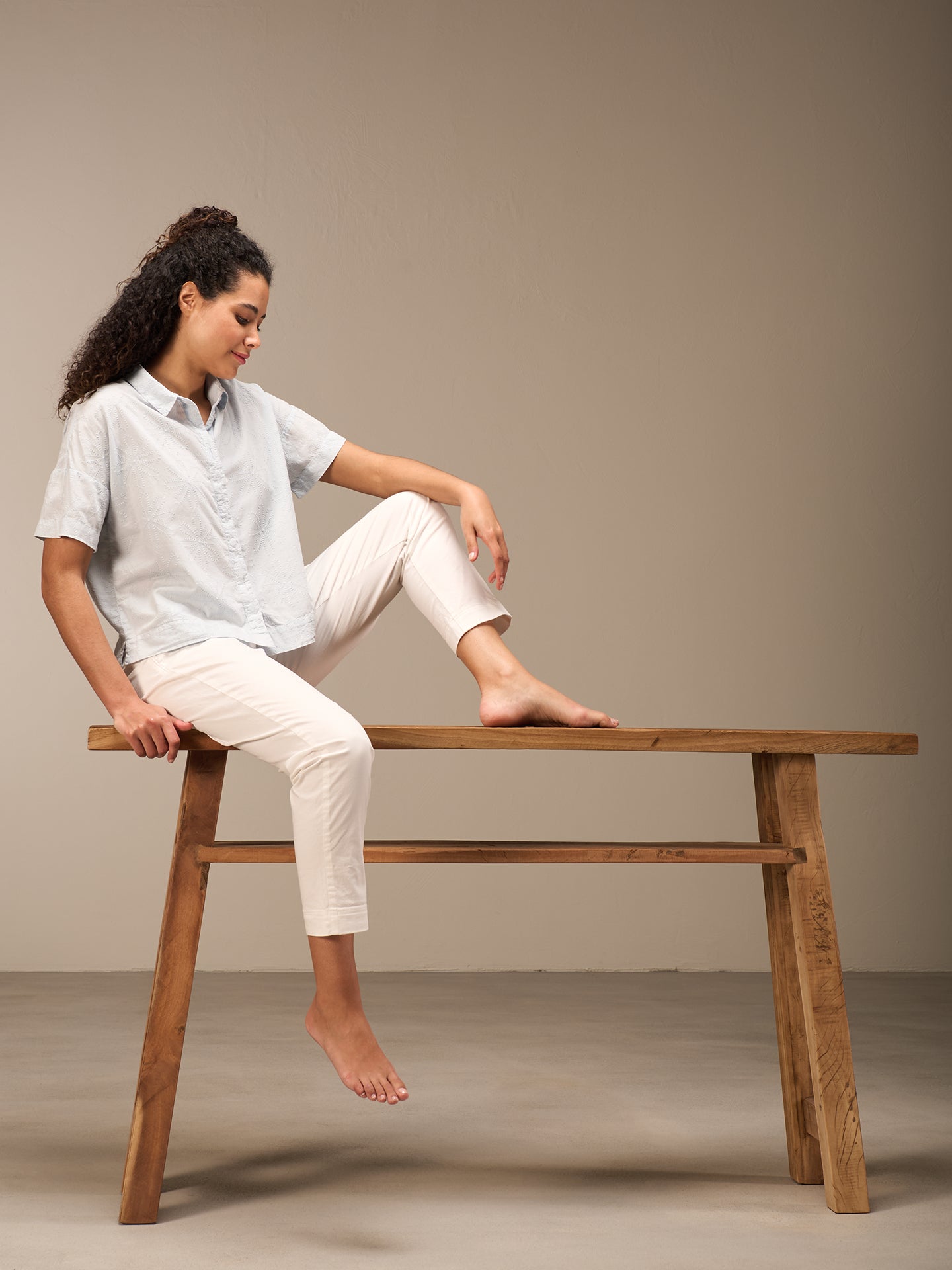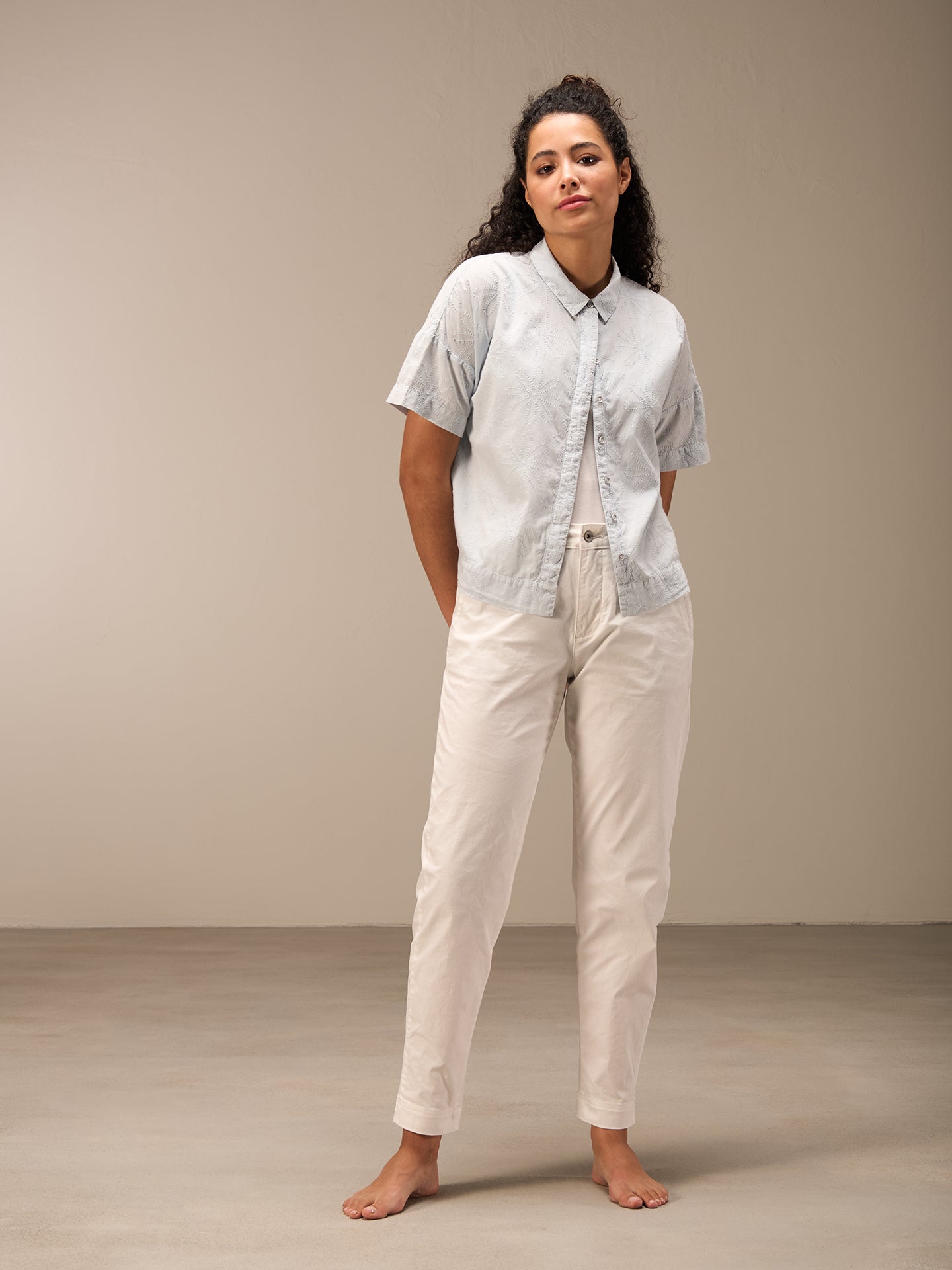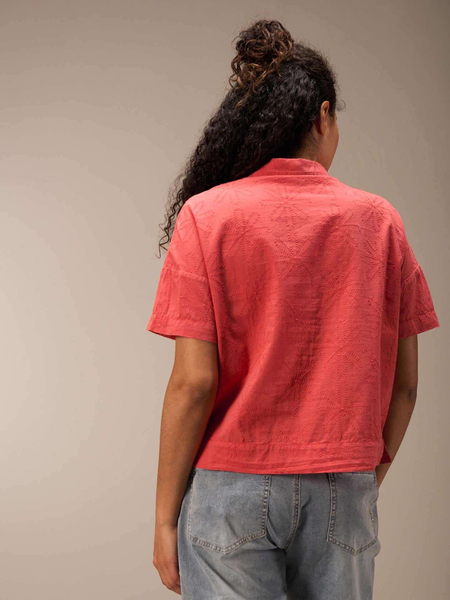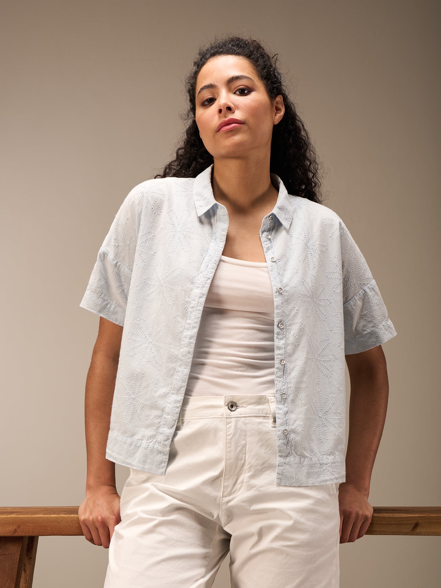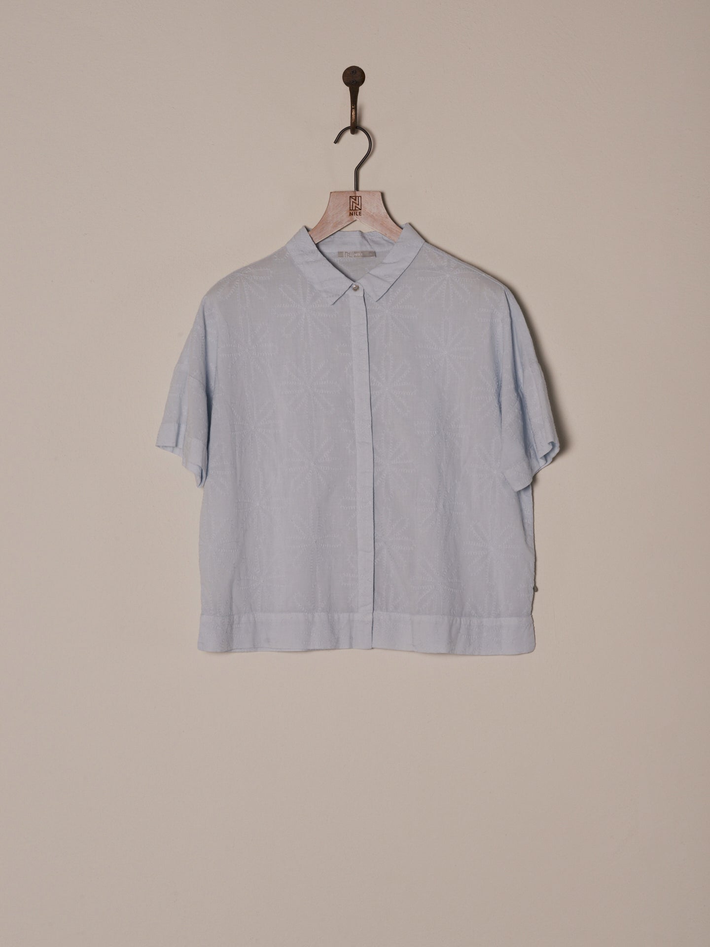 Chemisier à manches courtes, léger et estival, ample et casual, avec un col chemise et une patte de boutonnage cachée avec de petits boutons métalliques. La jolie broderie all-over est de notre propre conception. Un large ourlet avec de petites fentes latérales complètent le style.
