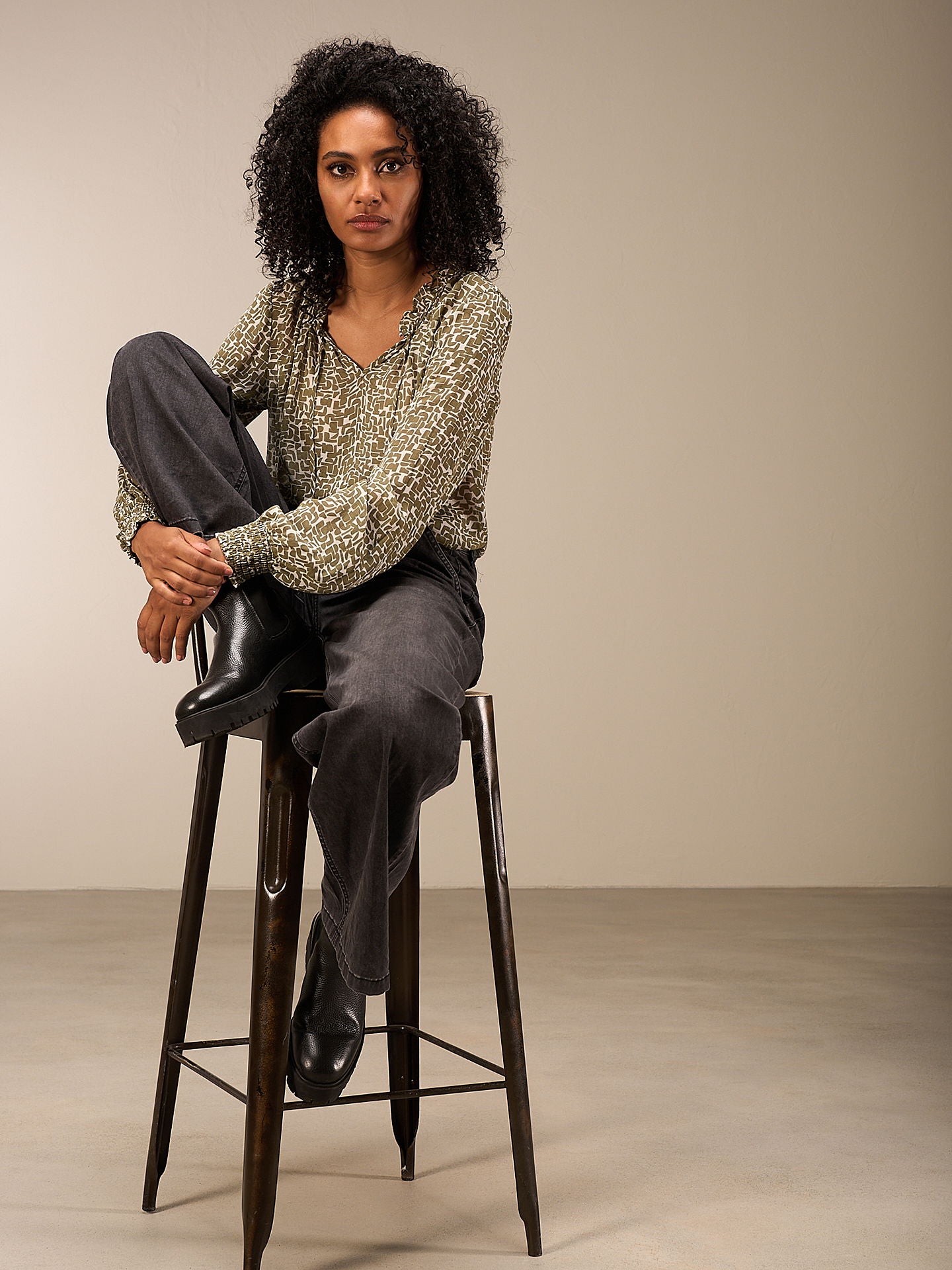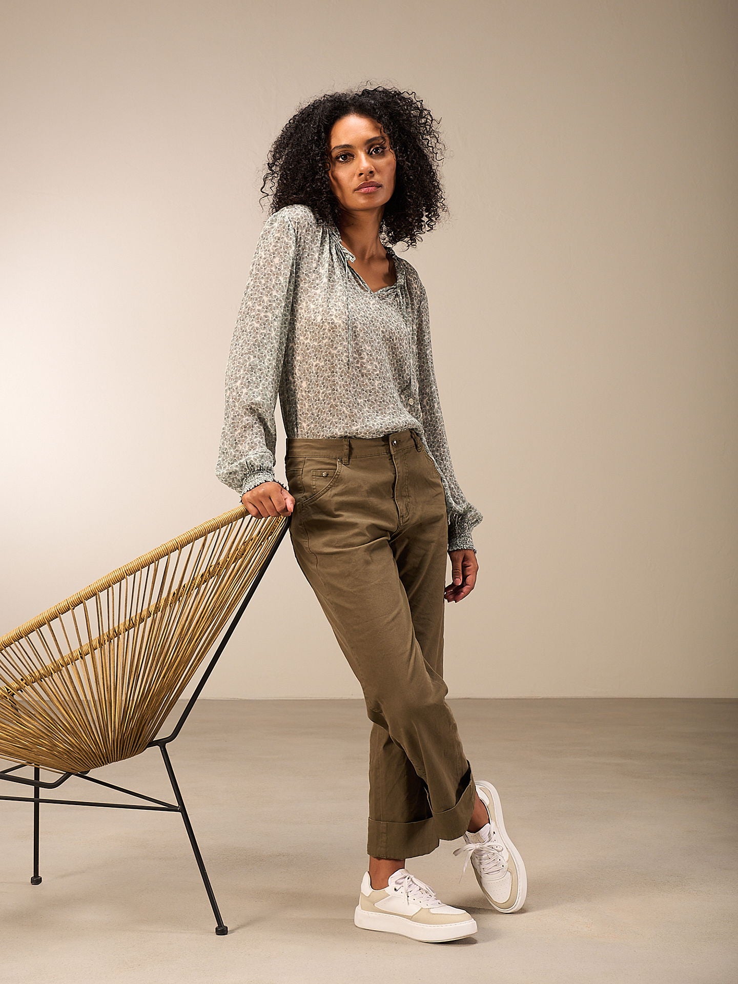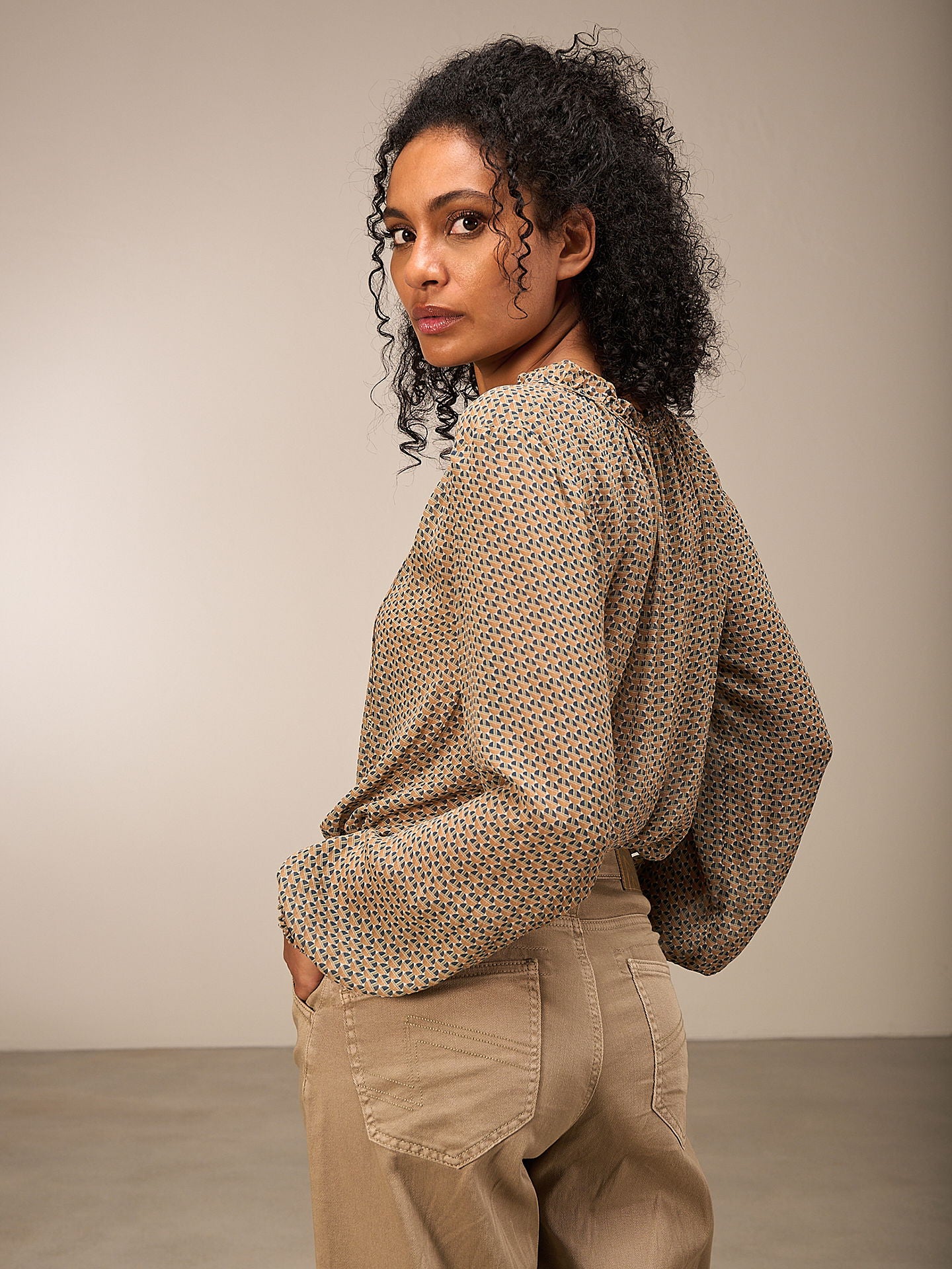 Chemisier légèrement cintré d'aspect romantique avec un petit col montant à volants et des rubans décoratifs. Les manches longues ont une finition décorative smockée aux poignets. L'impression allover dessinée à la main complète le look de la blouse. 100% Eco Viscose, issue de la gestion durable du bois.