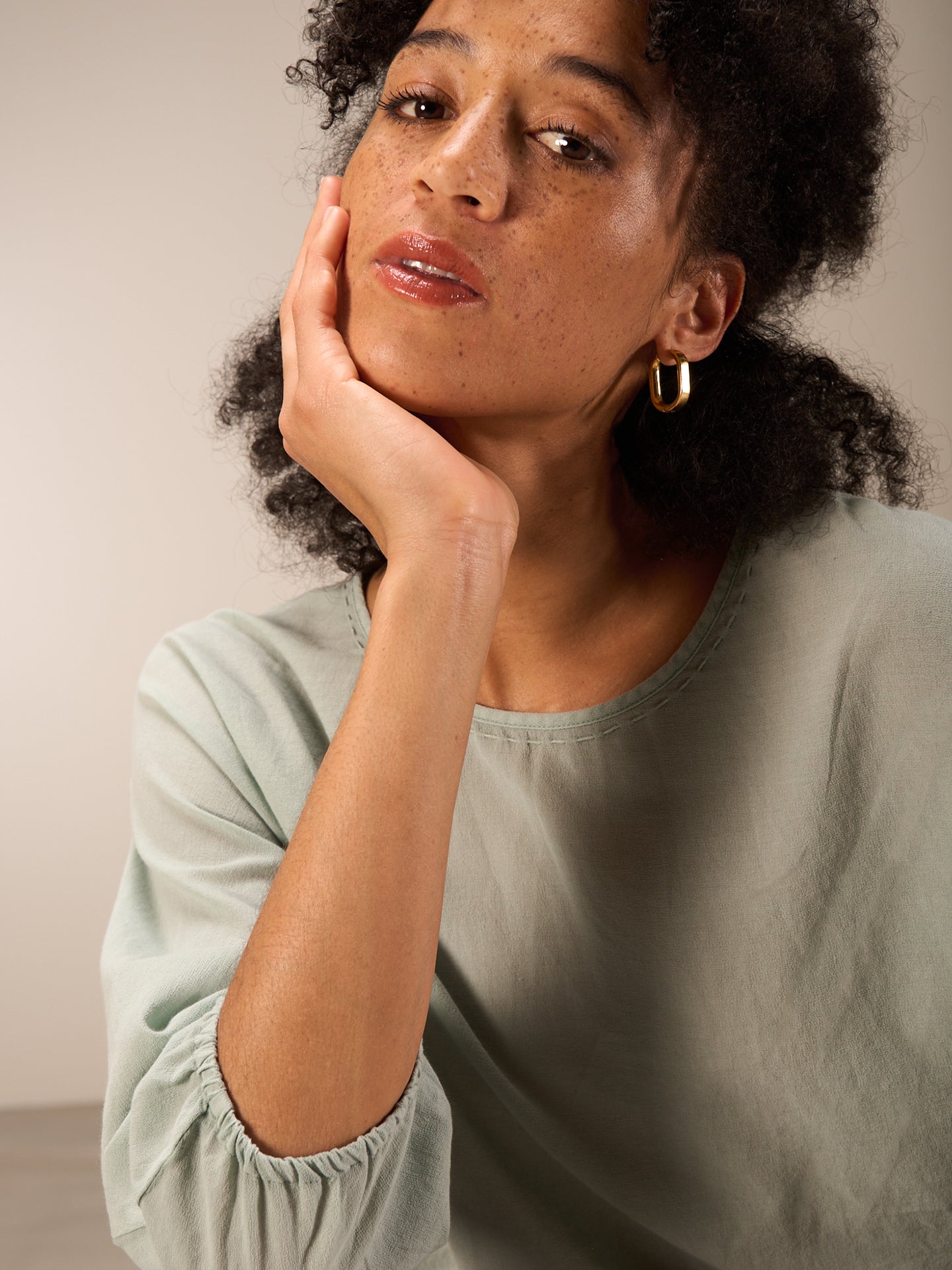 Chemisier 3/4 décontracté en teinture pigmentaire avec une encolure ronde et une finition élastique sur les manches. Le cordon de serrage à la taille permet d'obtenir différentes largeurs de chemisier. Le coton 100% bio issu de cultures certifiées confère à la blouse un confort estival léger.