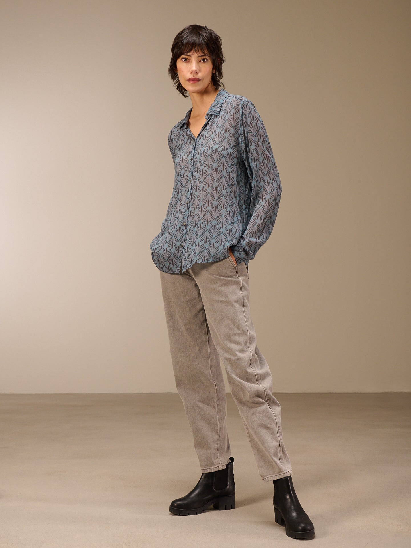 Chemisier cintré à col chemise boutonné, ourlet légèrement arrondi, patte de boutonnage dissimulée et manches longues à poignets, dans une mousseline très appréciée, avec imprimé intégral dessiné à la main.