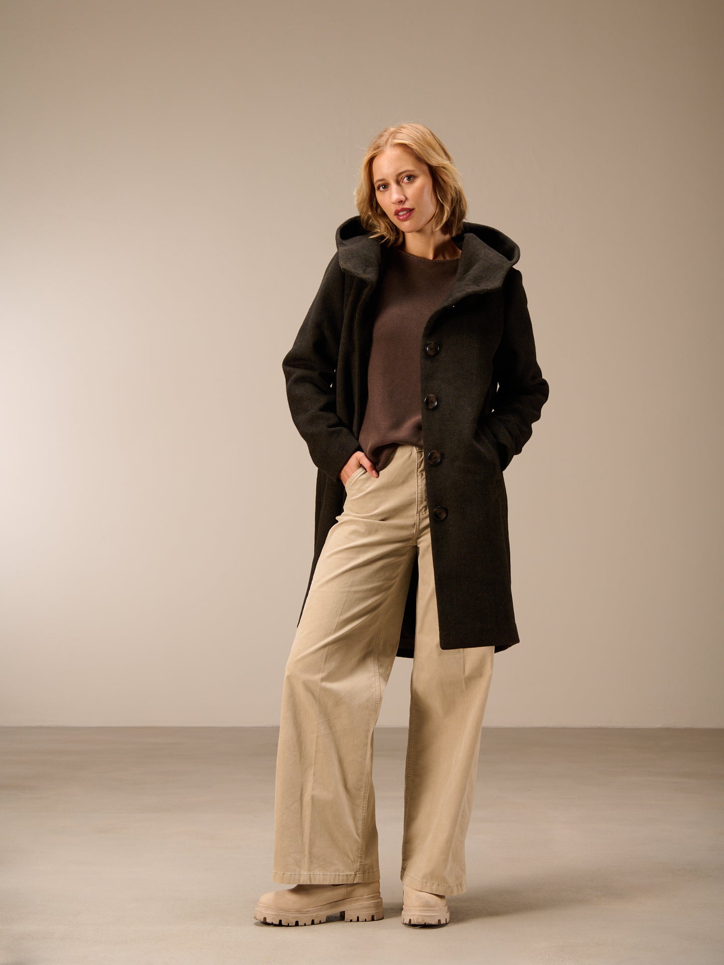 Manteau légèrement doublé à la silhouette confortable, avec patte de boutonnage, capuche décorative et poches latérales. Laine feutrée douce, agréablement légère mais chaude.