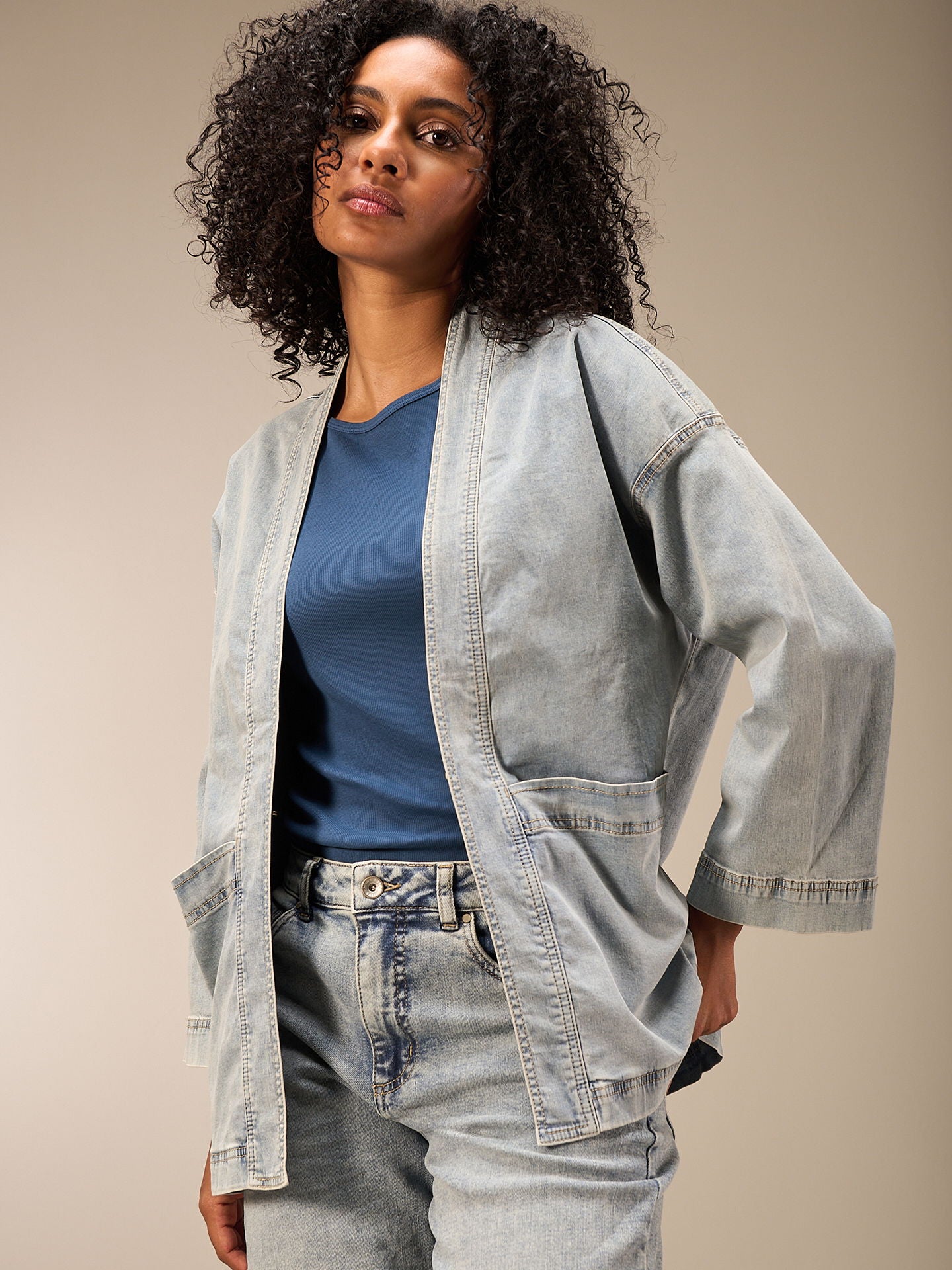 Veste inspirée du kimono avec de grandes poches plaquées et une fine fermeture à crochets. La veste garantit un confort agréable grâce à un denim fin dans des lavages denim classiques. Les irrégularités de la couleur rendent la pièce unique. L'effet de décoloration est renforcé. Le produit peut déteindre sur les vêtements et les surfaces.
