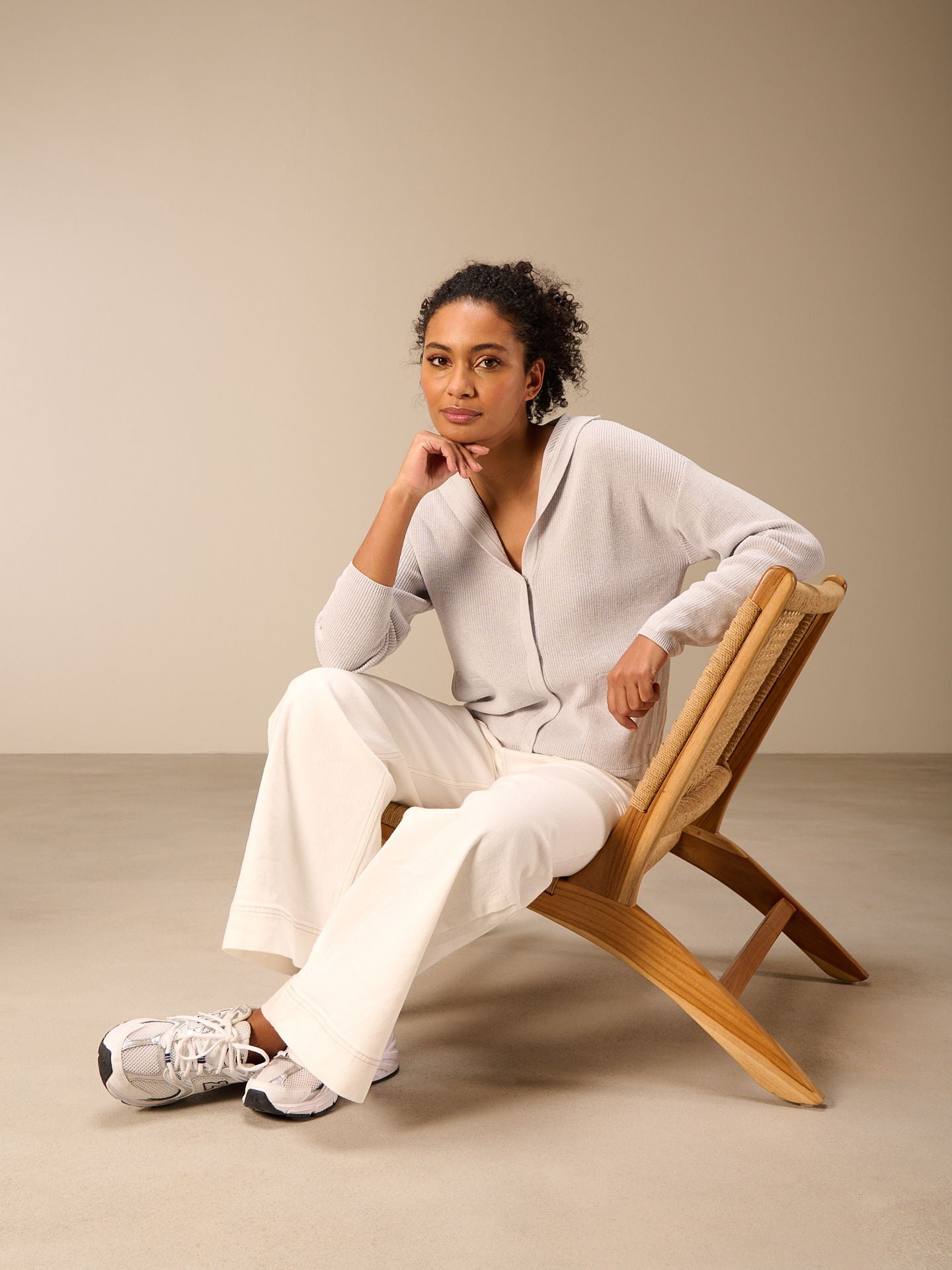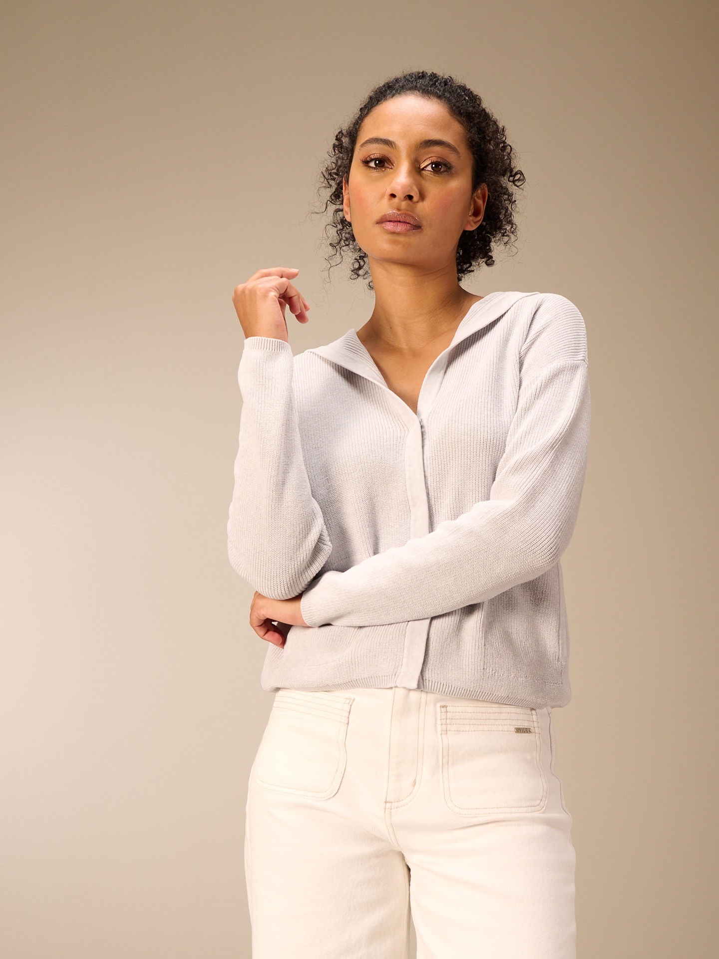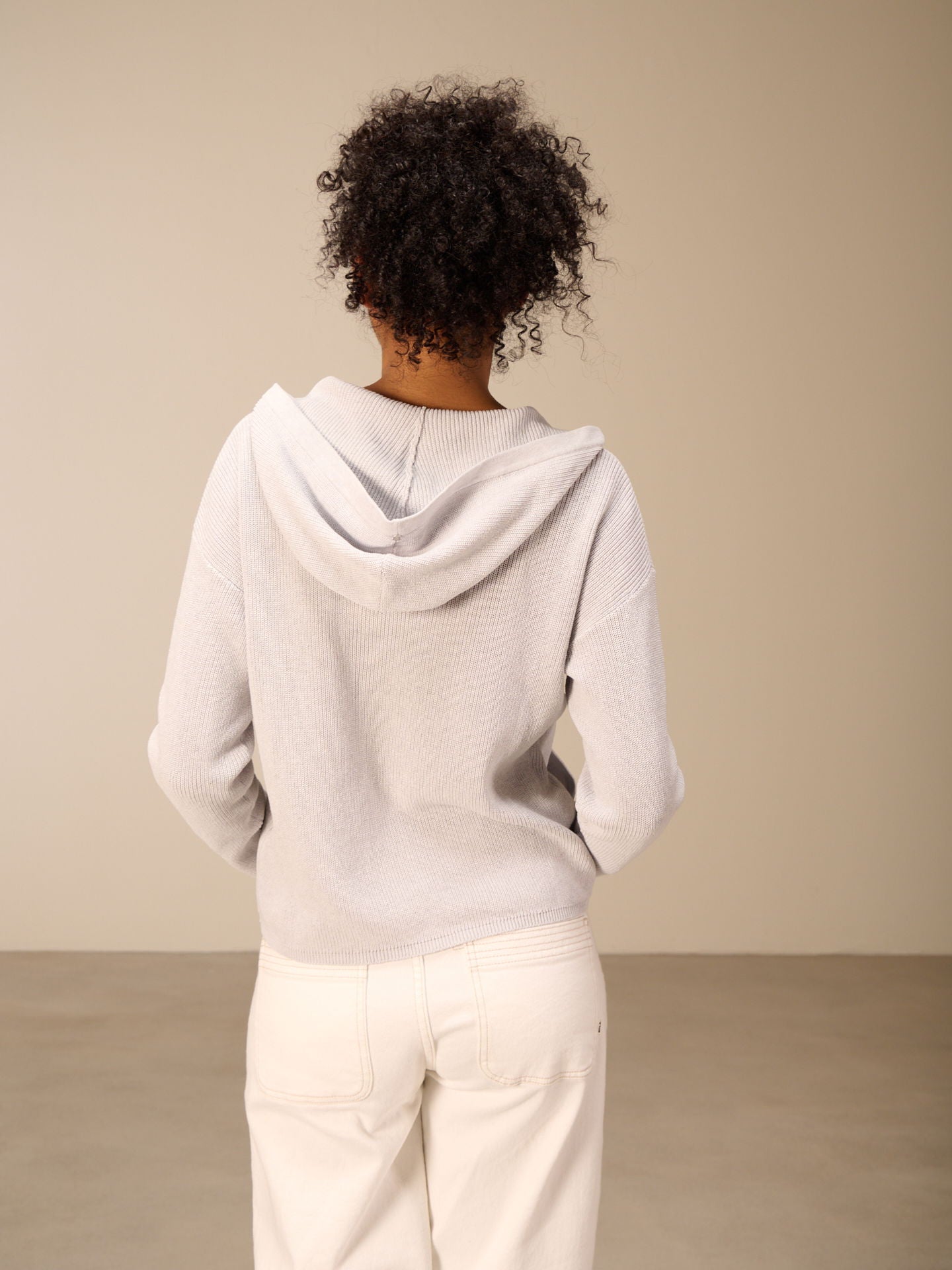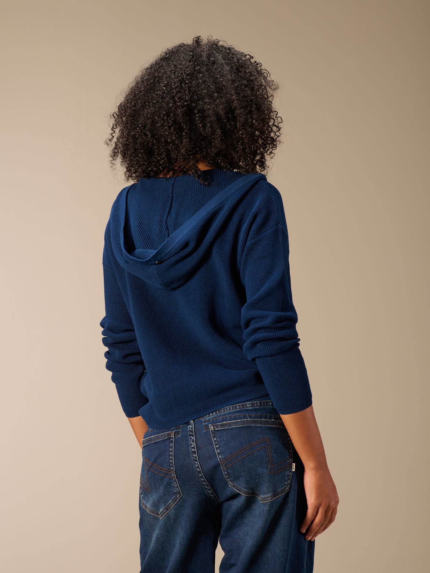 Cardigan ample fermé par des boutons-pression métalliques, avec épaules tombantes, capuche et poches latérales.
