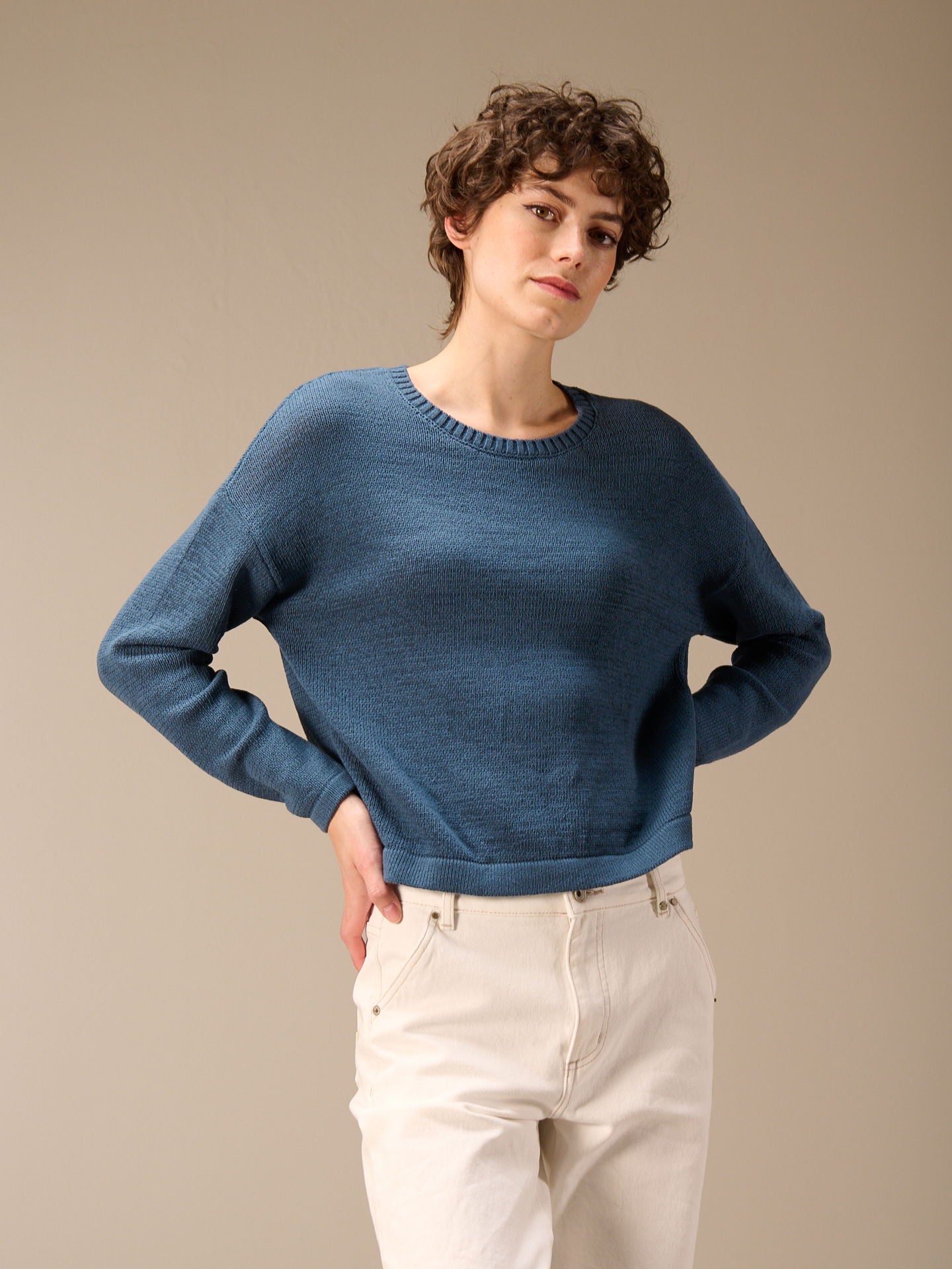 Pull droit à encolure ronde et épaules tombantes. Le fil ruban et le point jersey lui confèrent un aspect raffiné.
