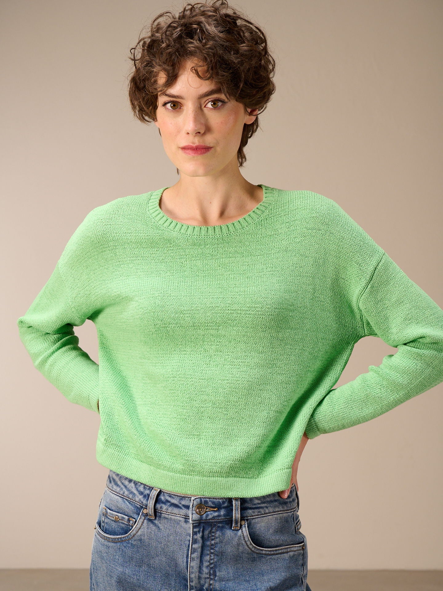 Pull droit à encolure ronde et épaules tombantes. Le fil ruban et le point jersey lui confèrent un aspect raffiné.