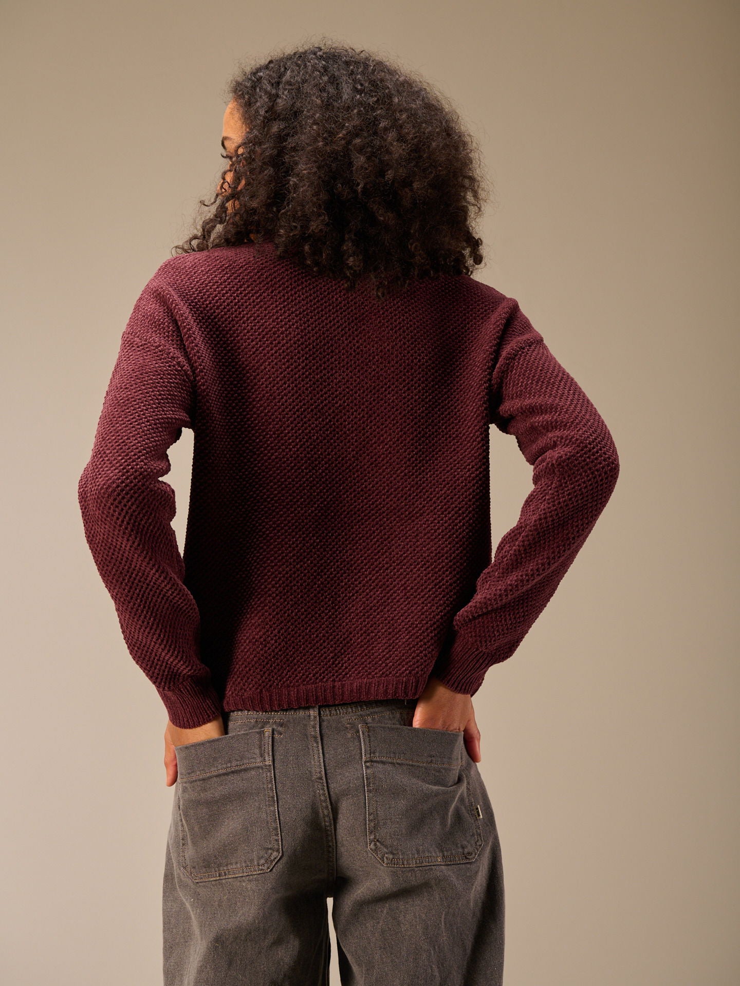 Pull en maille ample avec col montant souple, épaules très tombantes et motif breveté sur le devant. Le fil chenille moelleux fait de ce pull un vêtement incontournable.