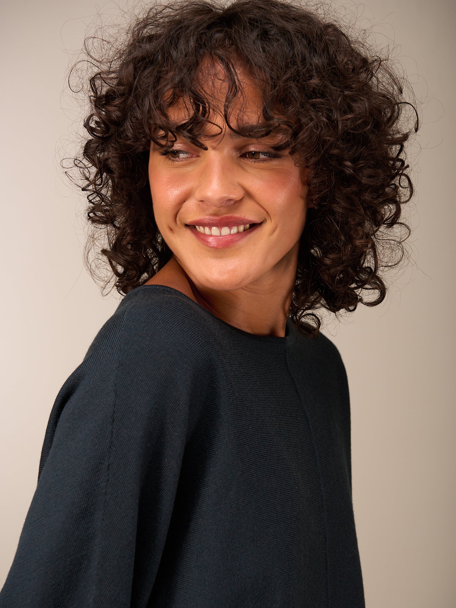 Pull à la mode de coupe large en fil mélangé spécial avec de larges manches chauve-souris, une couture décorative et une encolure ronde. Particulièrement beau avec des formes de pantalons larges.