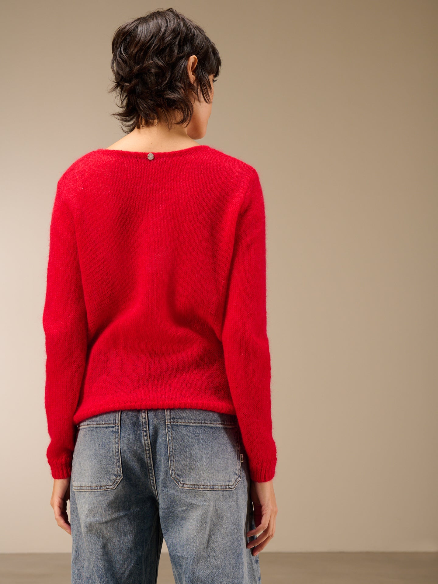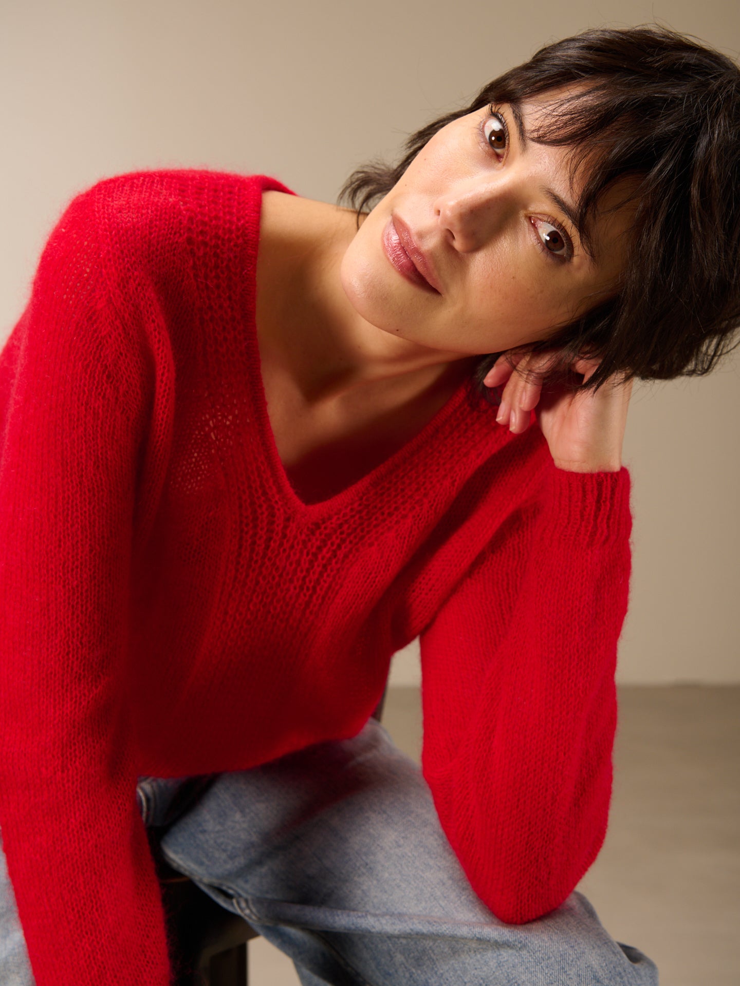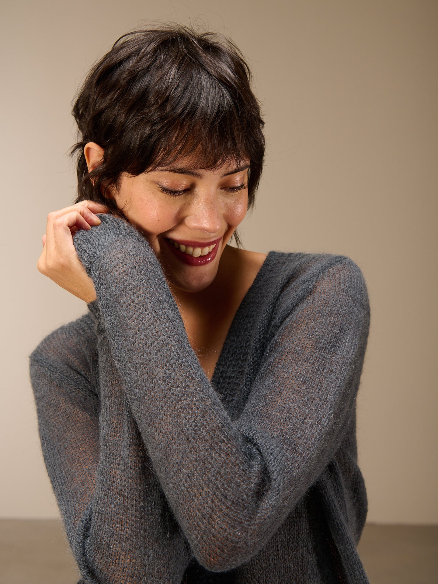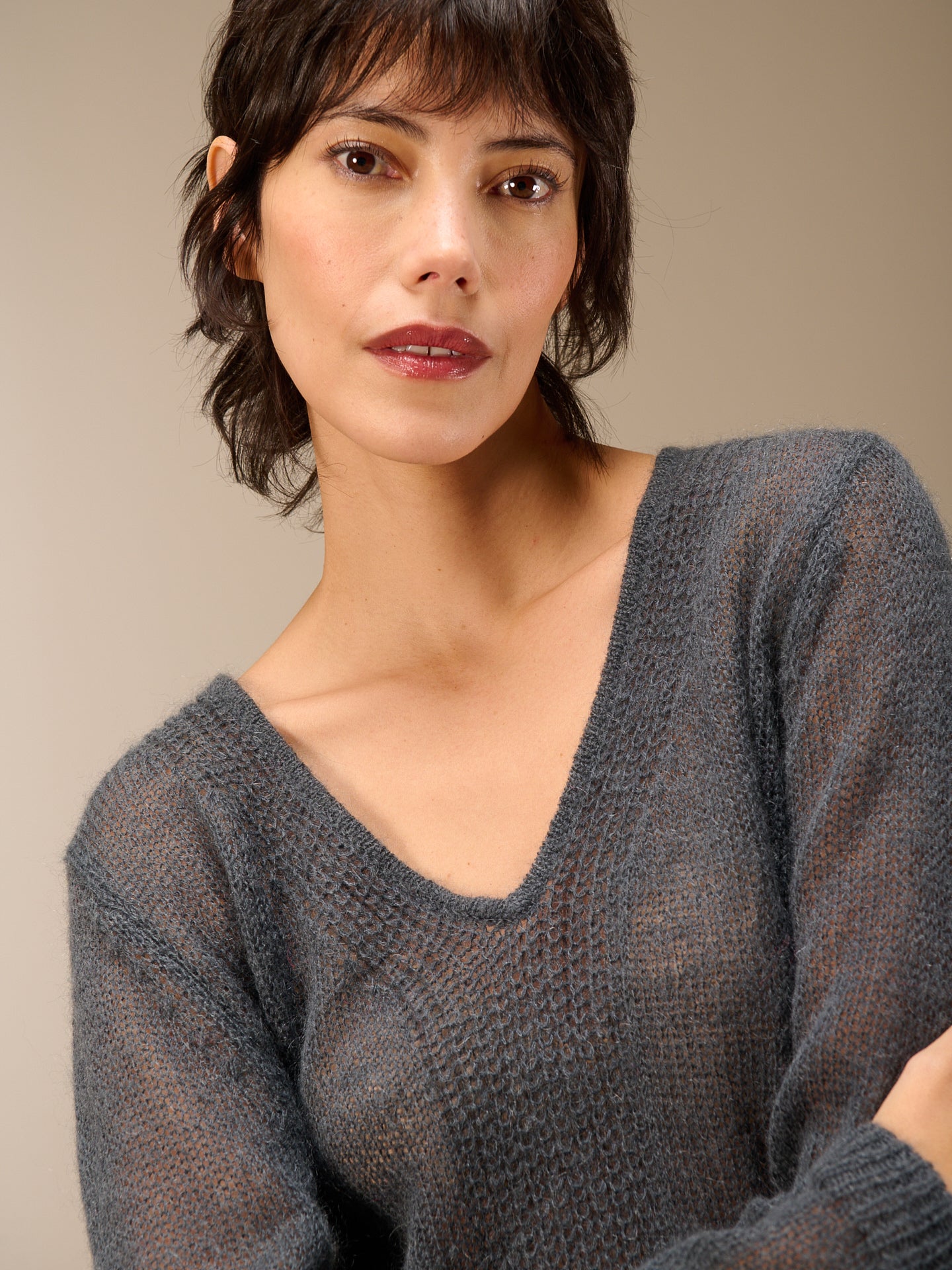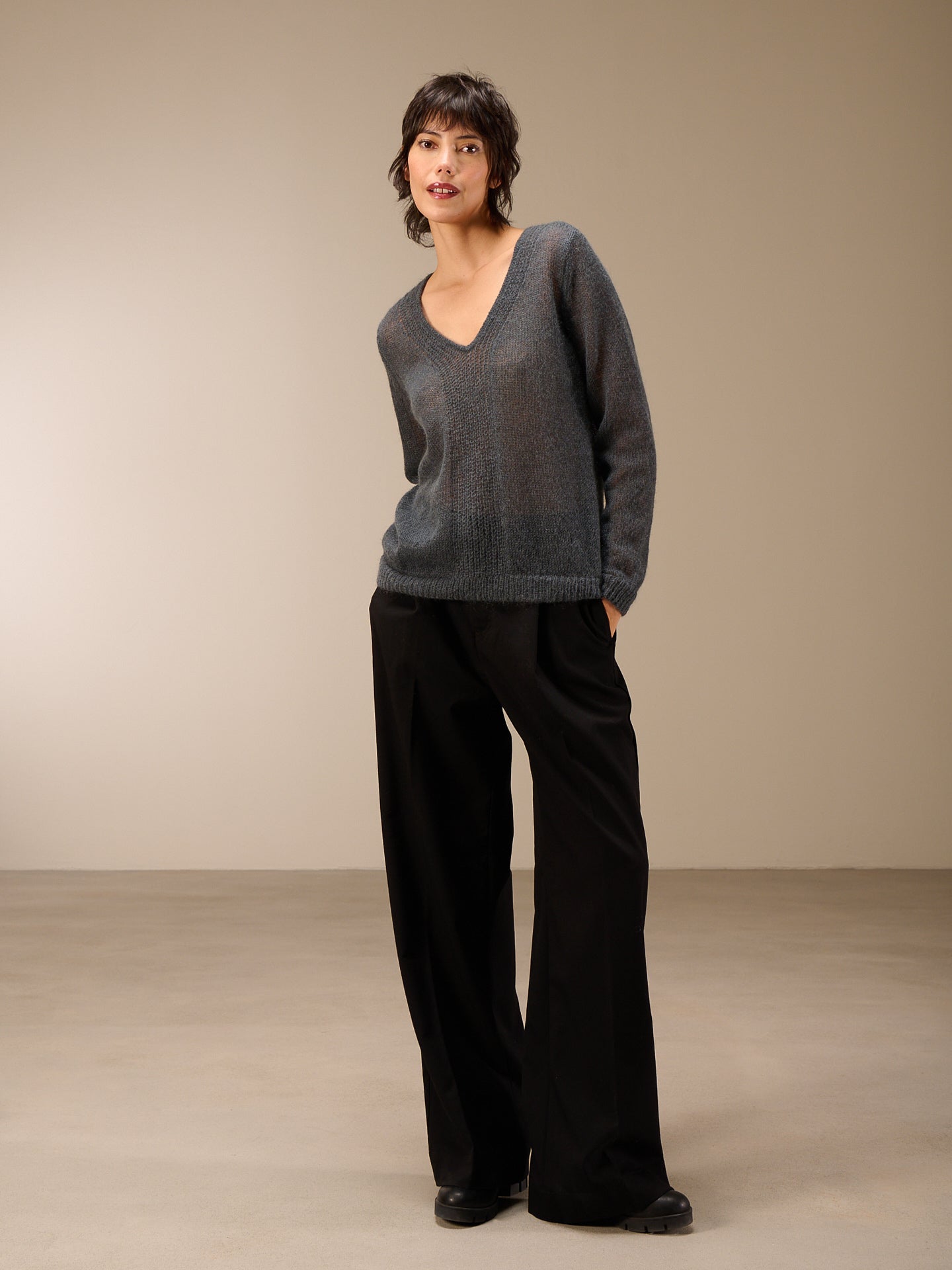 Pull ample avec épaules légèrement tombantes et encolure en V, dans une matière légèrement transparente. Bordure côtelée décorative au milieu devant et sur les manches et l'ourlet.