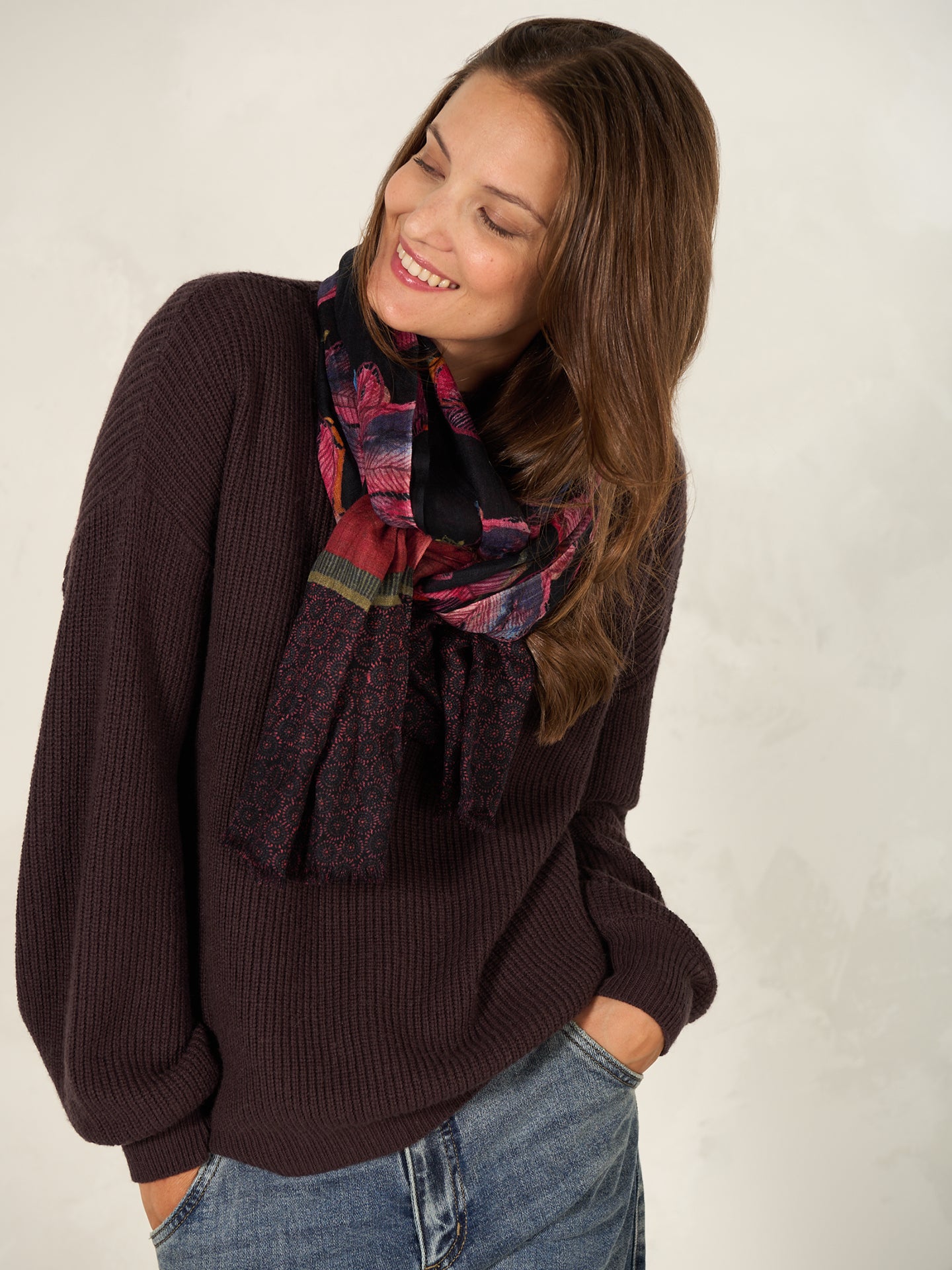 Echarpe décorative et chaude de 70 x 200 cm, 100% laine. L'écharpe est entièrement imprimée d'imprimés dessinés à la main et a des bords plus courts avec des franges, ce qui en fait un compagnon parfait pour l'intérieur et l'extérieur.