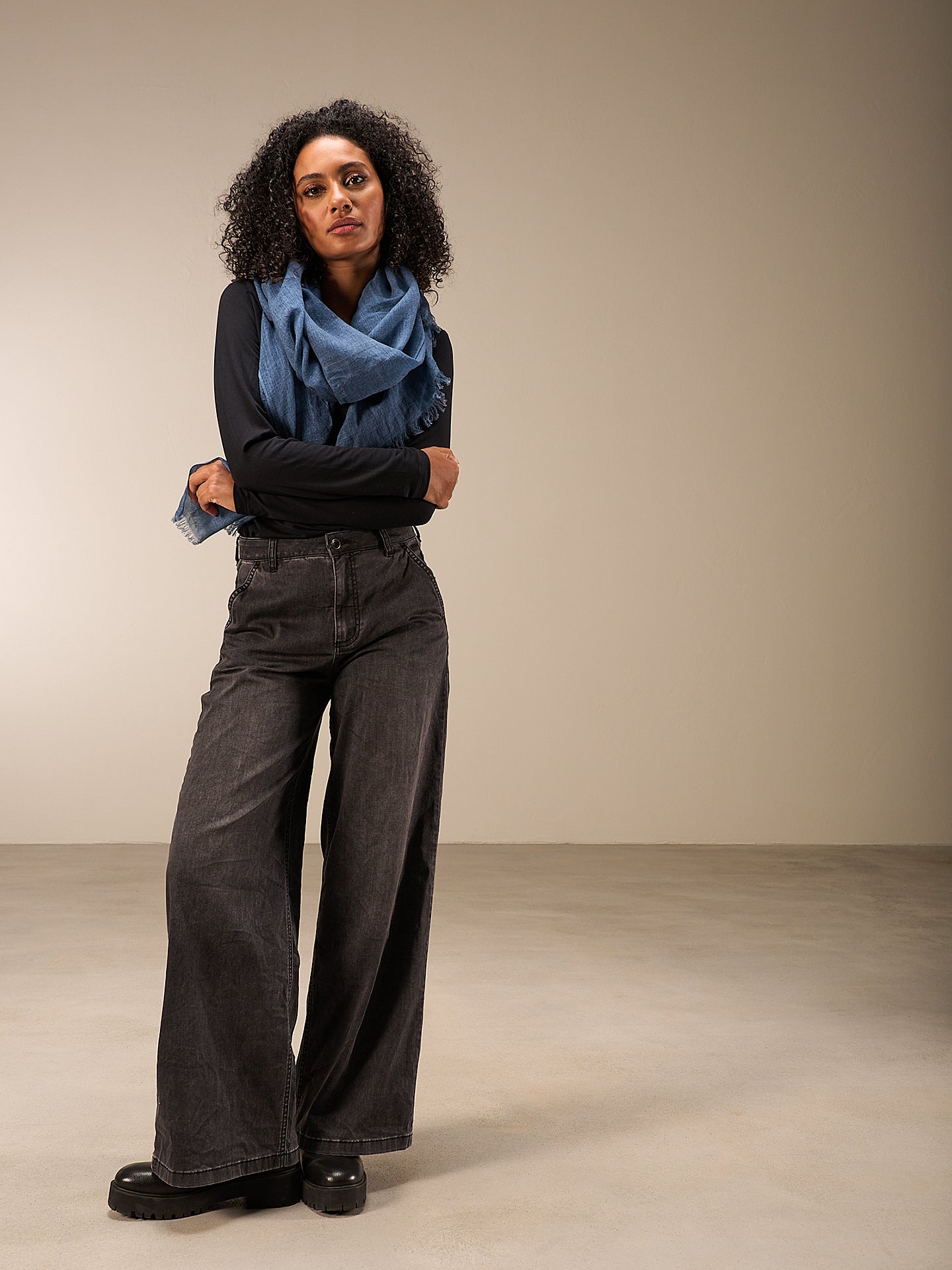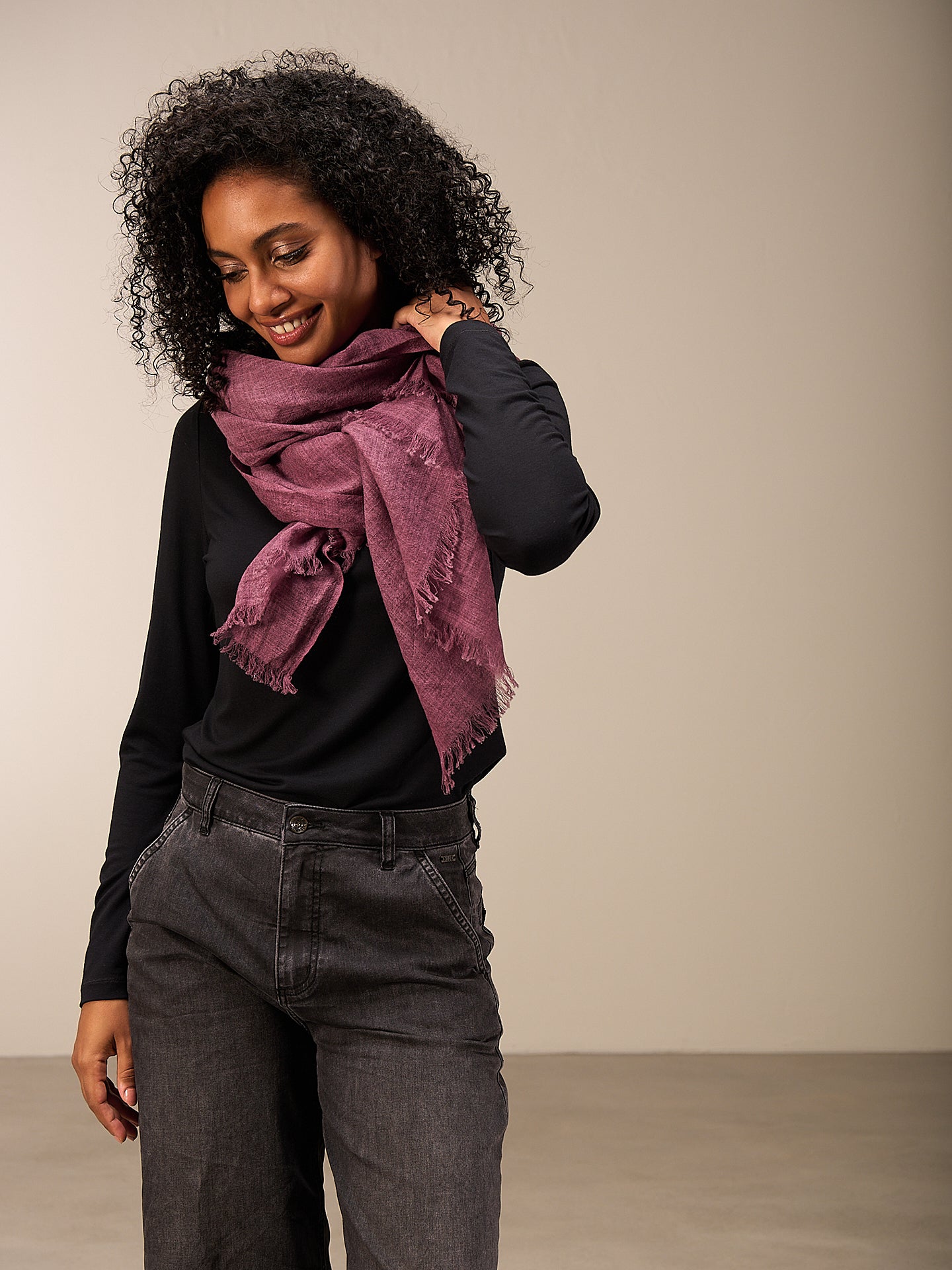 Écharpe unie de 75 x 200 cm. 100 % laine avec bord tissé et franges courtes. Un procédé de teinture spécial confère à cette écharpe un joli aspect délavé. Les irrégularités de couleur rendent cette pièce unique. L'effet délavé s'accentue au lavage.