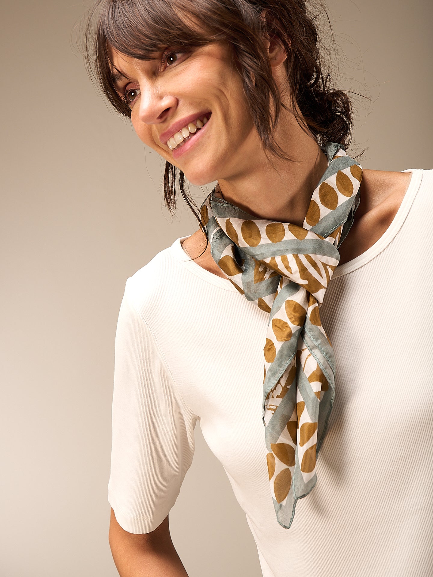 Écharpe carrée à l'imprimé allover et aux bords piqués, de taille 90x90cm. 100% soie avec une brillance raffinée.