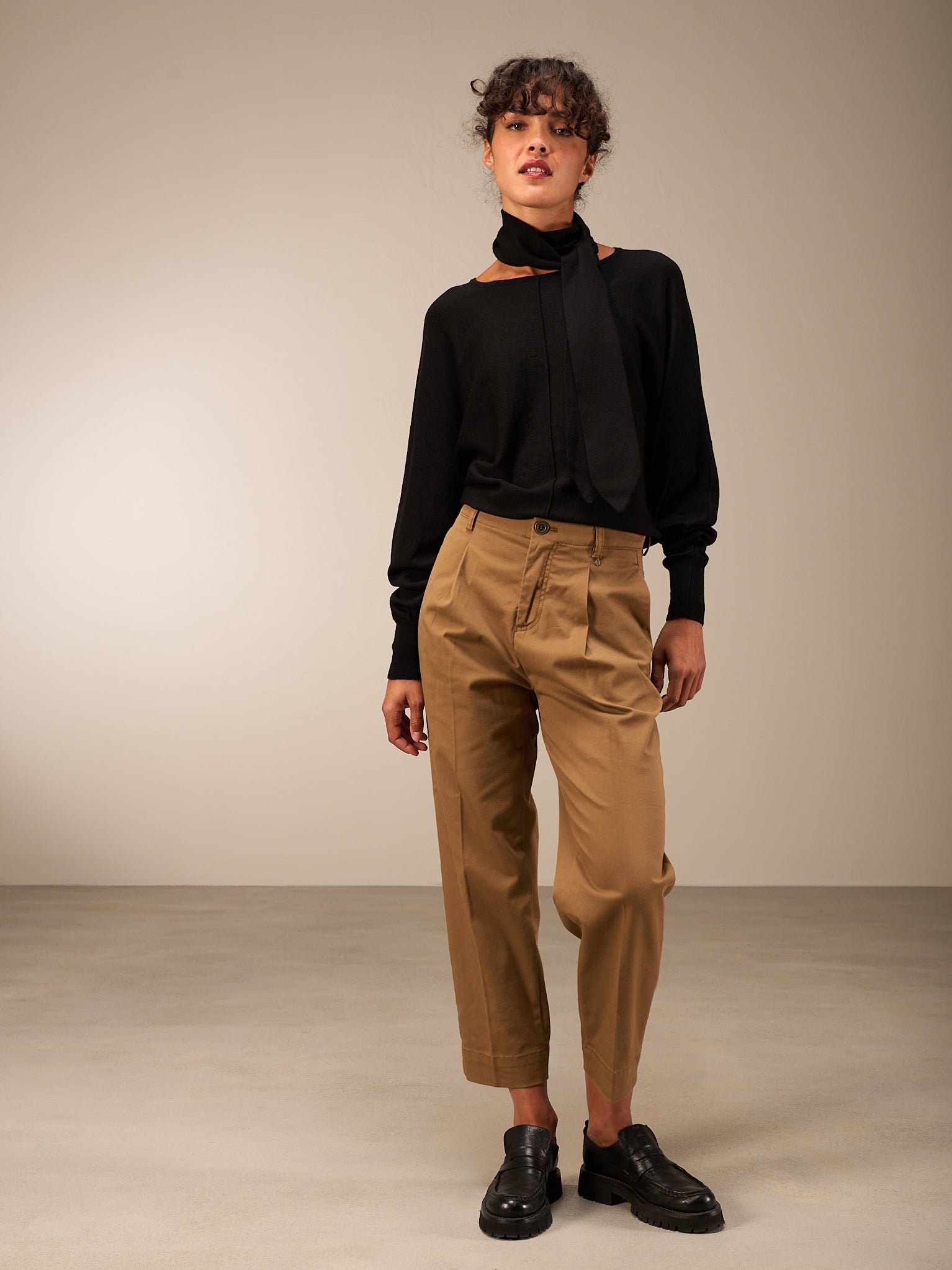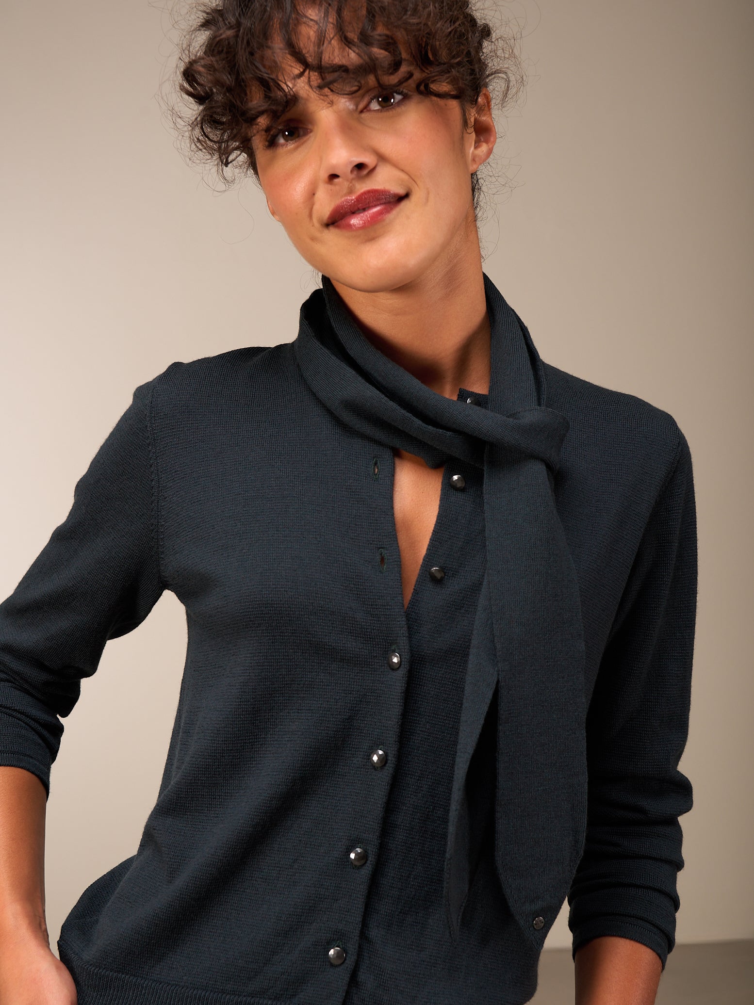 Longue et étroite écharpe décorative en fil mélangé spécial. Peut être stylisée de différentes manières, comme une cravate, un nœud ou une ceinture et complète chaque tenue.
