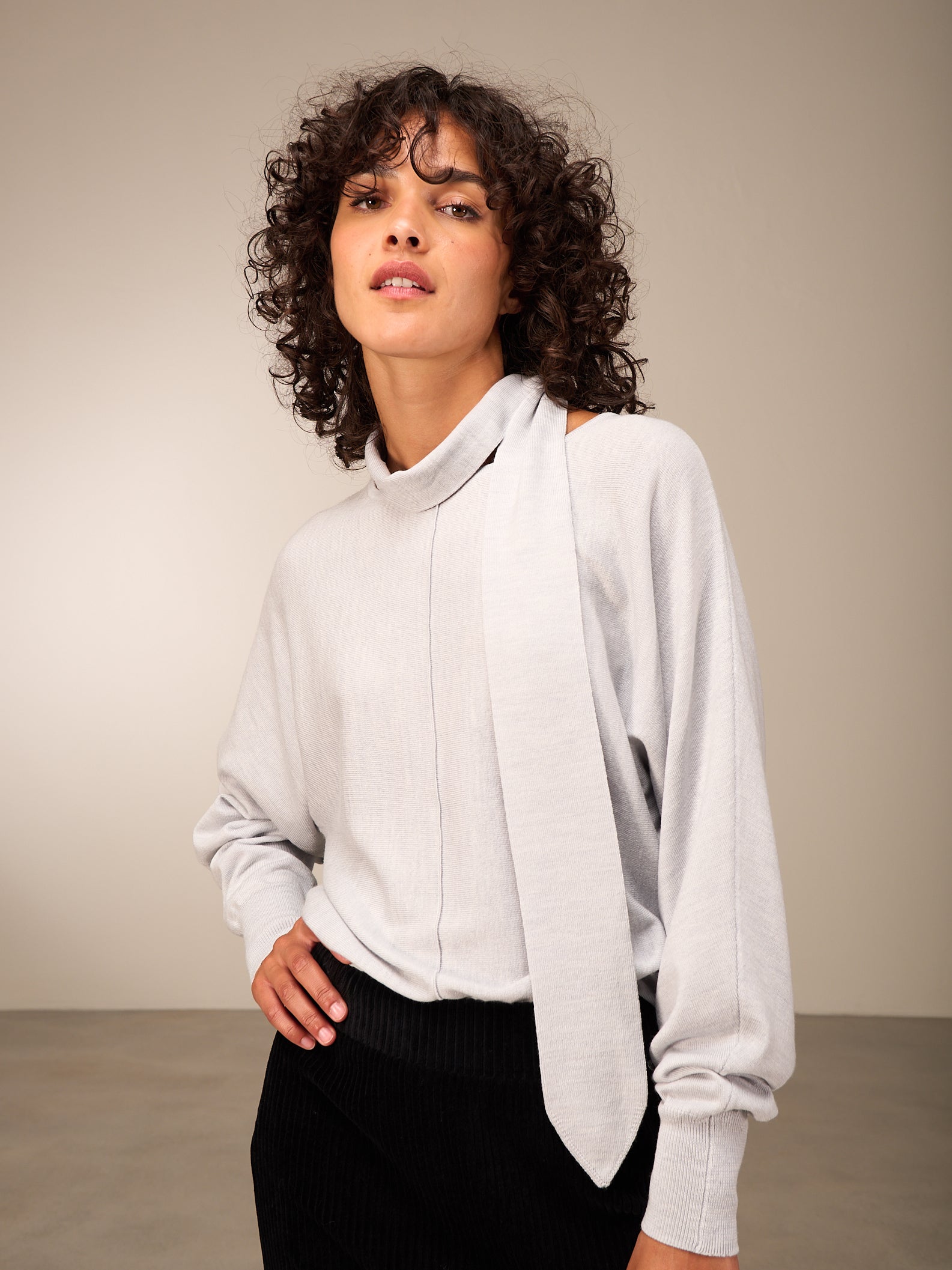 Longue et étroite écharpe décorative en fil mélangé spécial. Peut être stylisée de différentes manières, comme une cravate, un nœud ou une ceinture et complète chaque tenue.