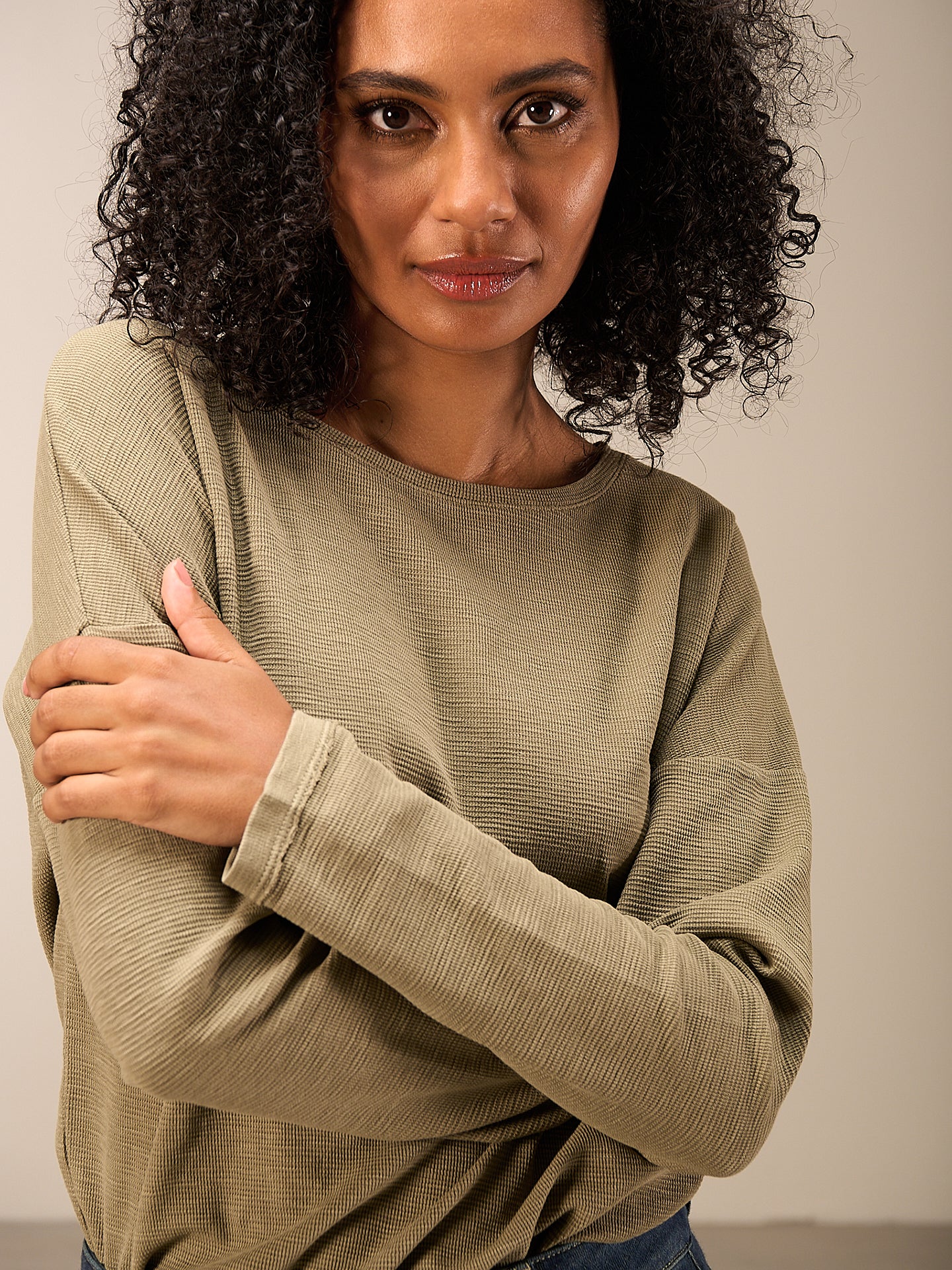 T-shirt casual à manches longues et col rond en jersey gaufré tricoté de haute qualité. Teint en pièce par procédé pigment-dye. 100% coton de qualité bio certifié GOTS.