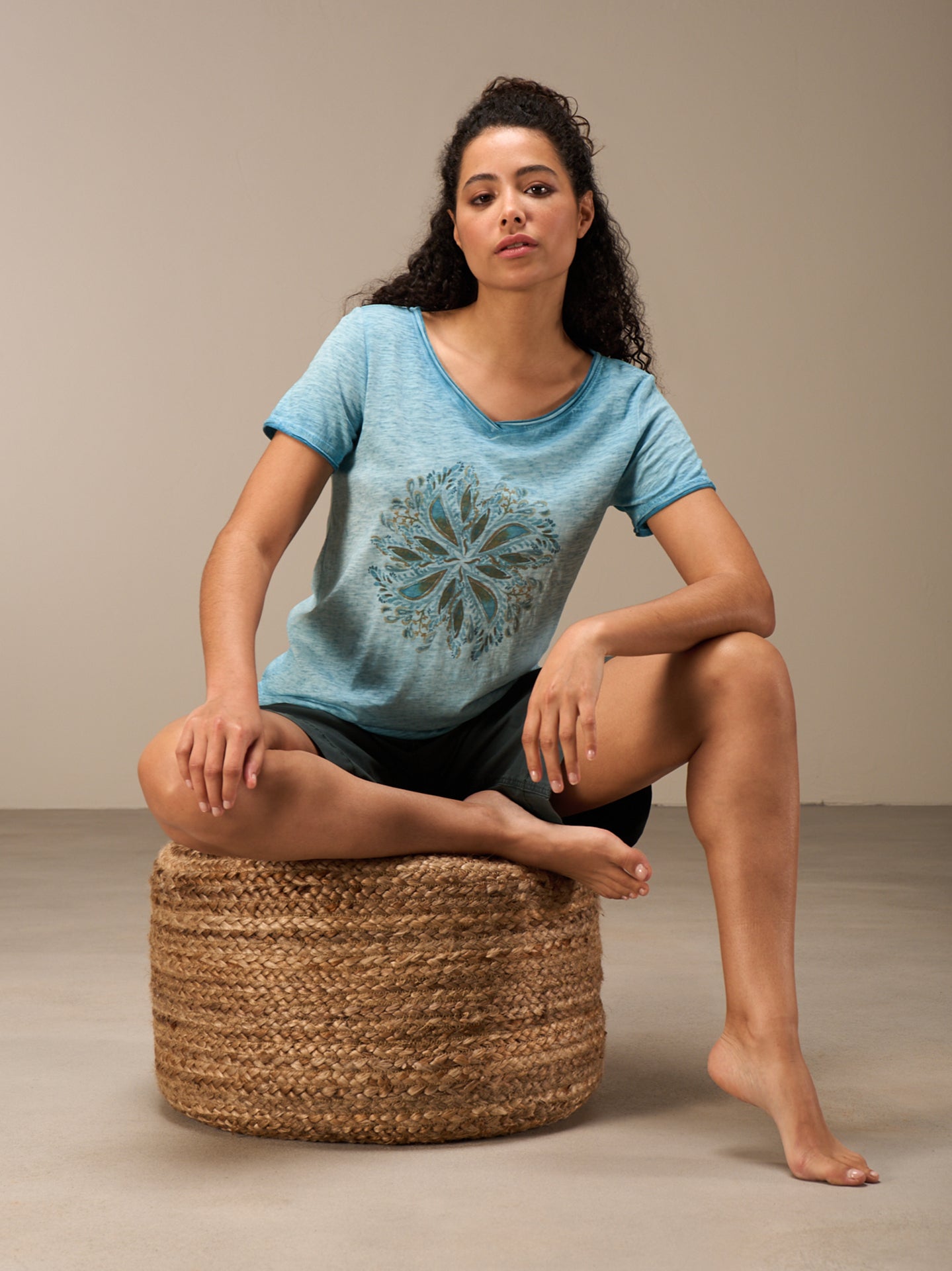 T-shirt à la coupe décontractée en jersey flammé avec un imprimé placé et une encolure en V à bords ouverts.