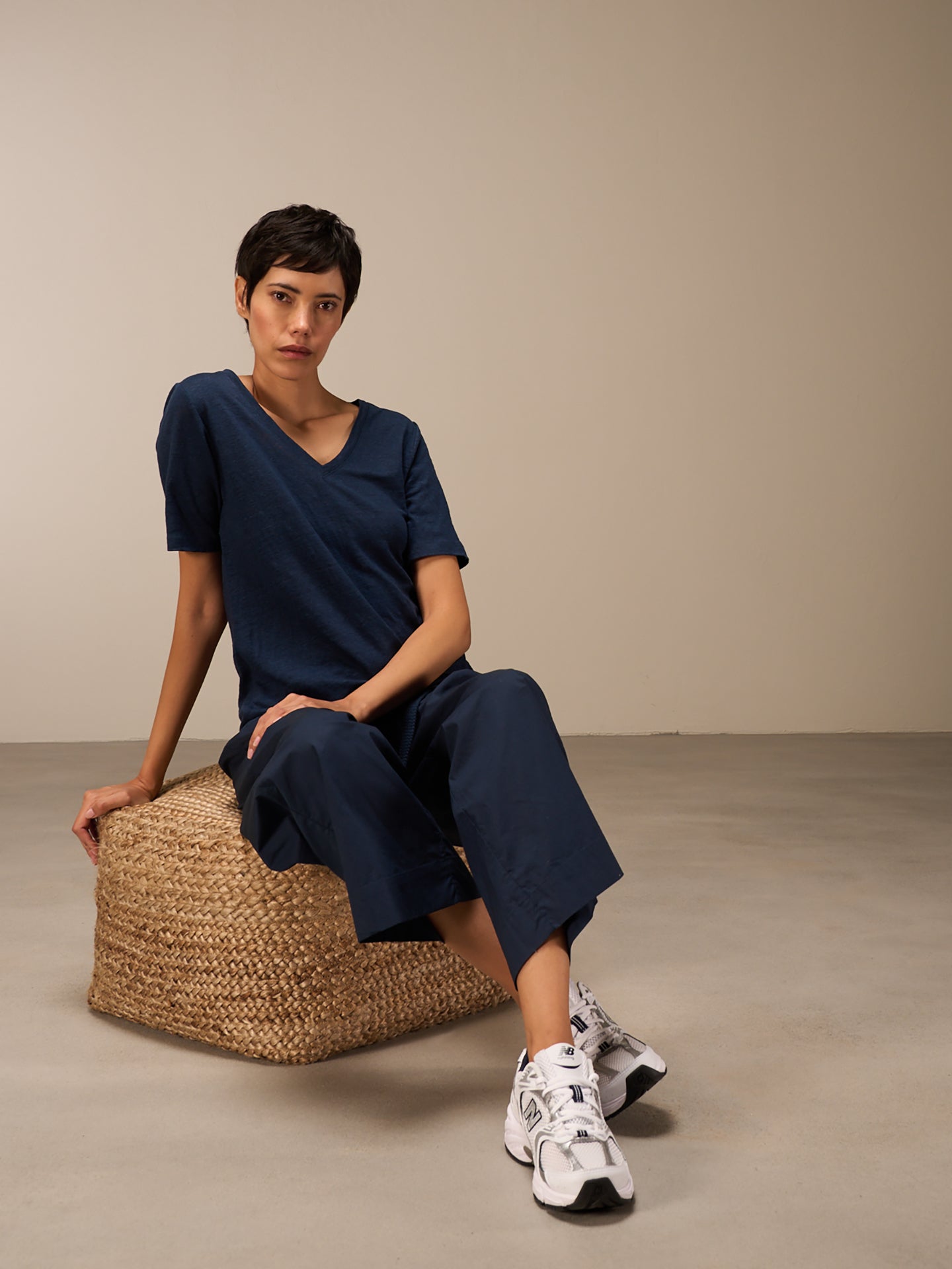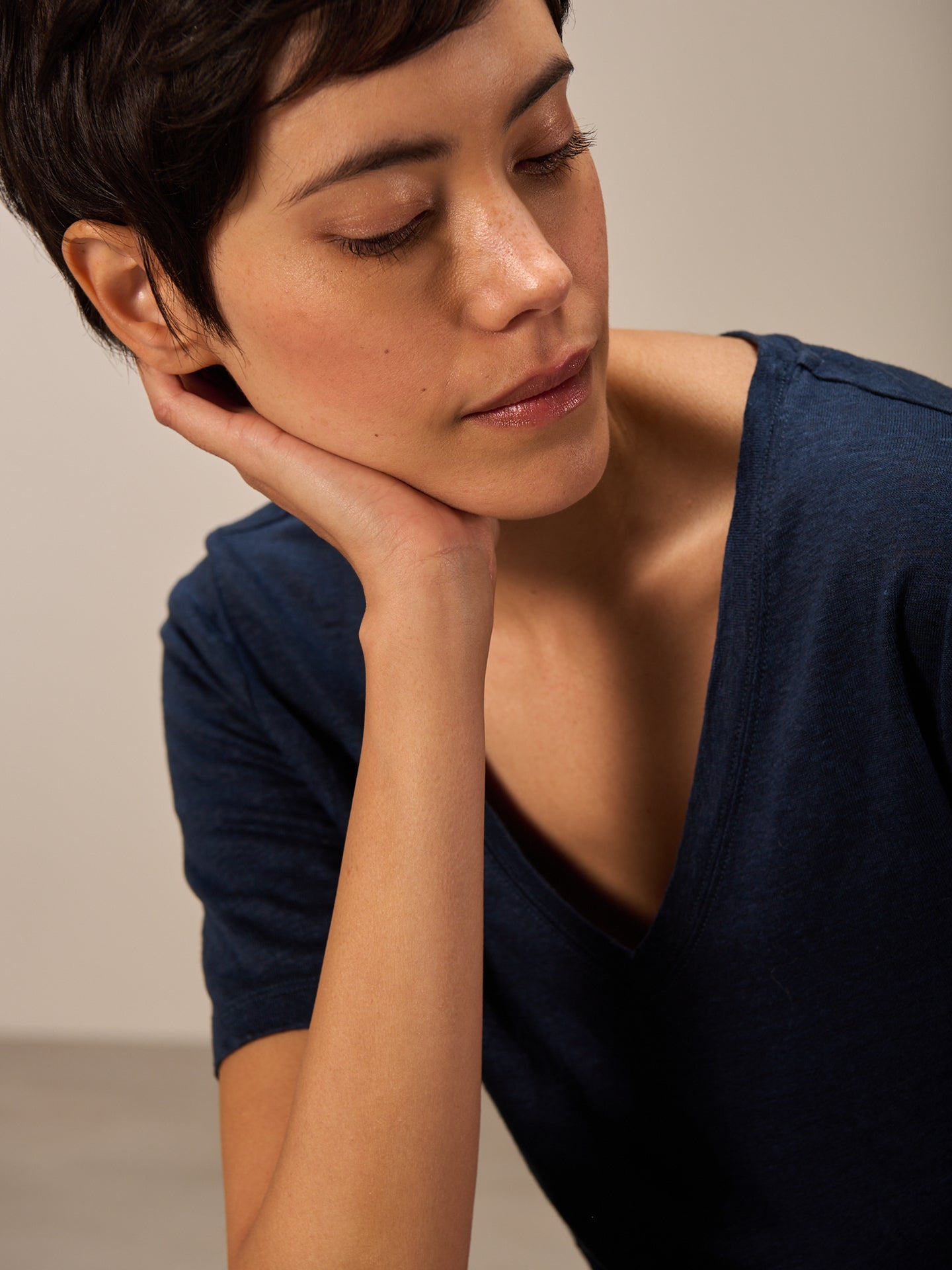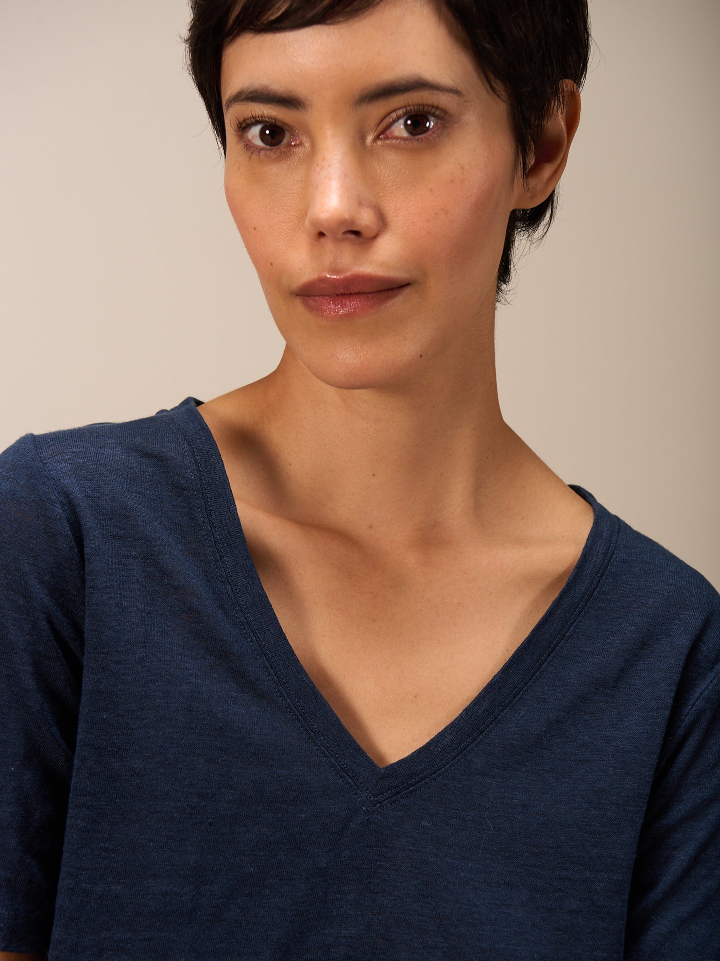 T-shirt à la coupe légère avec un col V et des coutures déco dans le dos, en lin de qualité supérieure.