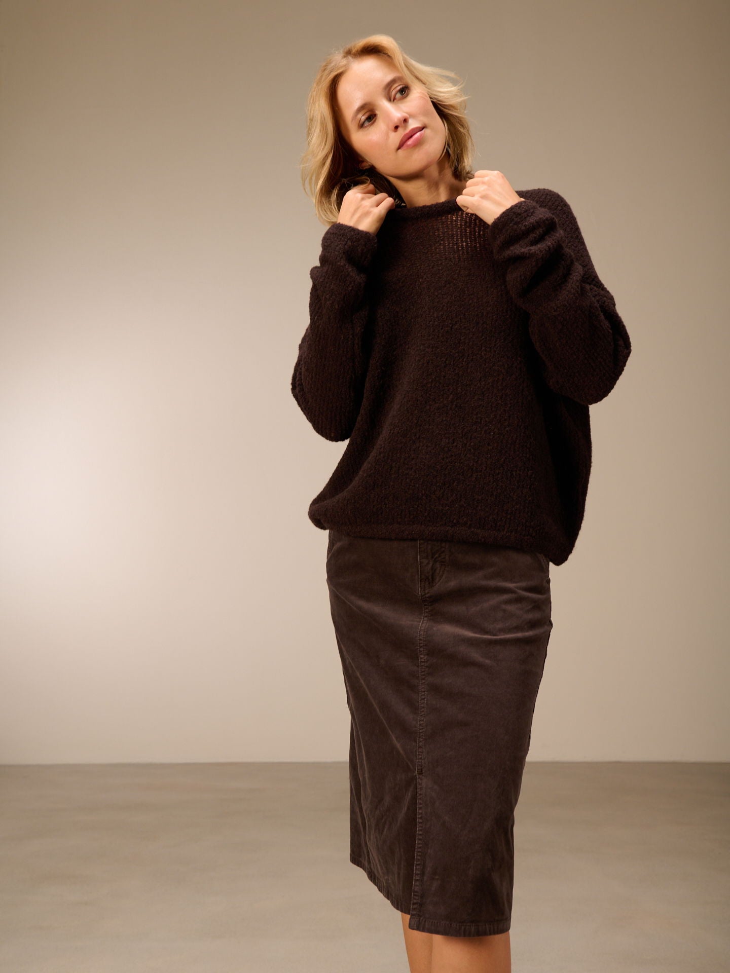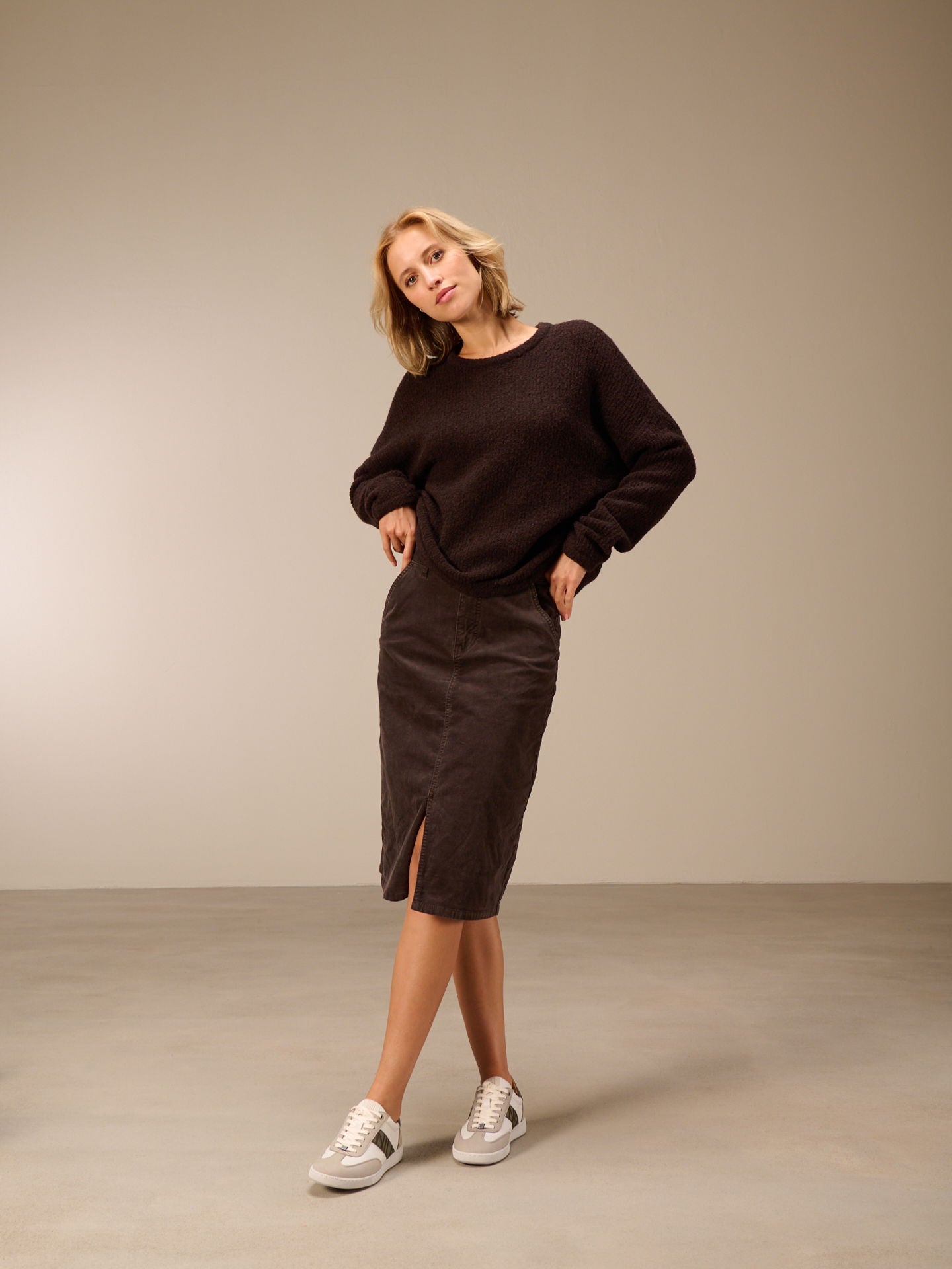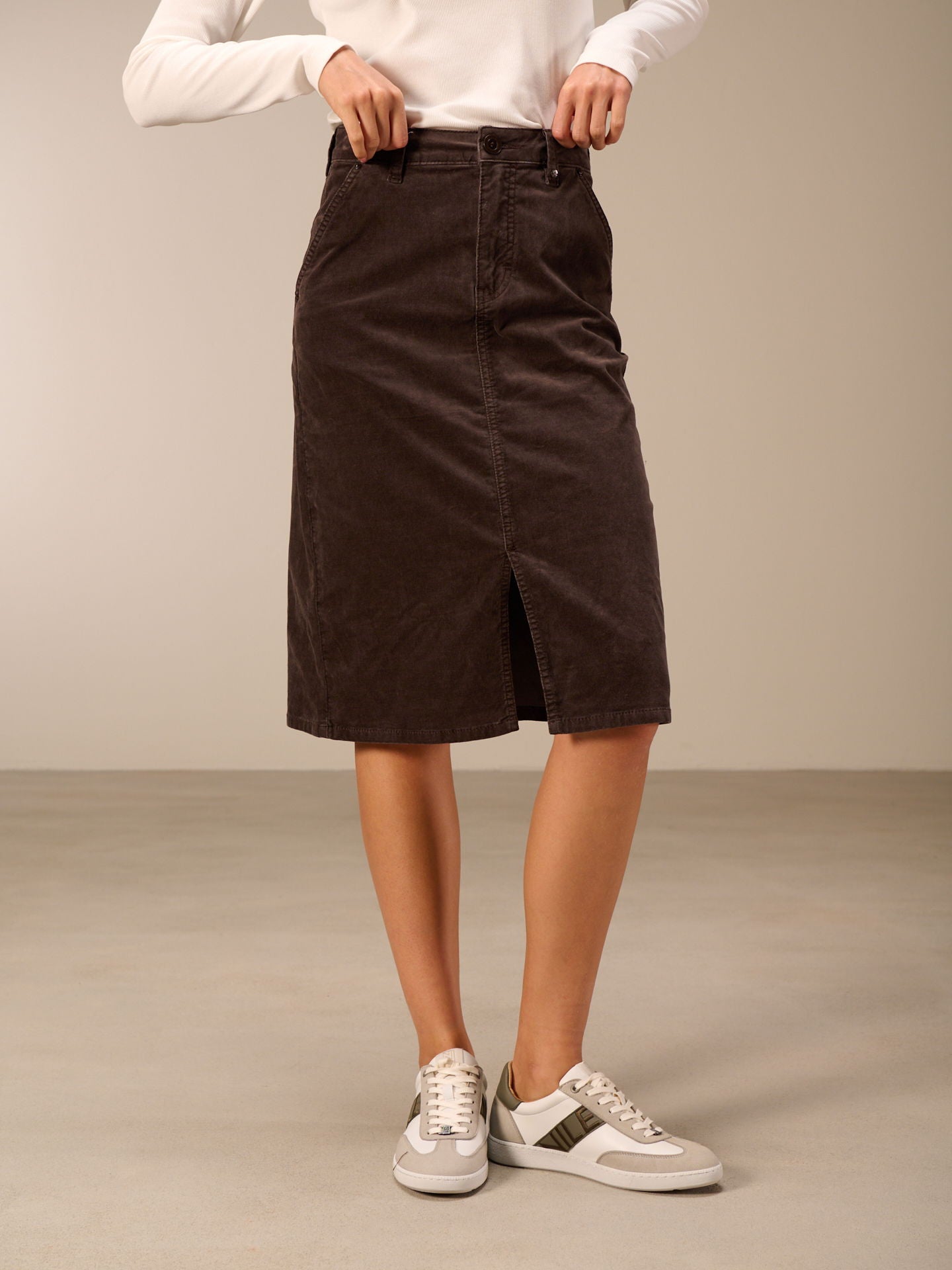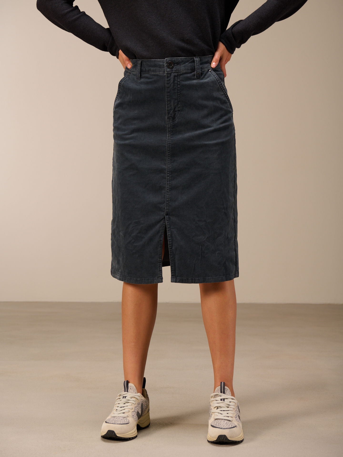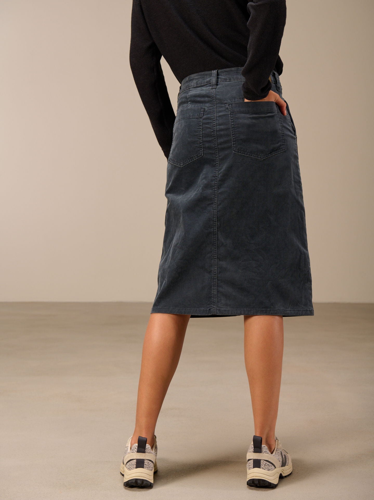 Jupe ajustée avec taille mi-haute et passants de ceinture, poches latérales à l'avant et poches plaquées à l'arrière. La jupe est teinte dans la masse, ce qui entraîne des irrégularités dans la couleur, renforce l'effet délavé et rend la pièce unique.