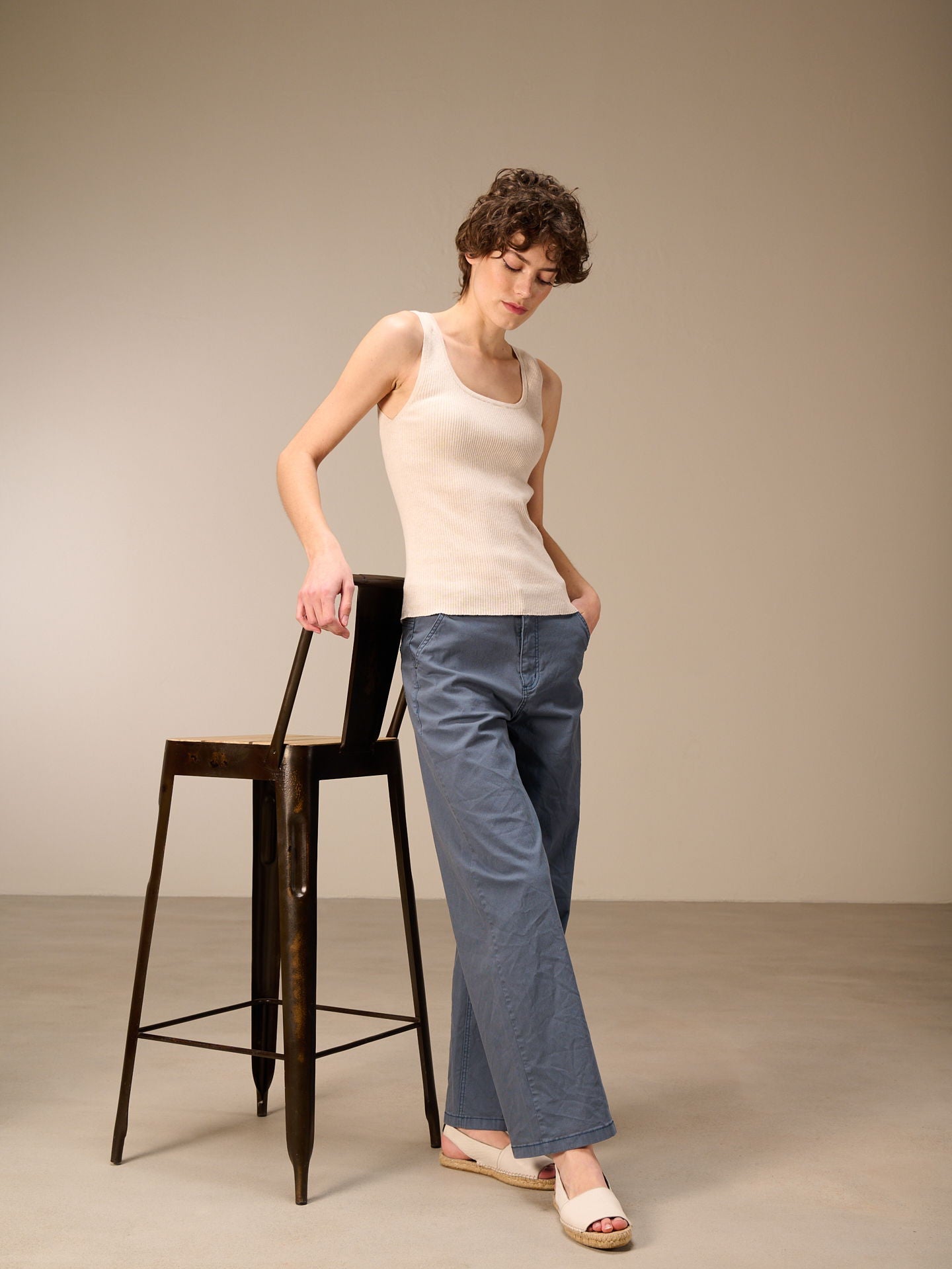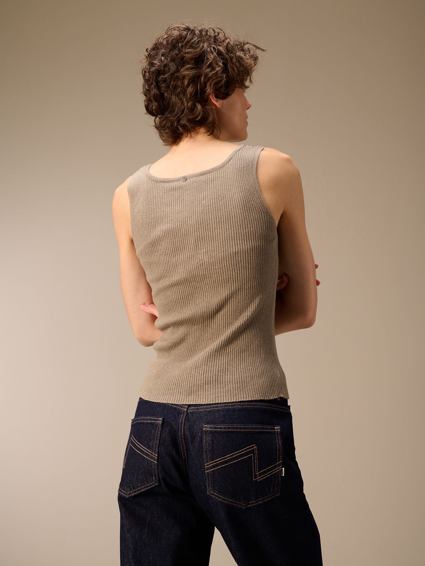 Top côtelé moulant à col rond tricoté en fil mélangé avec un coton 100% bio particulièrement valorisant.