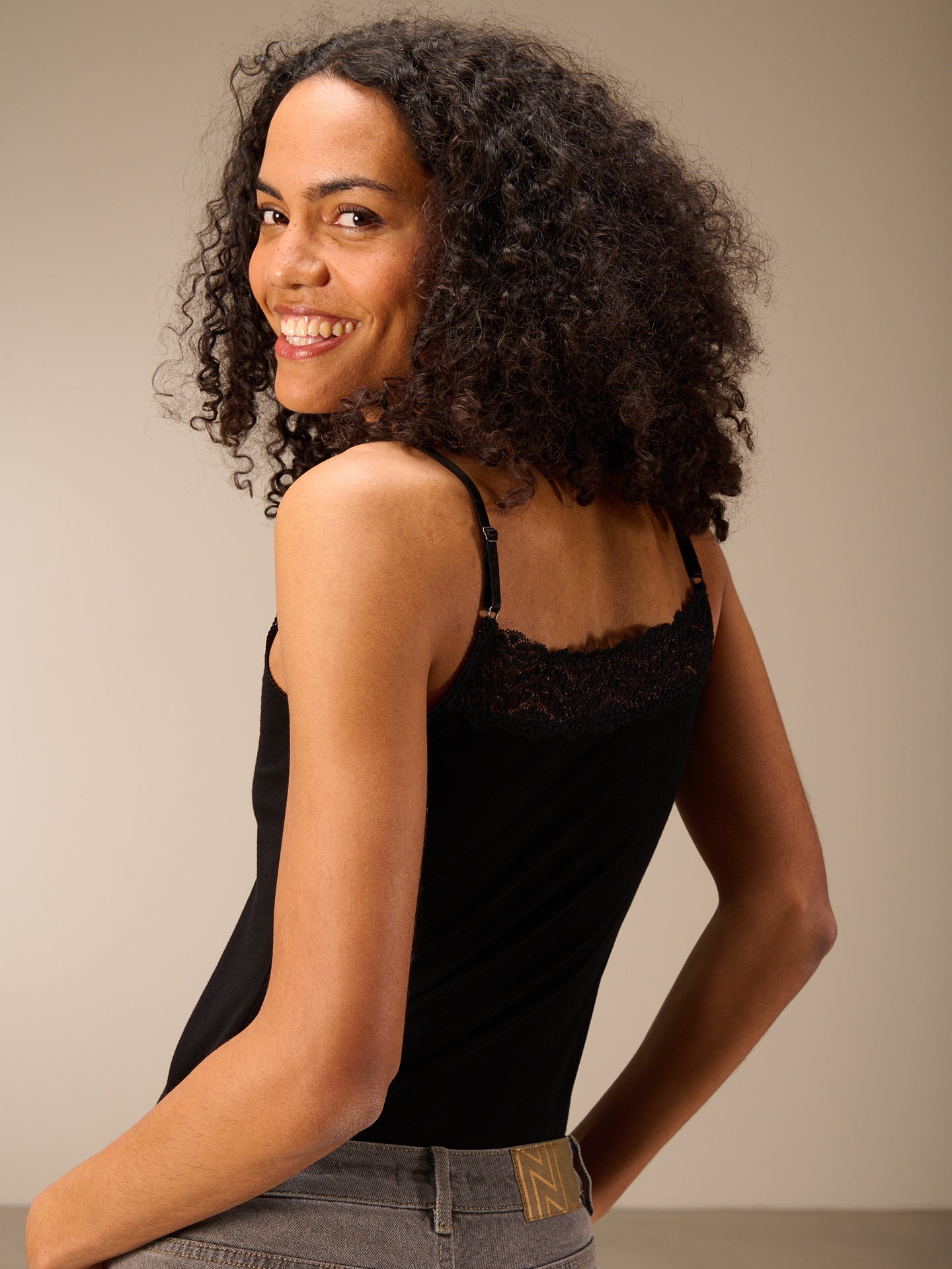 Top à bretelles près du corps avec bordure en dentelle réversible, pouvant être porté avec un col droit ou en V. Avec de laine pour plus de chaleur, c'est le top idéal pour l'hiver.