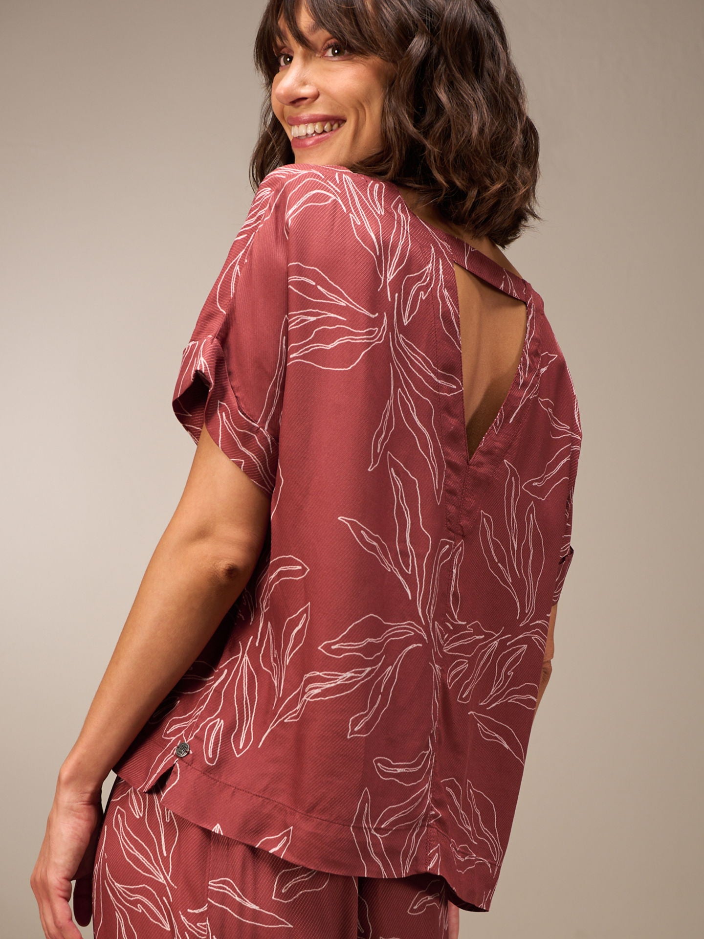 Camicetta a maniche corte opaca e aderente con scollo rotondo. I sofisticati dettagli sulla schiena e i piccoli spacchi nella cucitura laterale completano lo stile. L'aspetto leggero del crêpe crea una texture fluida e fine.
