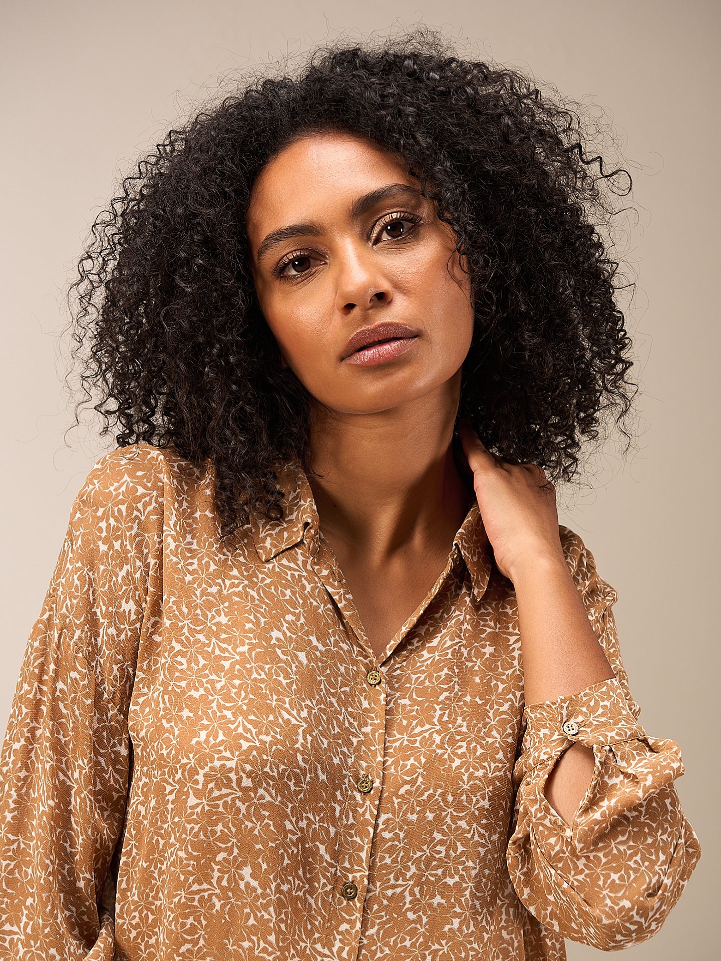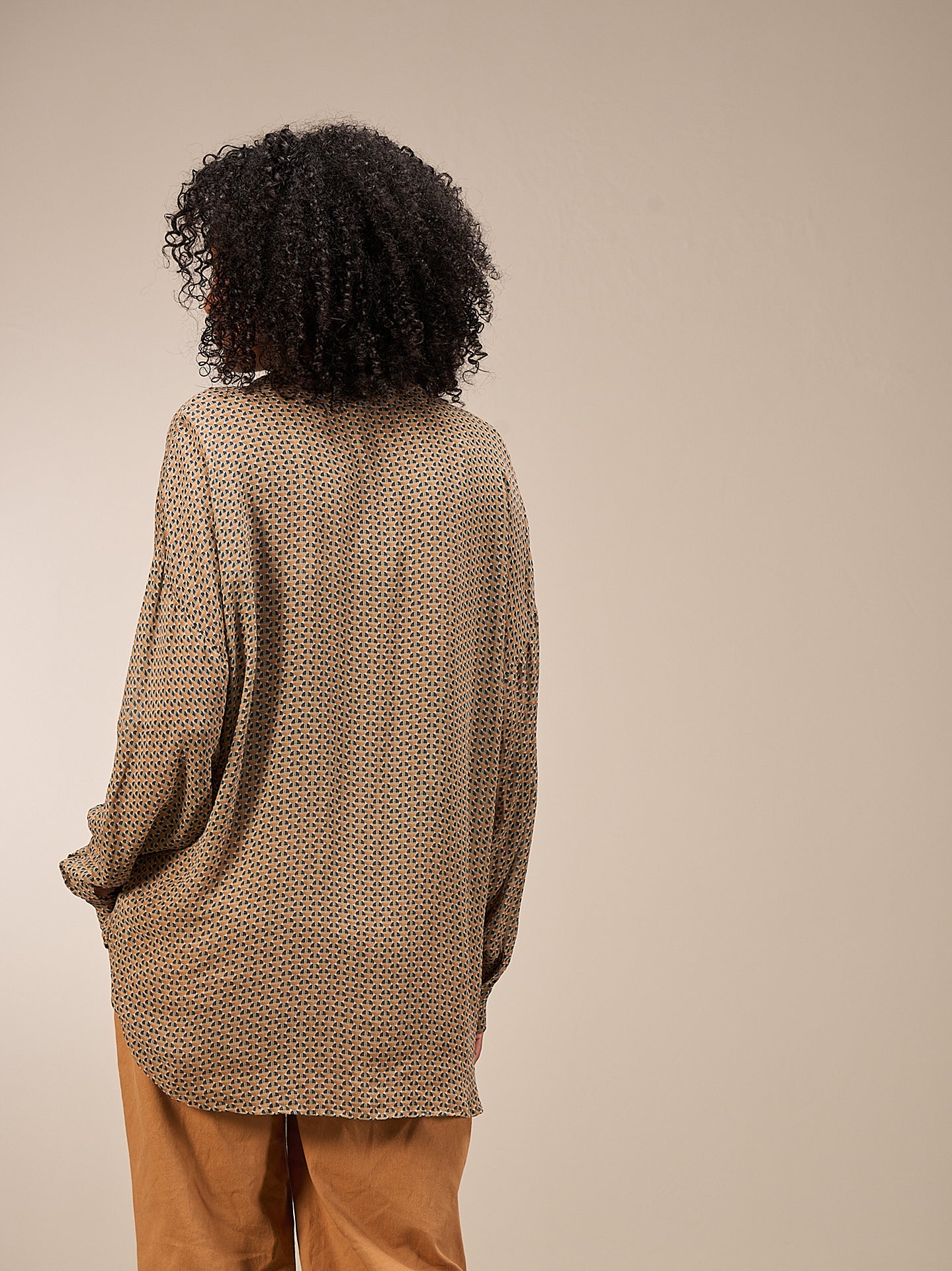 Camicia abbottonata dal taglio dritto e spalle scese. Le maniche lunghe sono dotate di un bottone sul polsino. La stampa all-over disegnata a mano completa il look della camicia. Realizzata in viscosa ecologica al 100%, ottenuta da silvicoltura sostenibile.