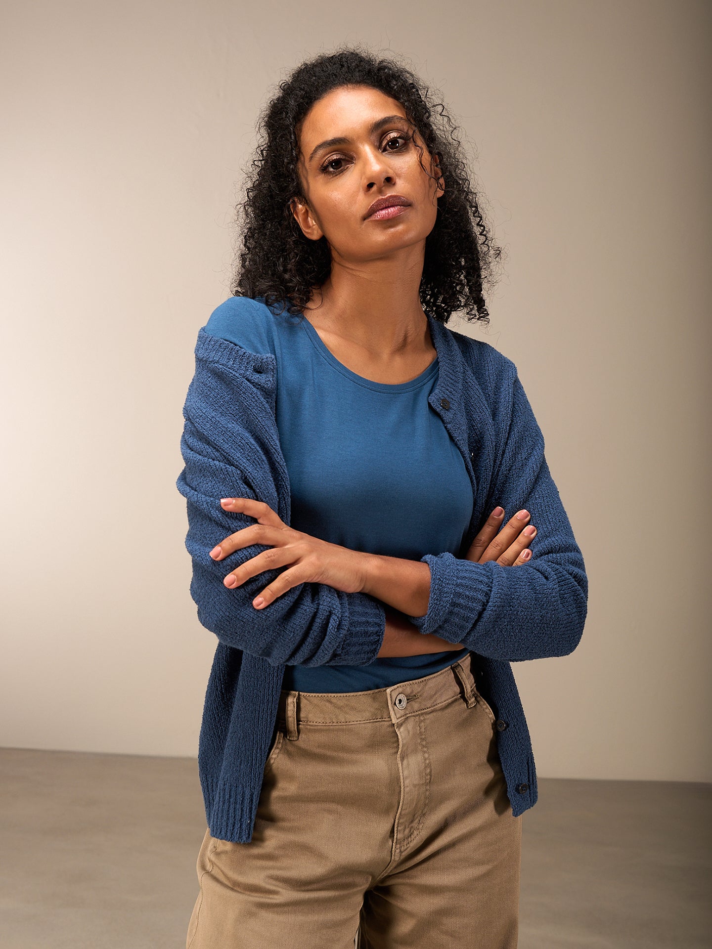 Giacca dal taglio morbido in speciale filato bouclé soffice con scollo rotondo e spalle leggermente scese. Il bordo a costine su maniche e orlo e i pregiati bottoni in metallo completano la giacca.