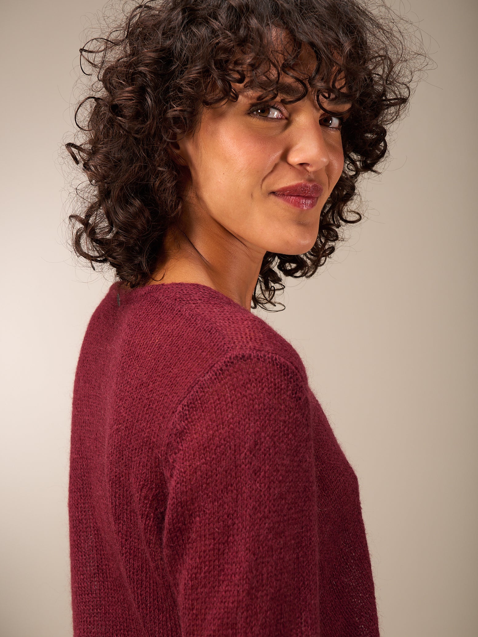 Cardigan sciolto con spalle strette e scollo a V in una fantasia leggermente trasparente e semitrasparente, chiuso con bottoni ad occhiello in madreperla di alta qualità.
