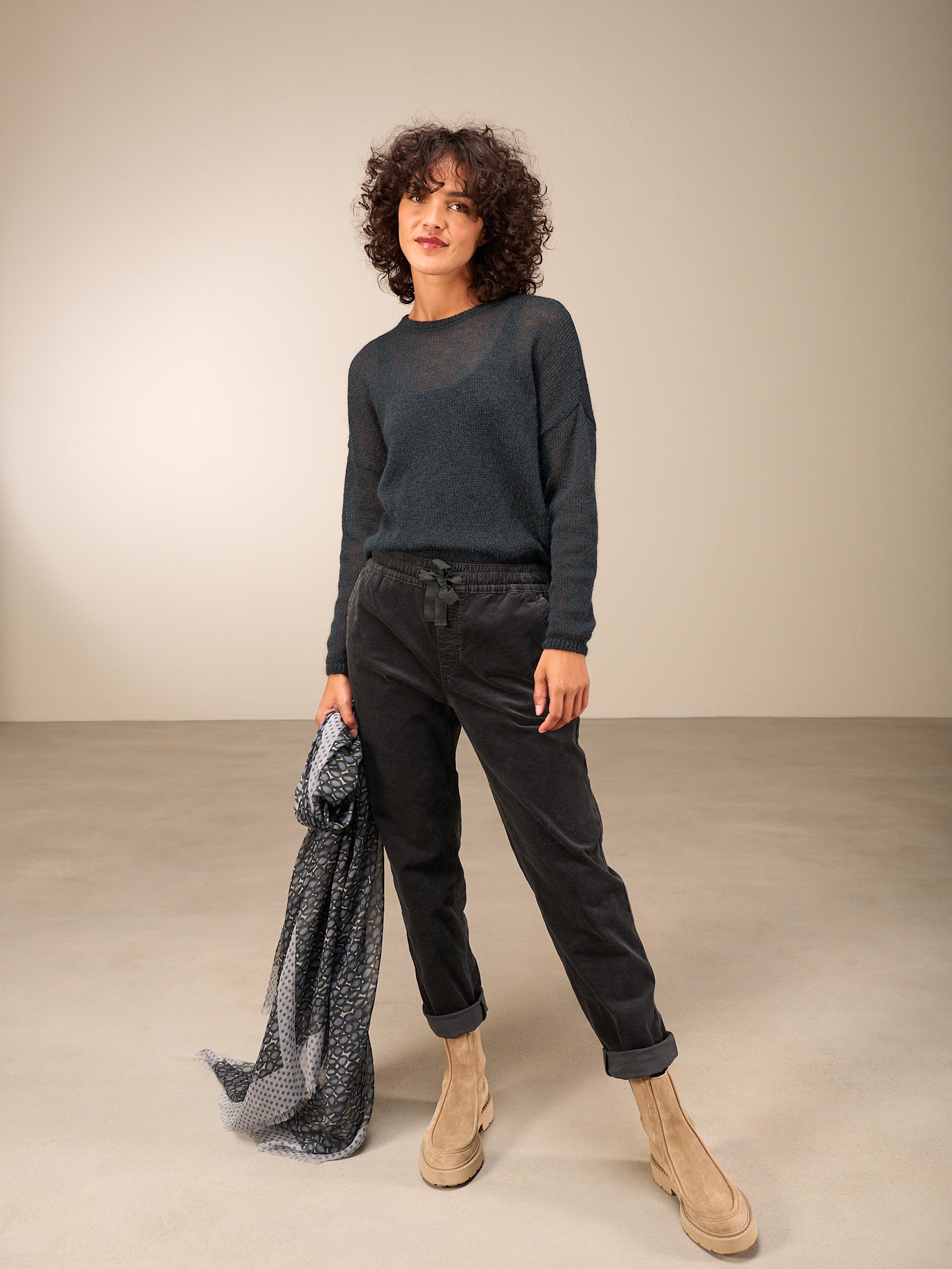 Pantaloni casual e sportivi in morbido velluto a coste longitudinali, vita elastica a vita media con coulisse, orlo arrotolato e tasche applicate sul retro.