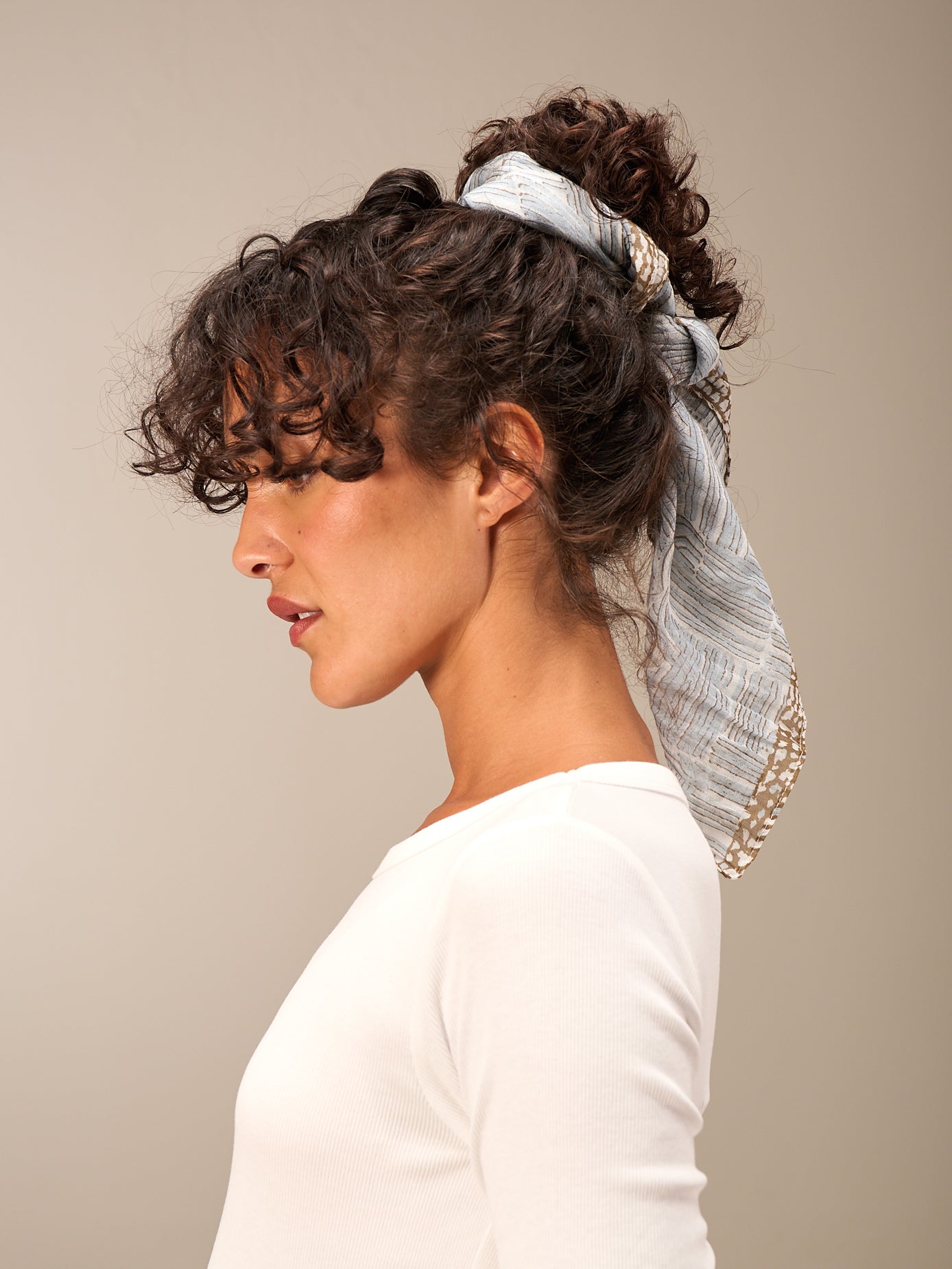 Sciarpa quadrata di tendenza con stampa all-over e bordi trapuntati nel formato 90x90 cm.
