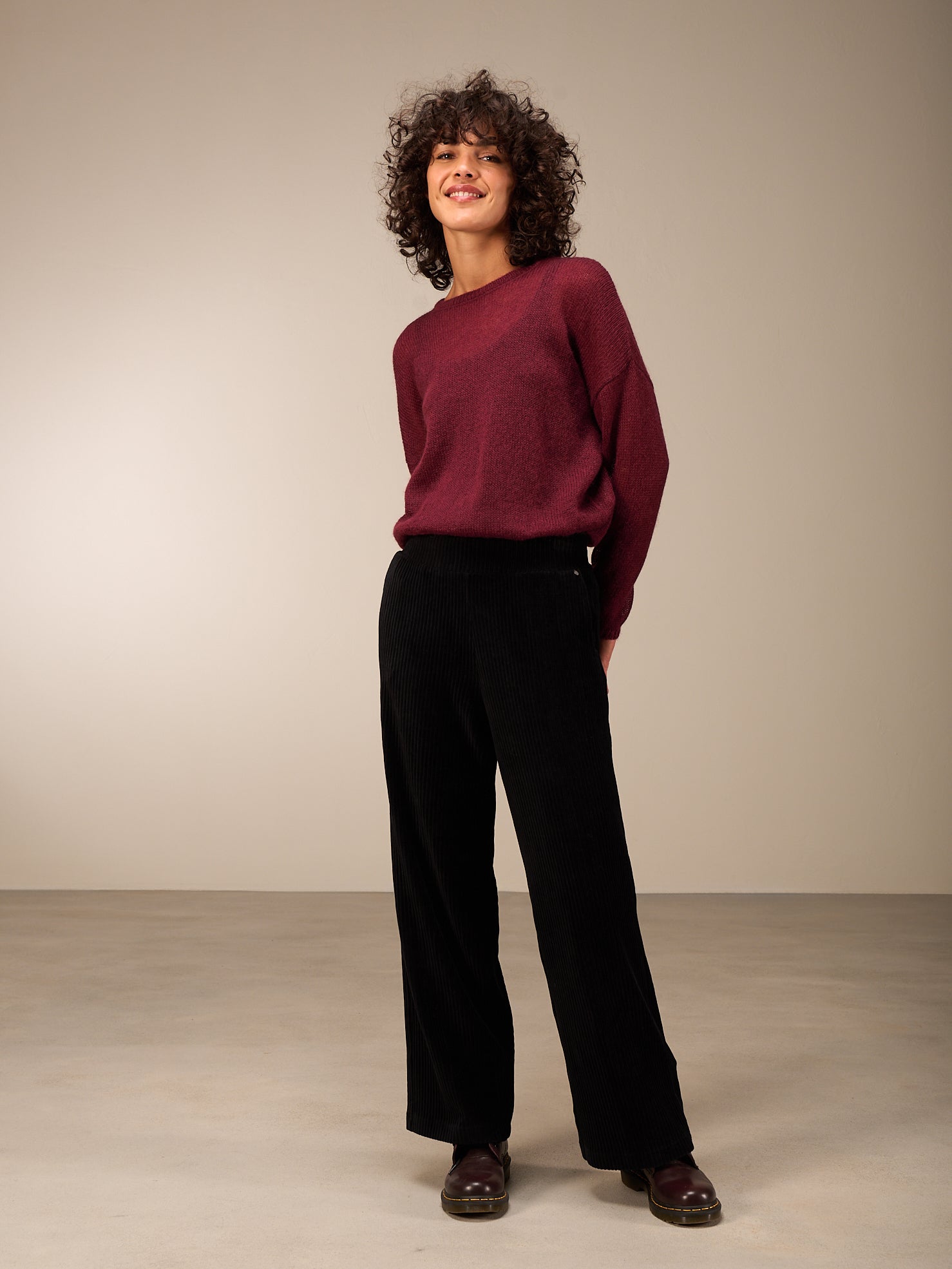 Pantaloni aderenti con gamba ampia e dritta, tasche oblique a fessura e vita ampia ed elastica in morbido tessuto di corda elasticizzato. Le irregolarità del colore rendono il capo unico. L'effetto sbiadito è intensificato.