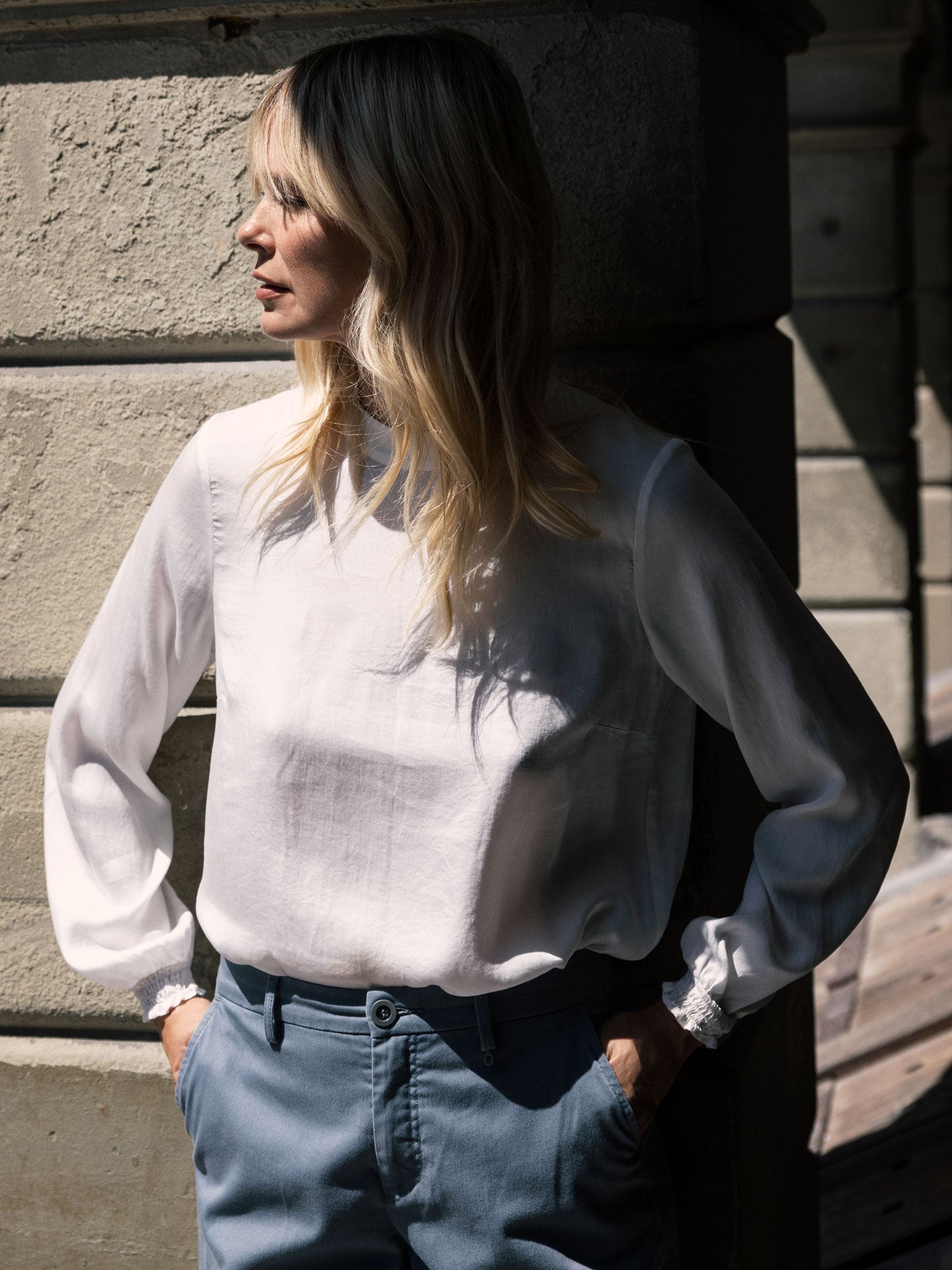 Camicetta elegante e morbida con maniche lunghe, bordi elasticizzati e arricciati sui polsini e piccolo collo alto: discreta e raffinata, perfetta per le occasioni speciali.