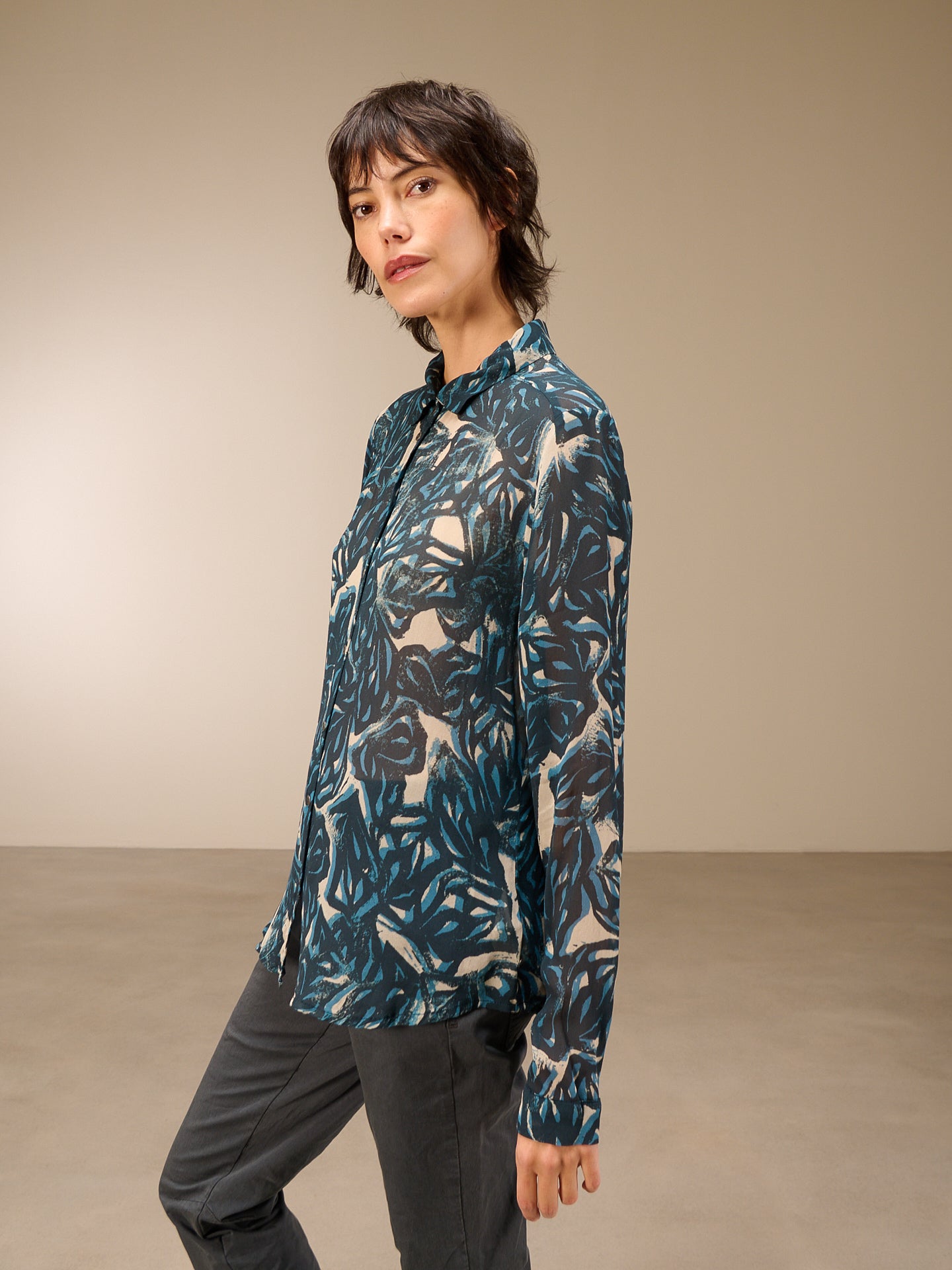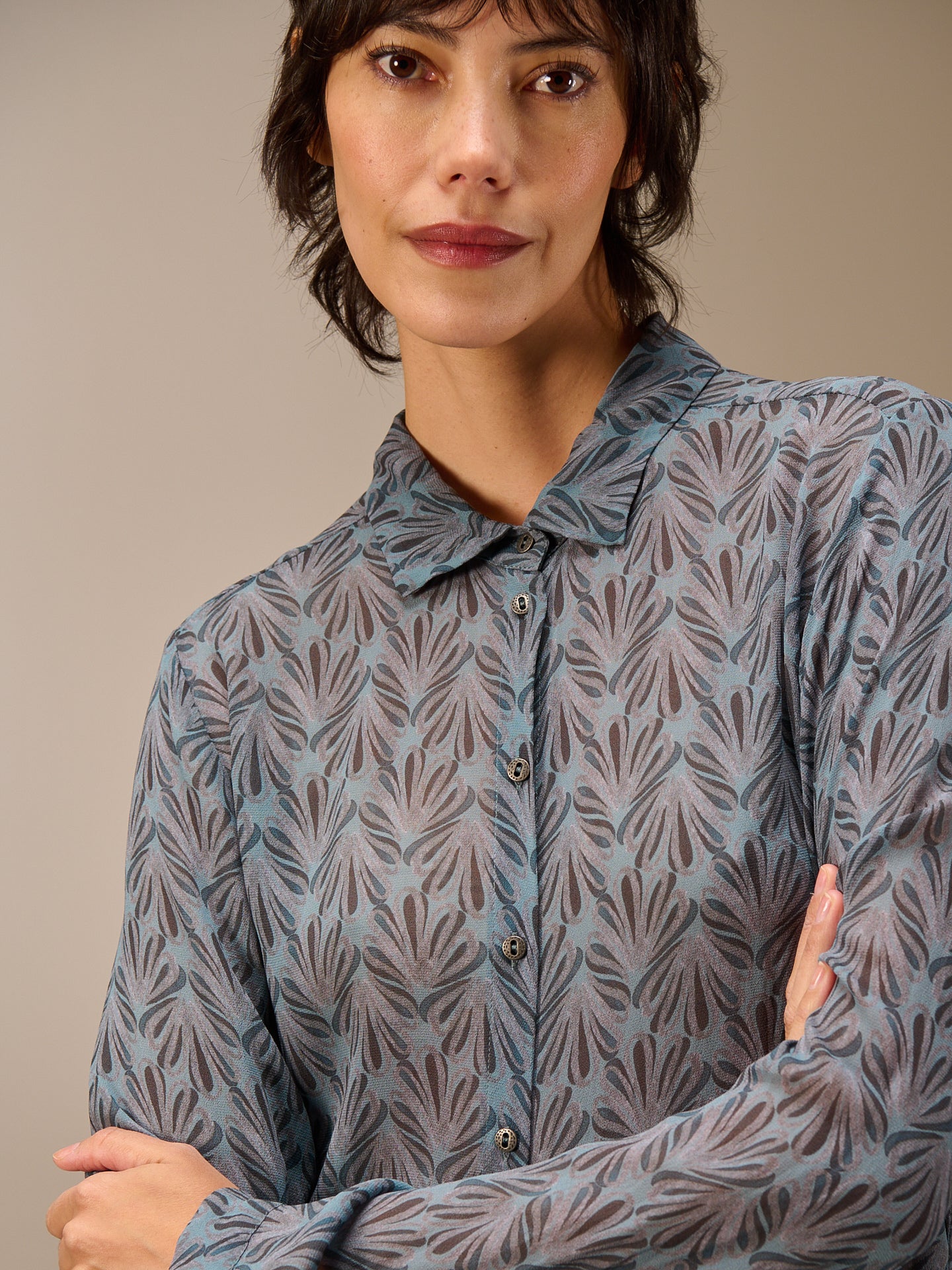 Camicetta con colletto abbottonato, vestibilità aderente, orlo leggermente arrotondato, abbottonatura nascosta e maniche lunghe con polsini, realizzata nel popolare tessuto chiffon con stampa all-over disegnata a mano.